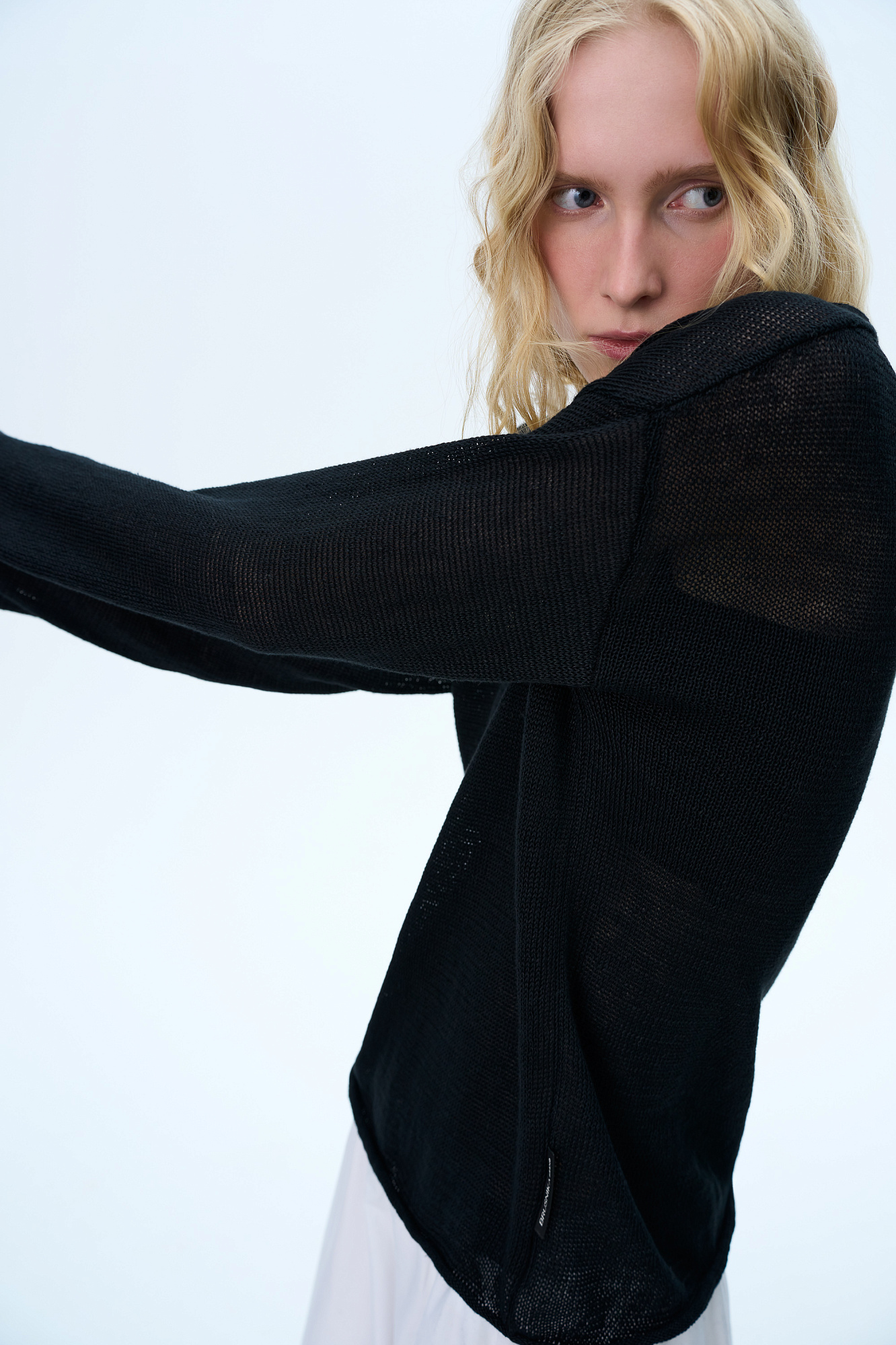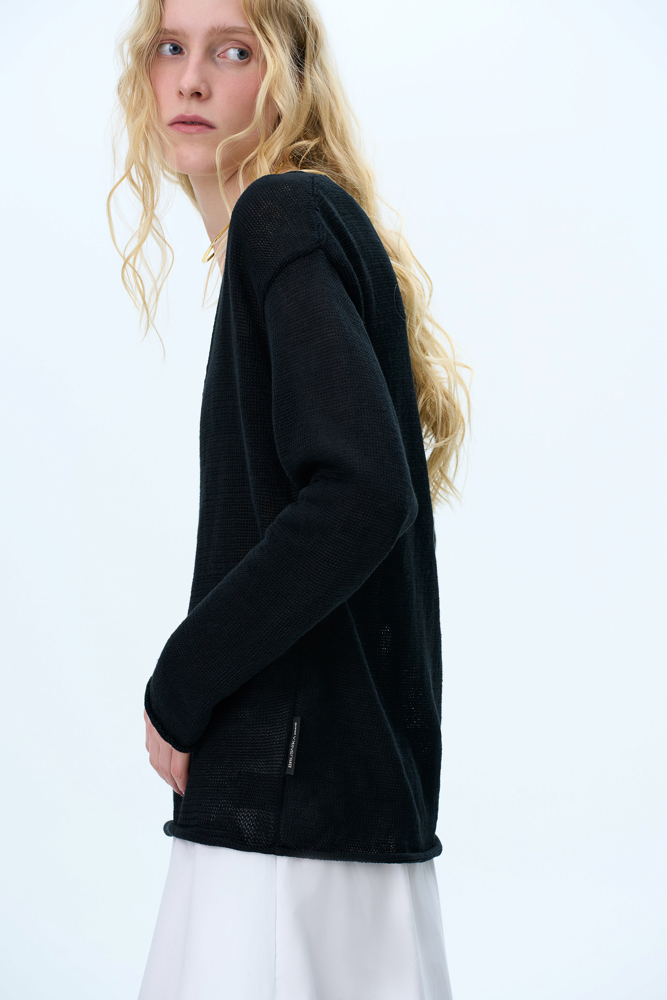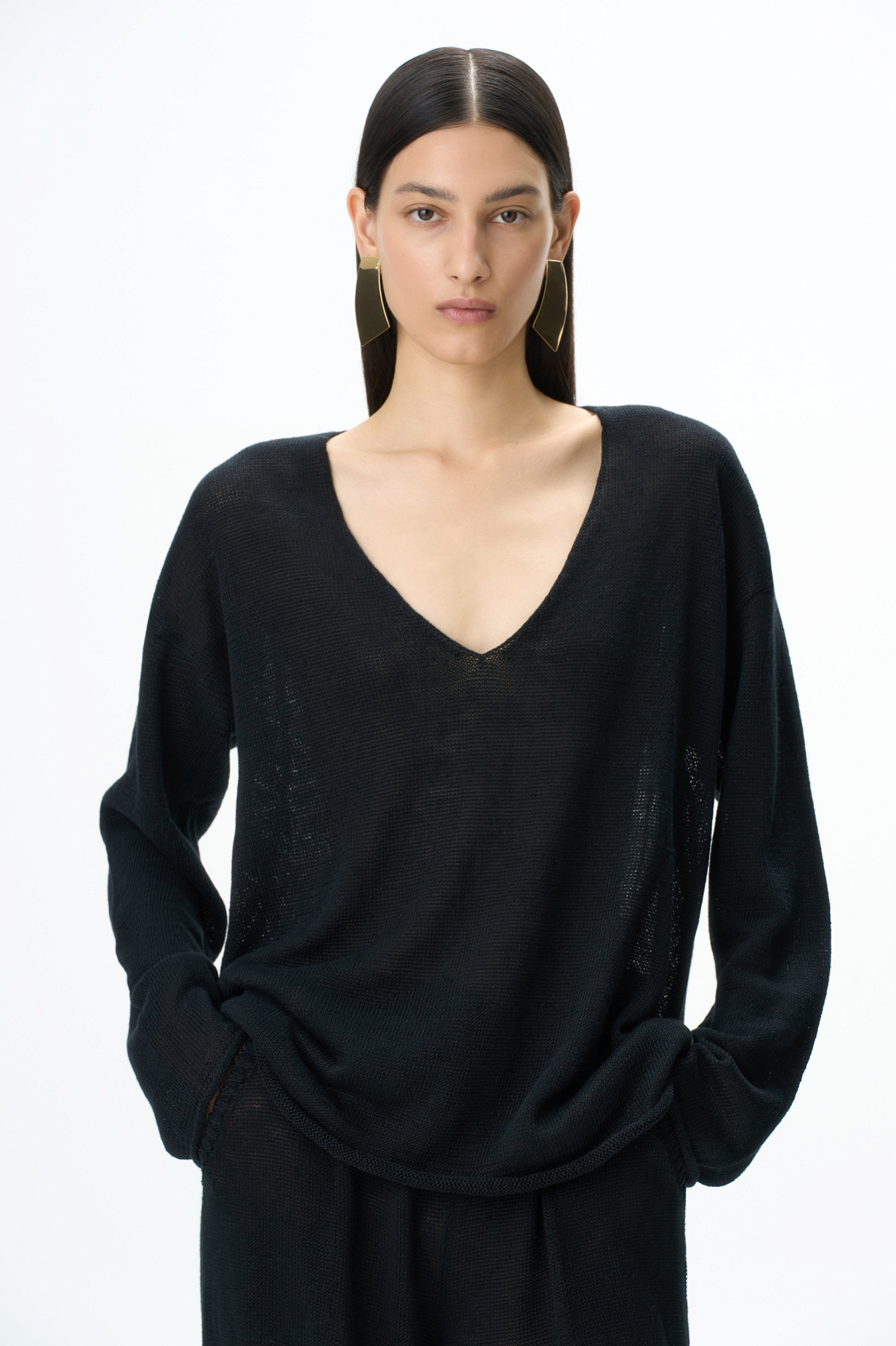 Трикотажный джемпер из 100% льна. Модель свободного силуэта с длинным рукавом и с V-образным вырезом горловины. Изделие декорировано брендированным ярлыком сбоку и валиками по низу.