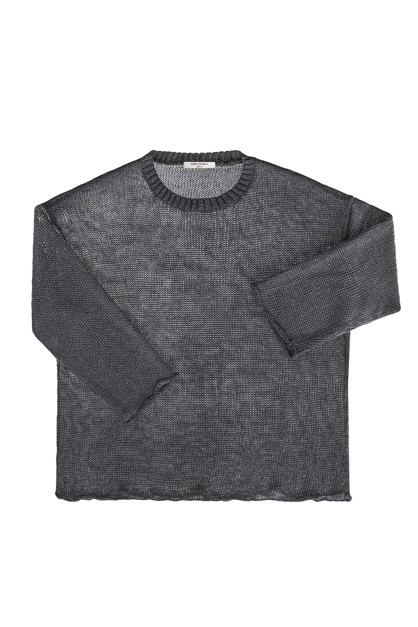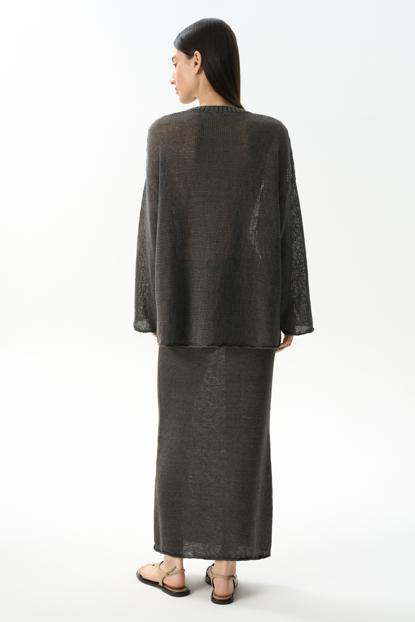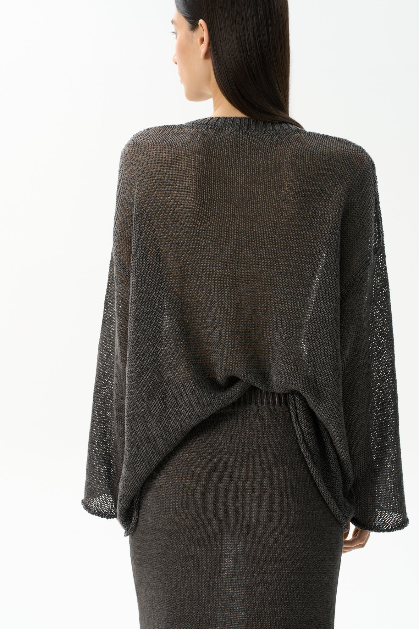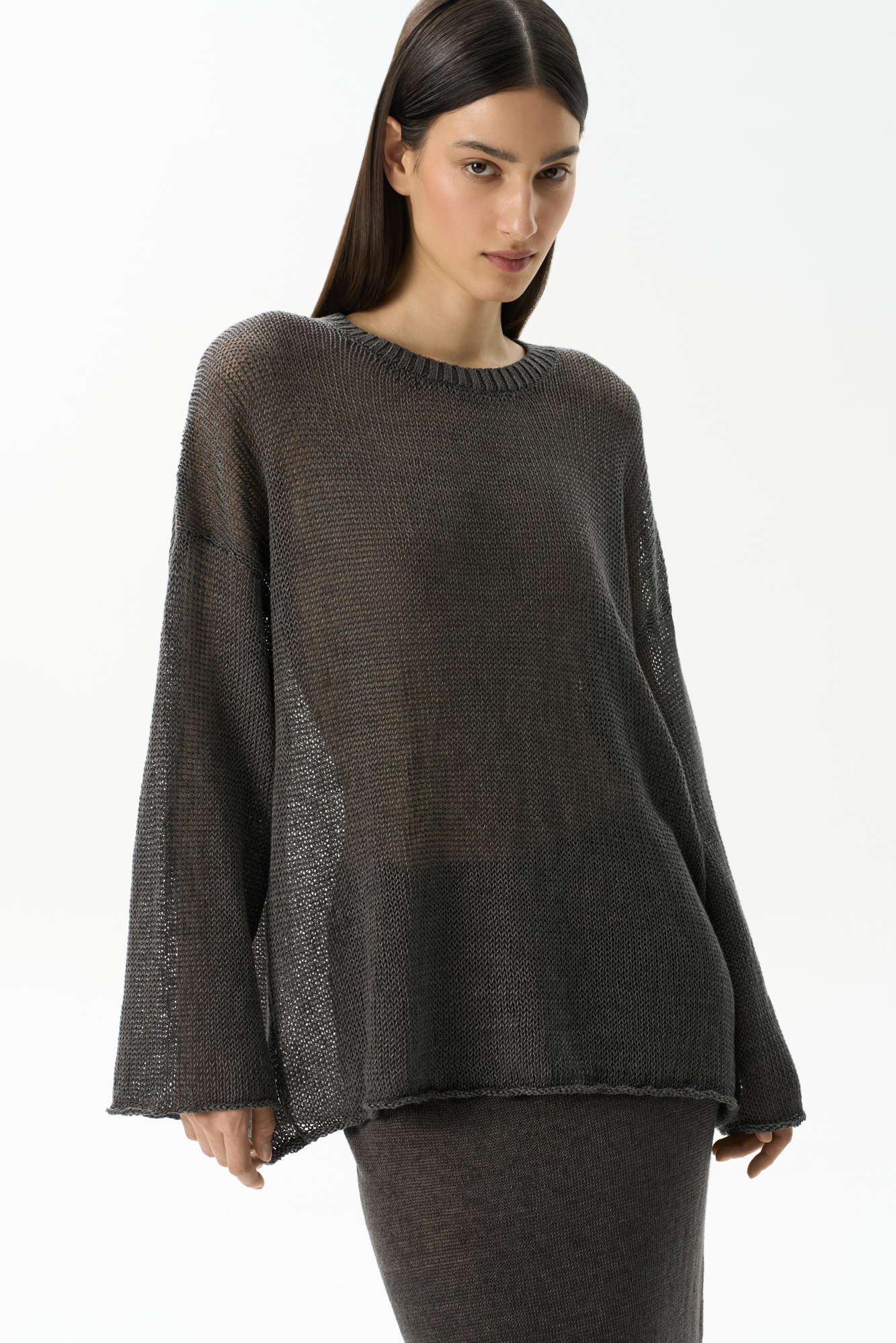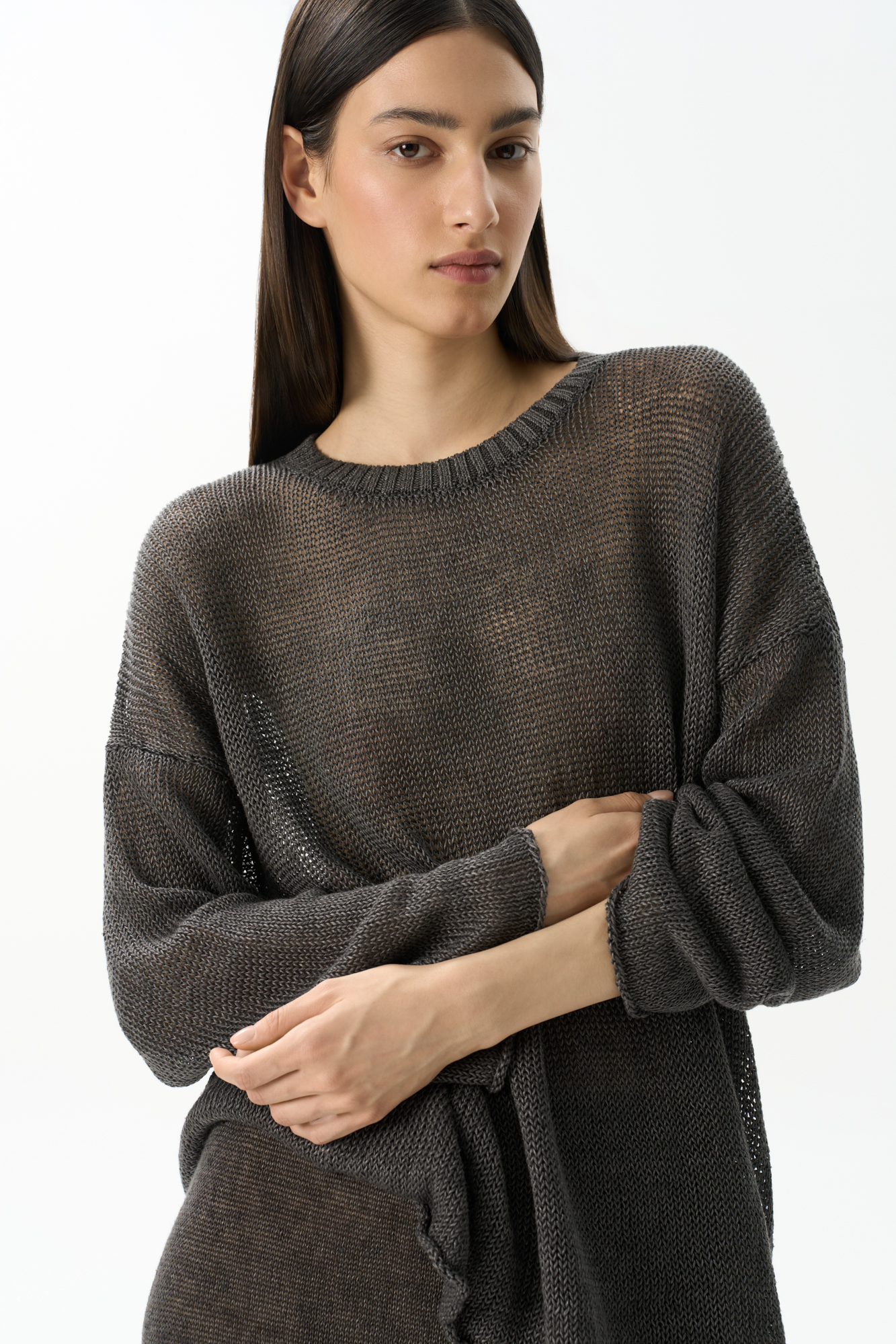 Полупрозрачный джемпер из 100% льна. Модель свободного силуэта со спущенной линией плеча и круглым вырезом горловины.