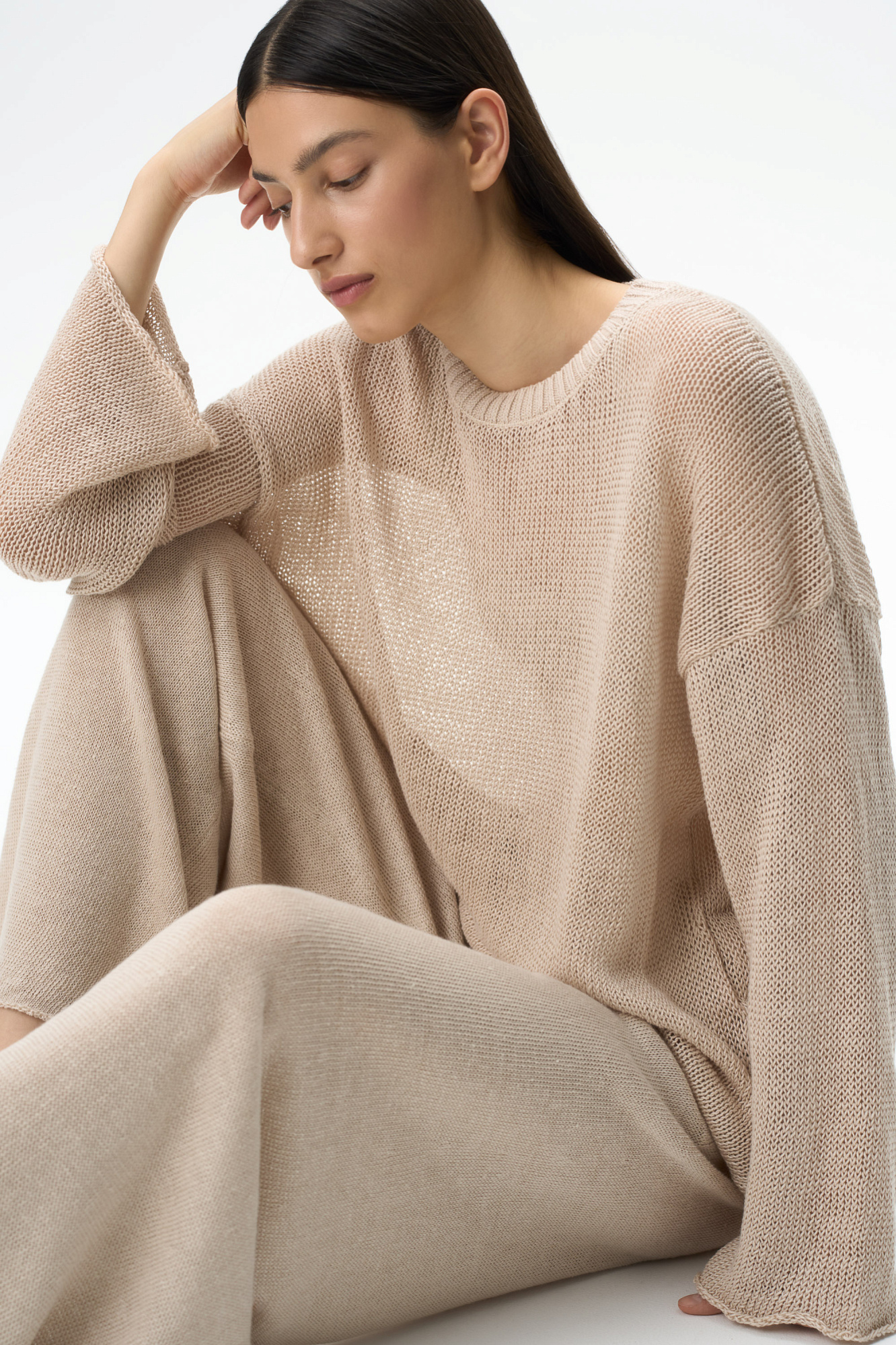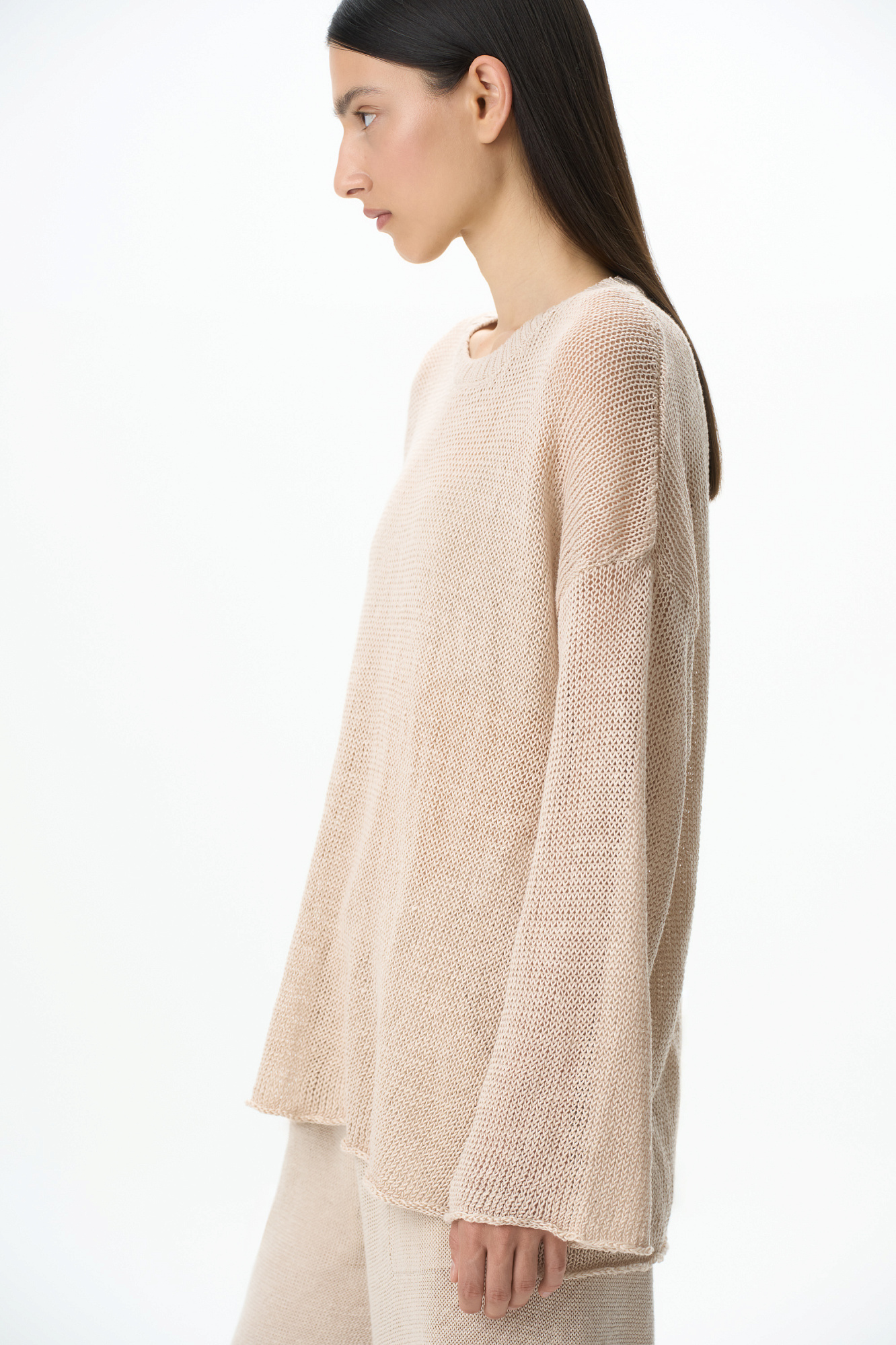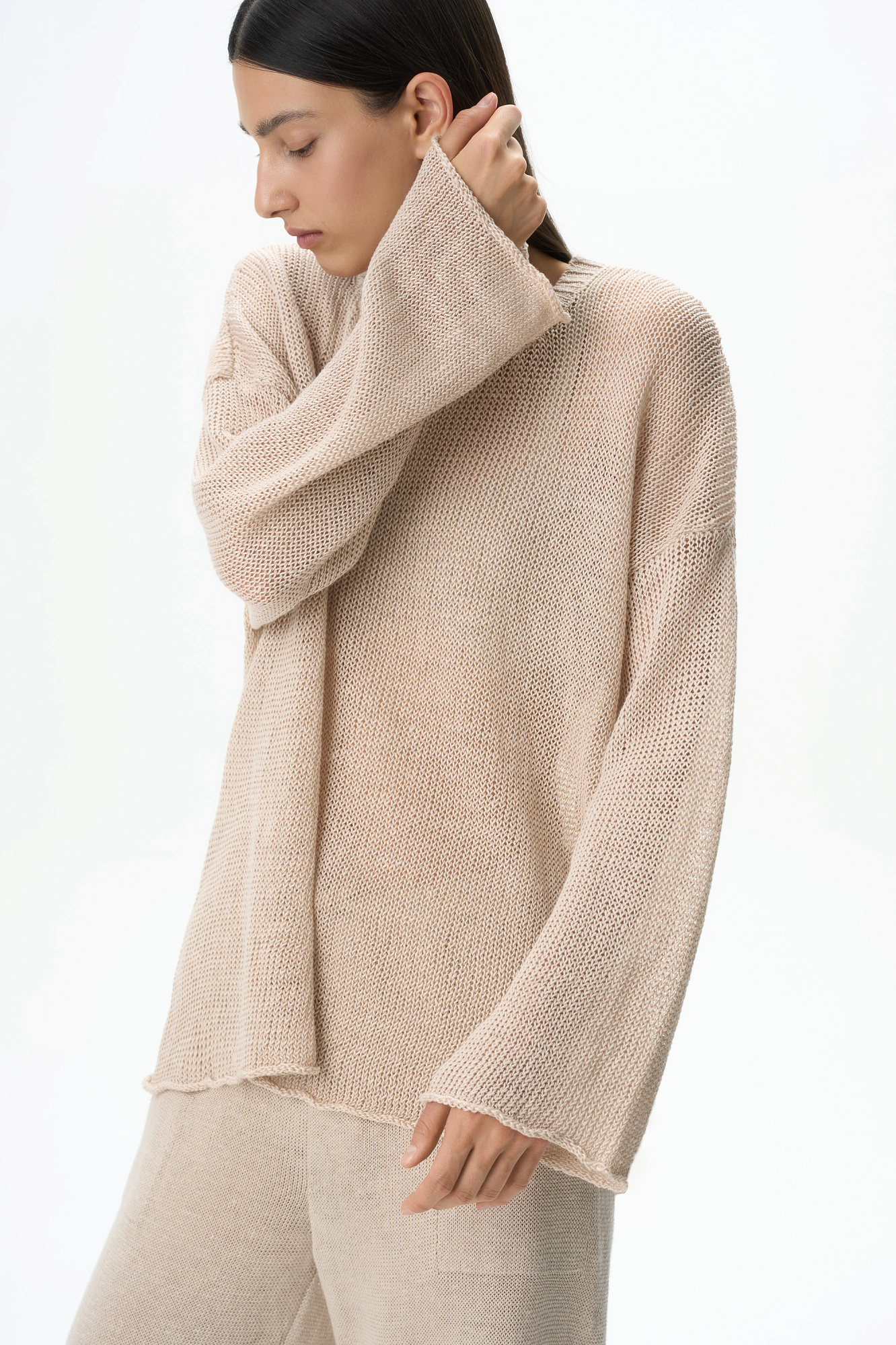 Полупрозрачный джемпер из 100% льна. Модель свободного силуэта со спущенной линией плеча и круглым вырезом горловины.