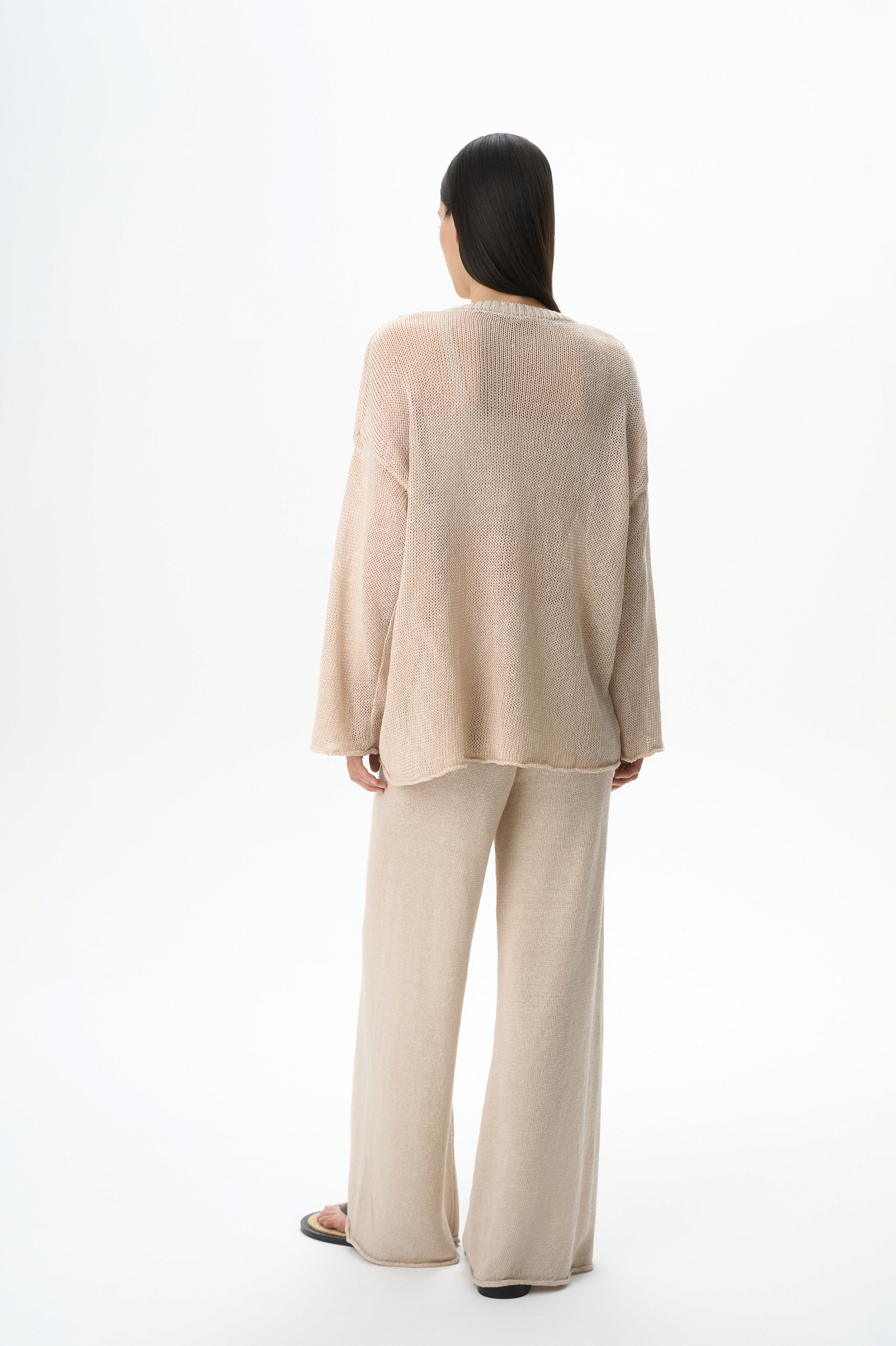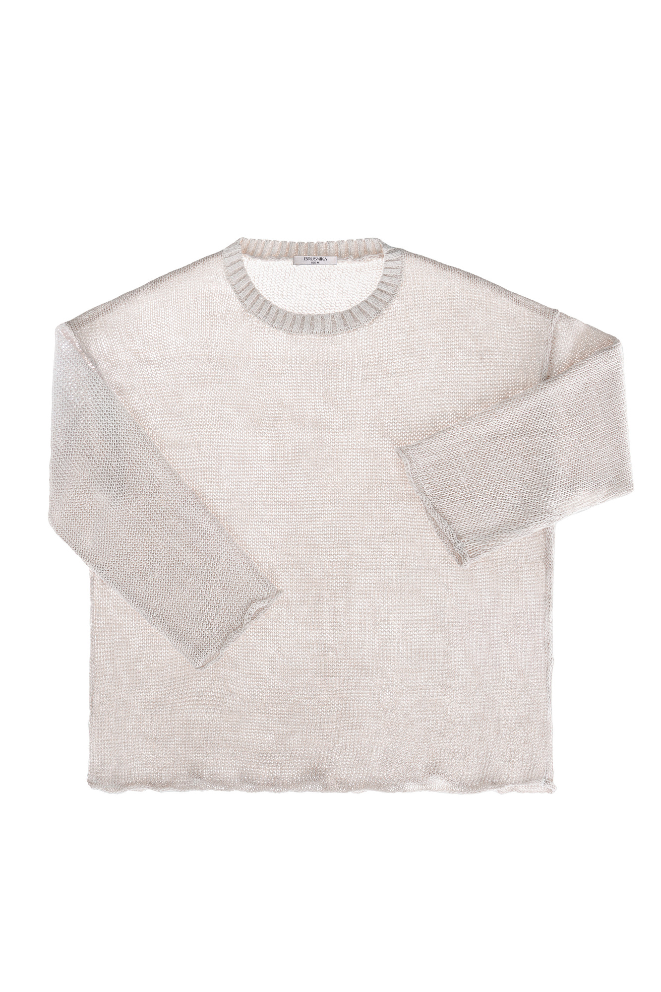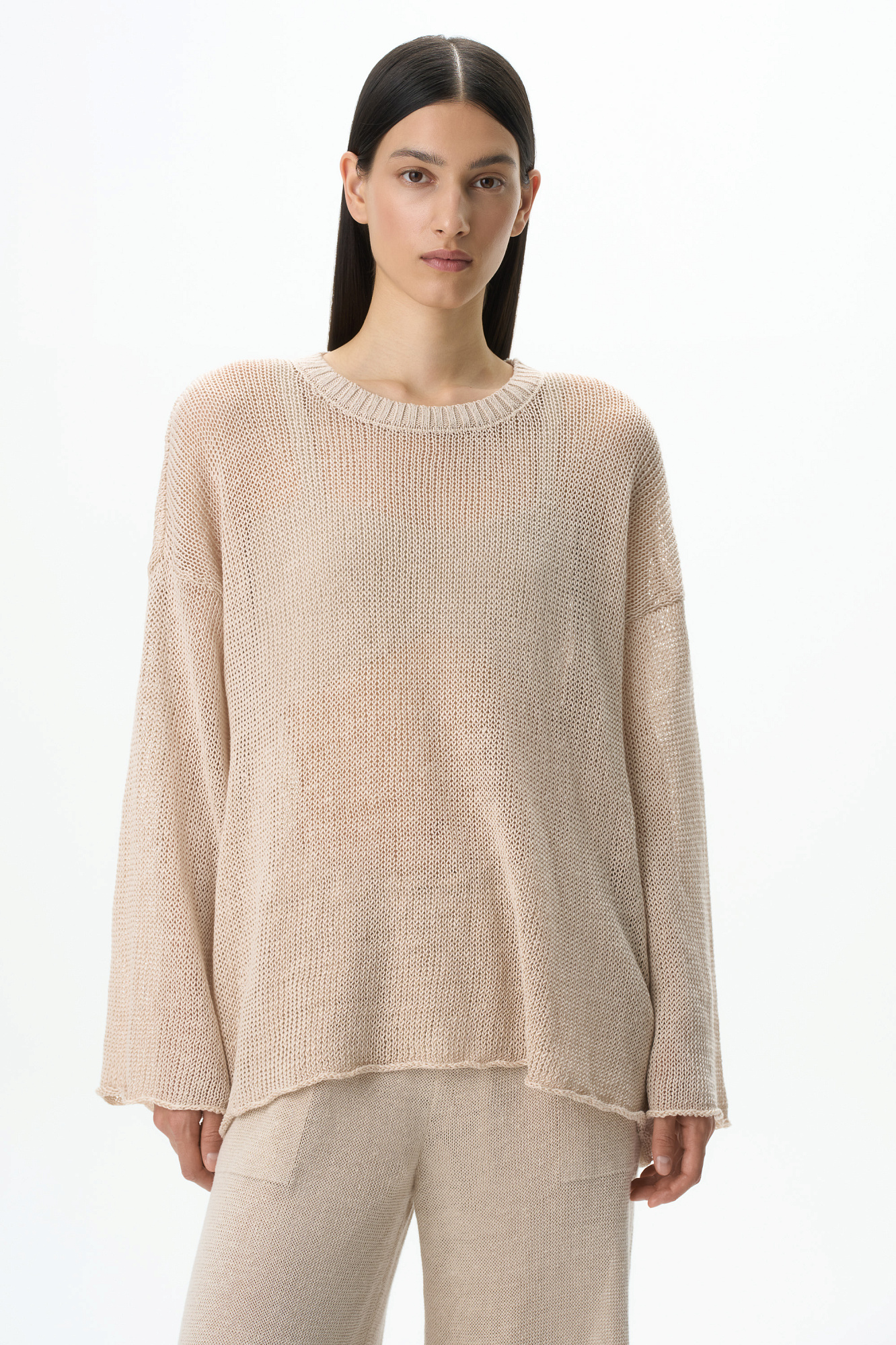 Полупрозрачный джемпер из 100% льна. Модель свободного силуэта со спущенной линией плеча и круглым вырезом горловины.