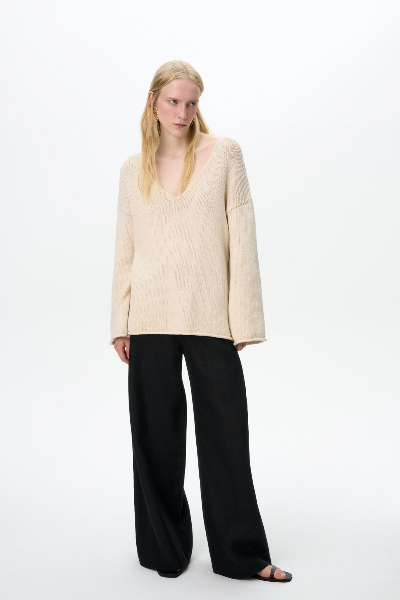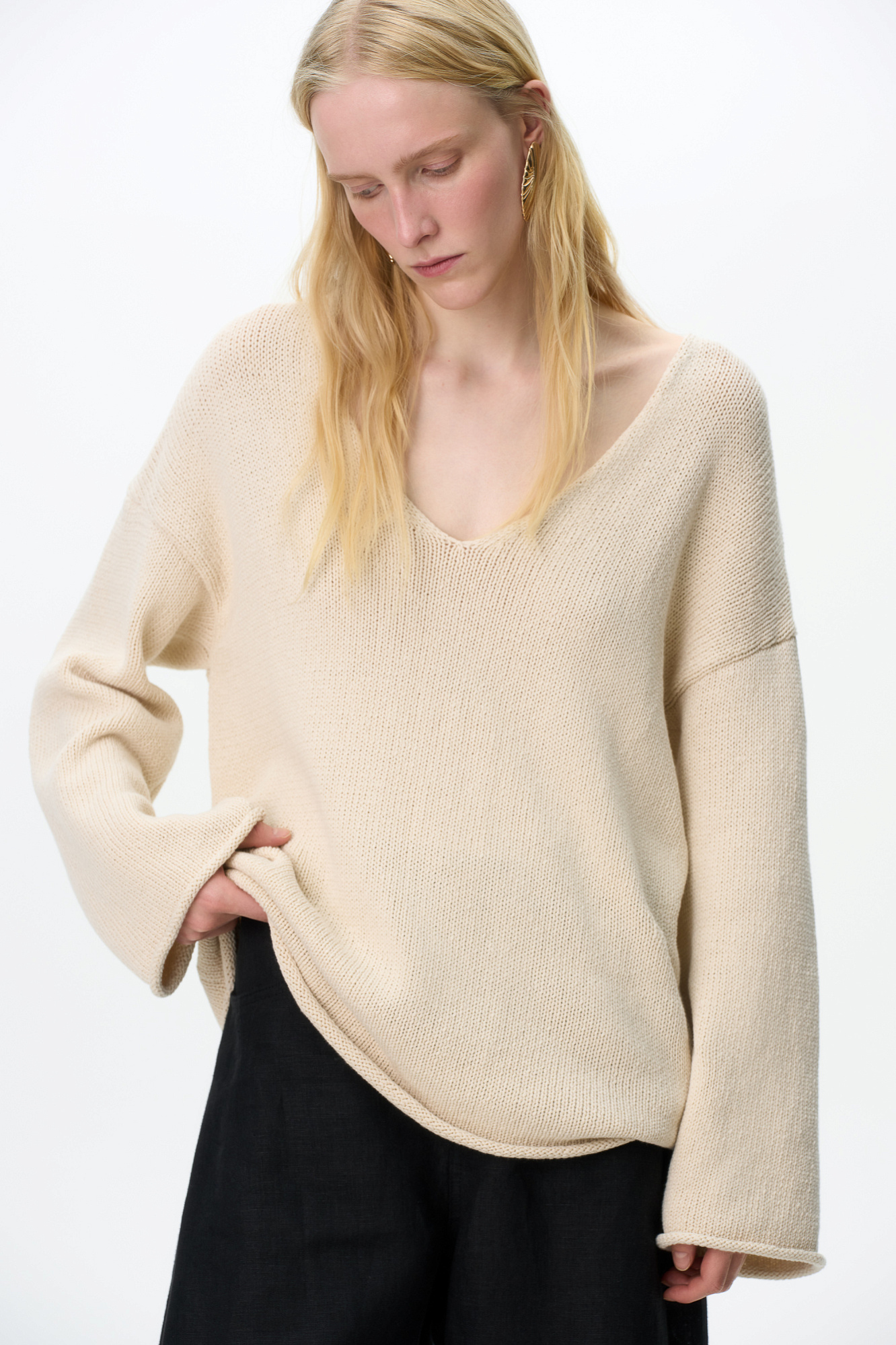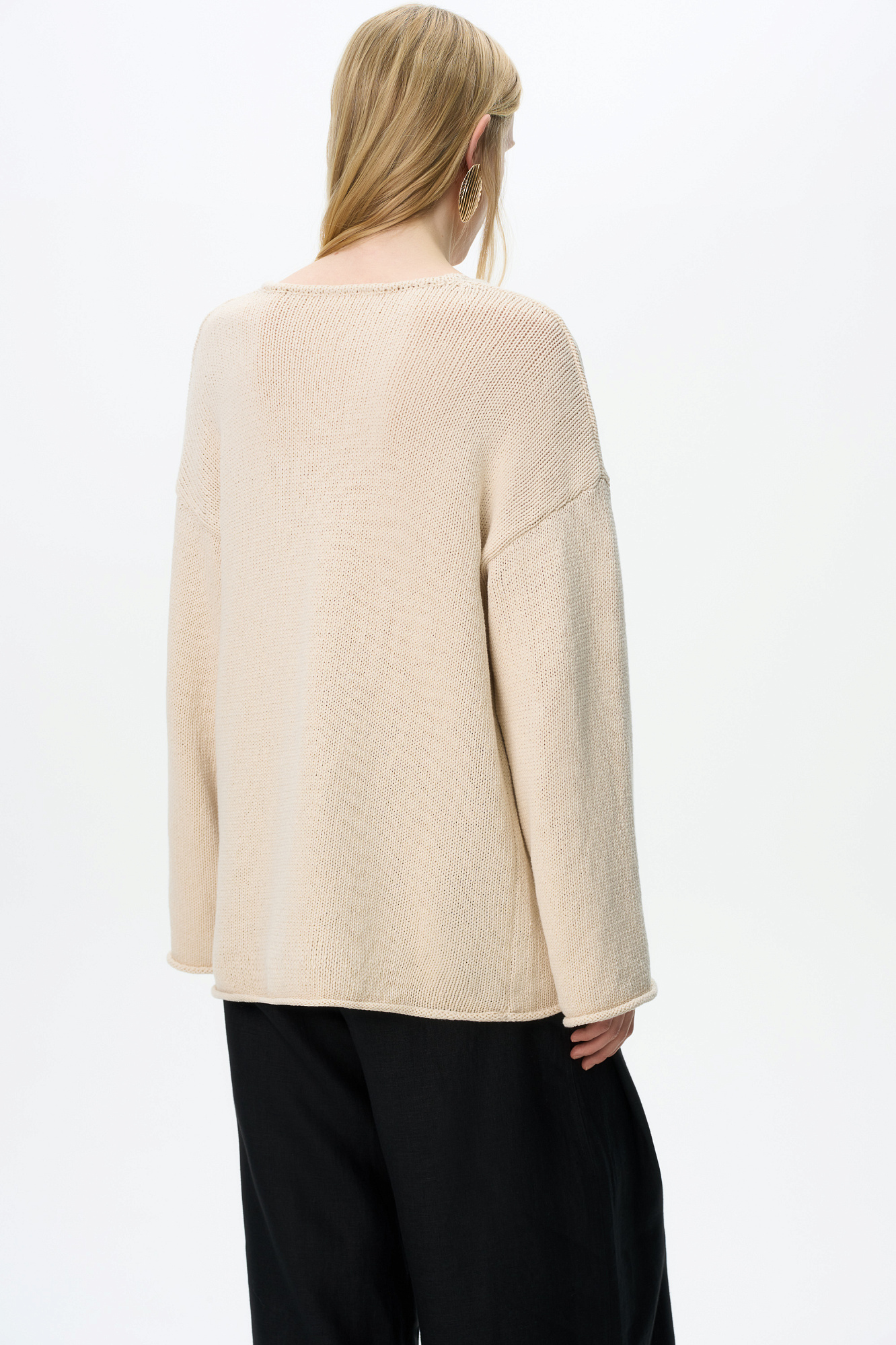 Трикотажный джемпер с V-образным вырезом. Модель свободного силуэта со спущенной линией плеча.