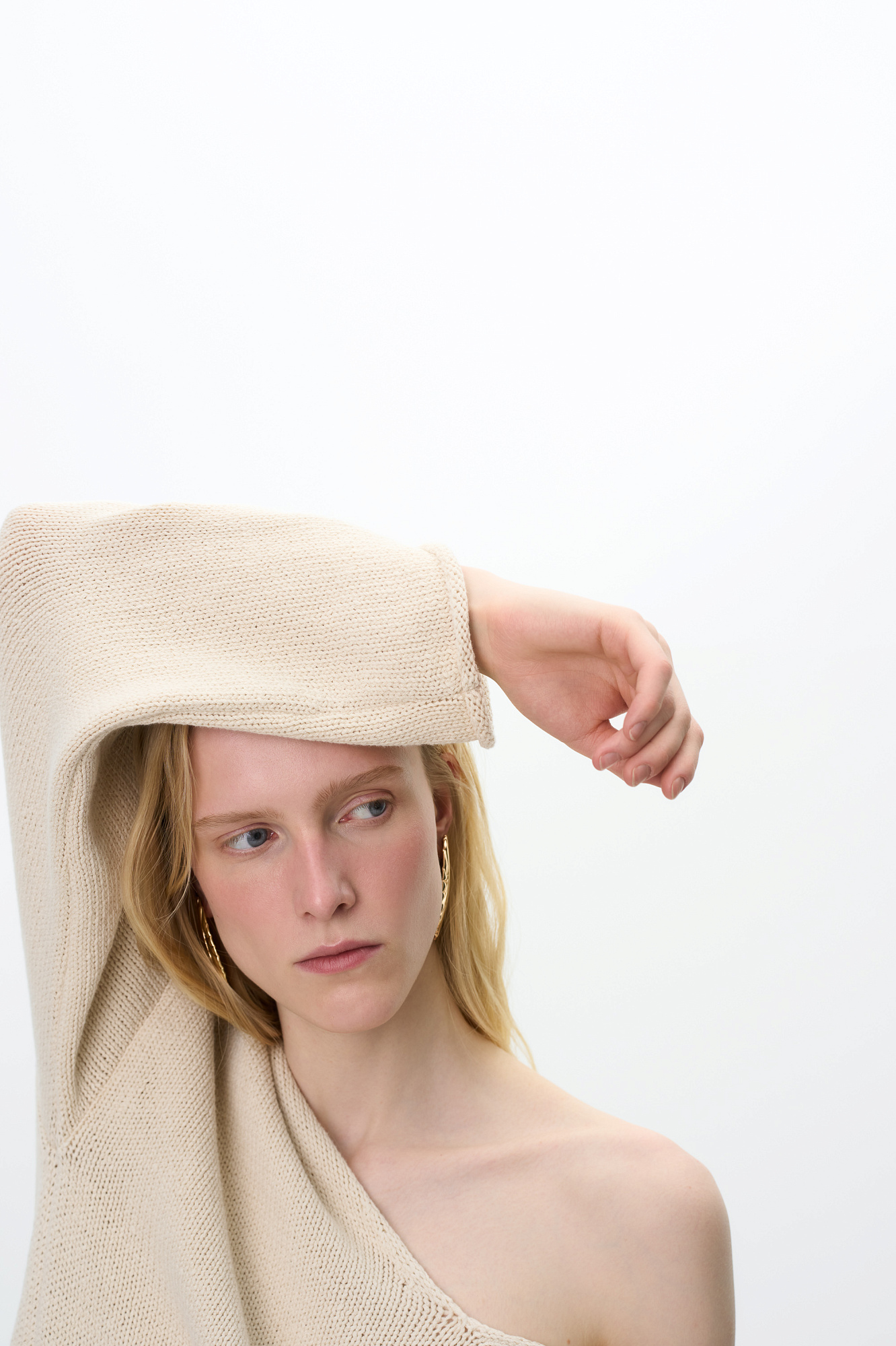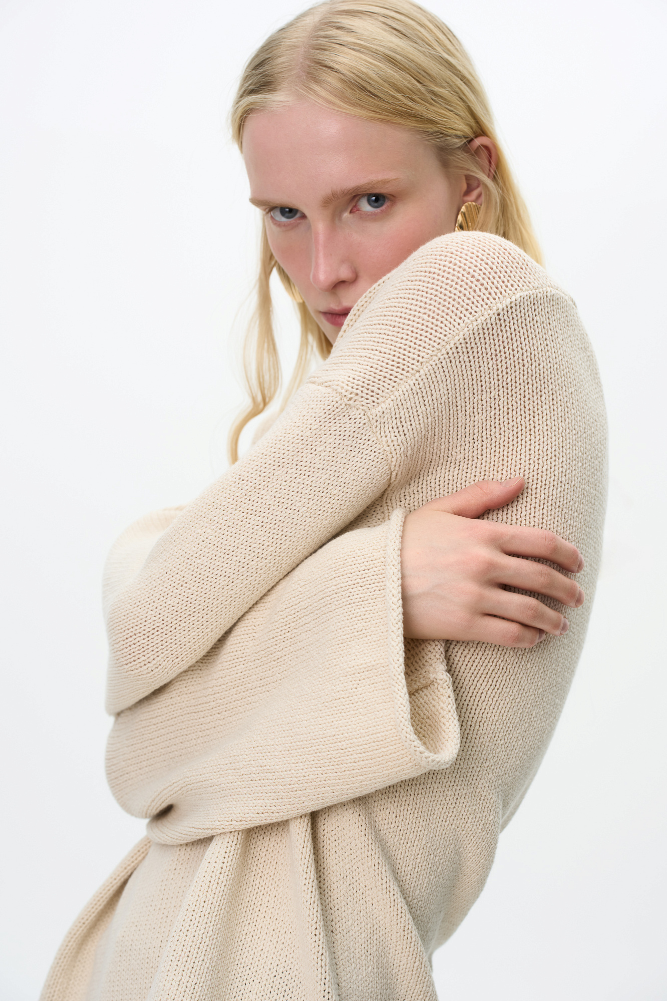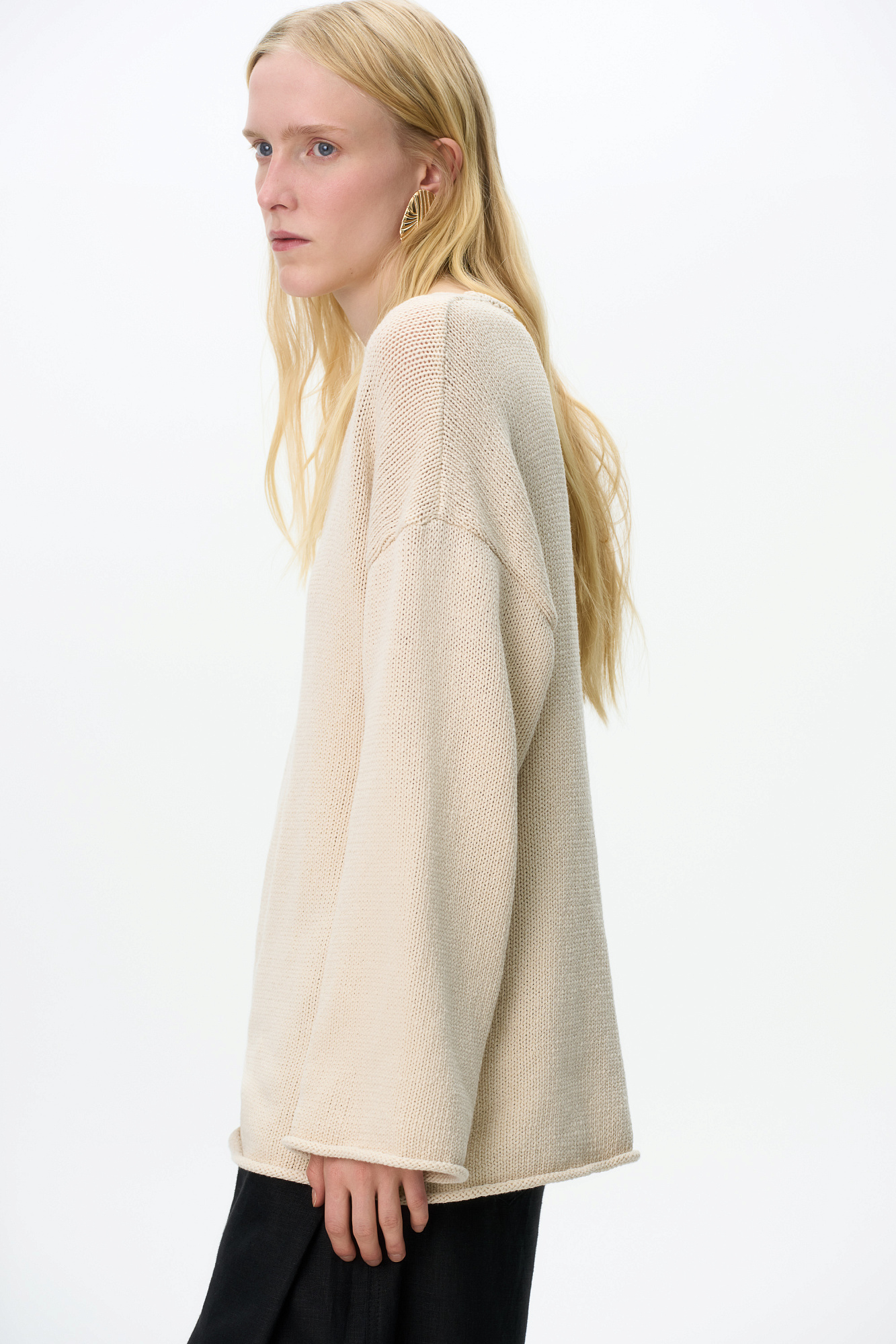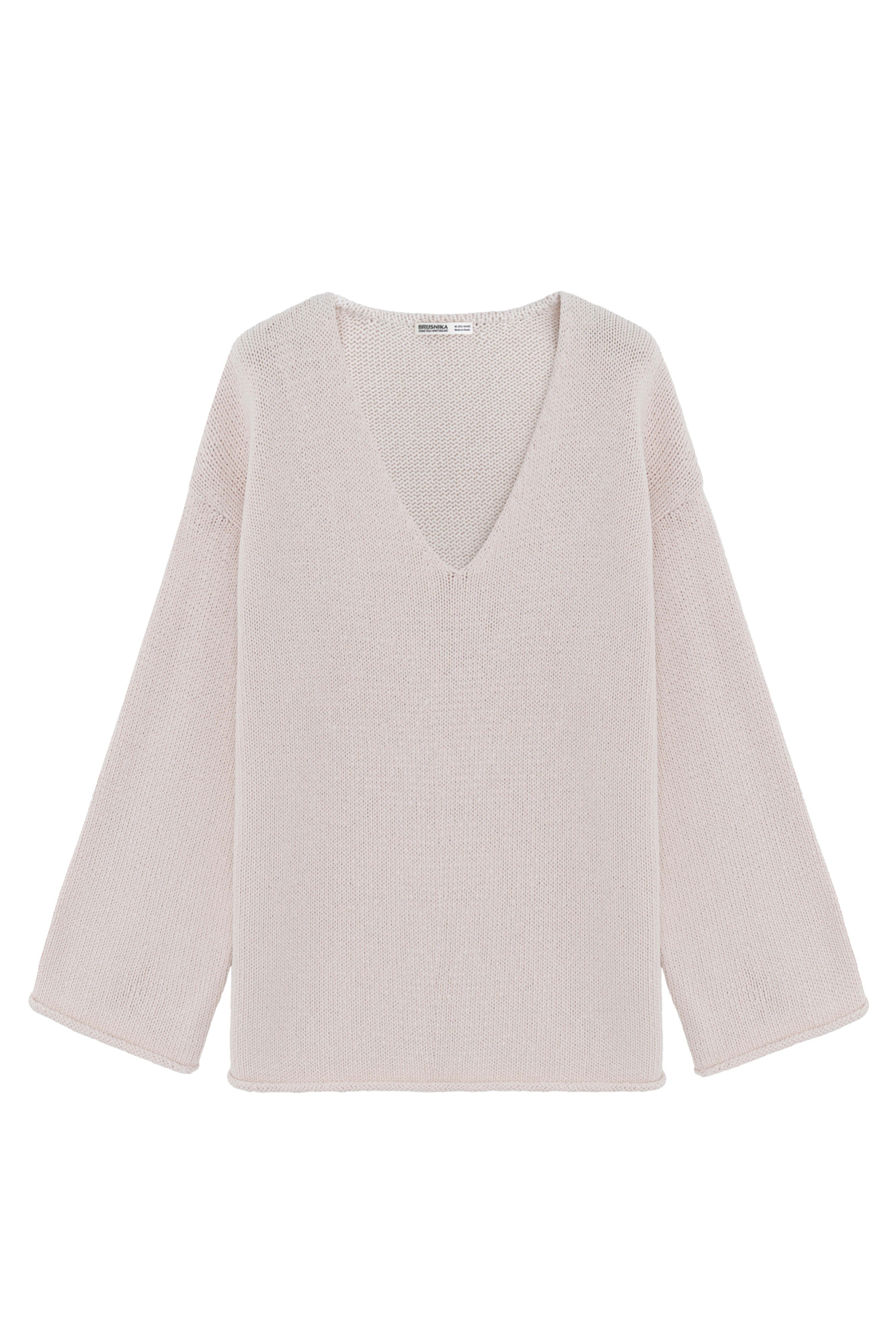 Трикотажный джемпер с V-образным вырезом. Модель свободного силуэта со спущенной линией плеча.