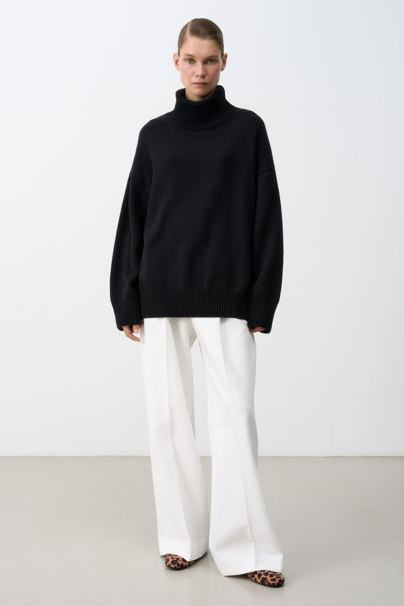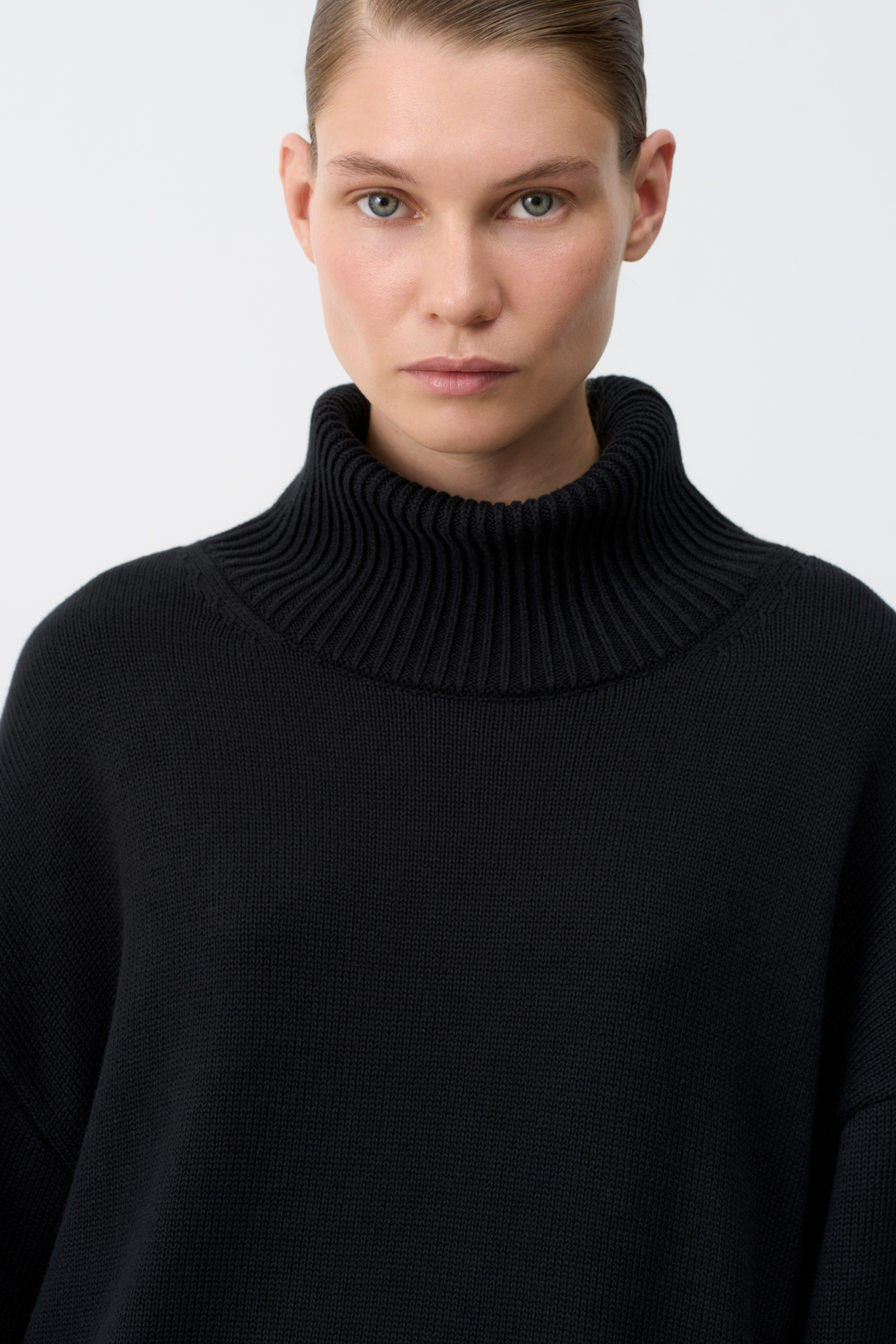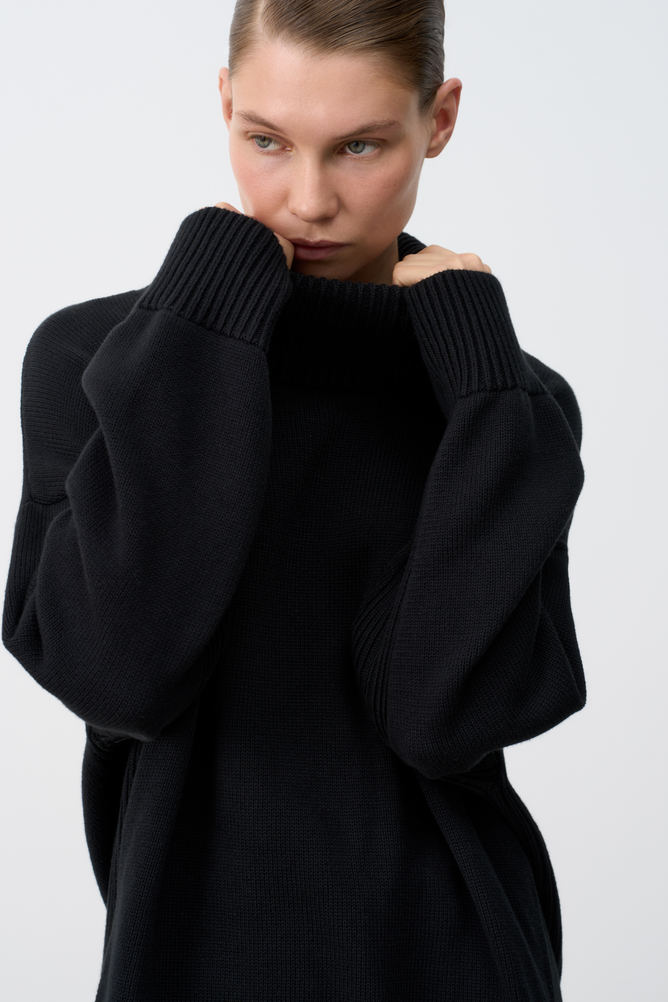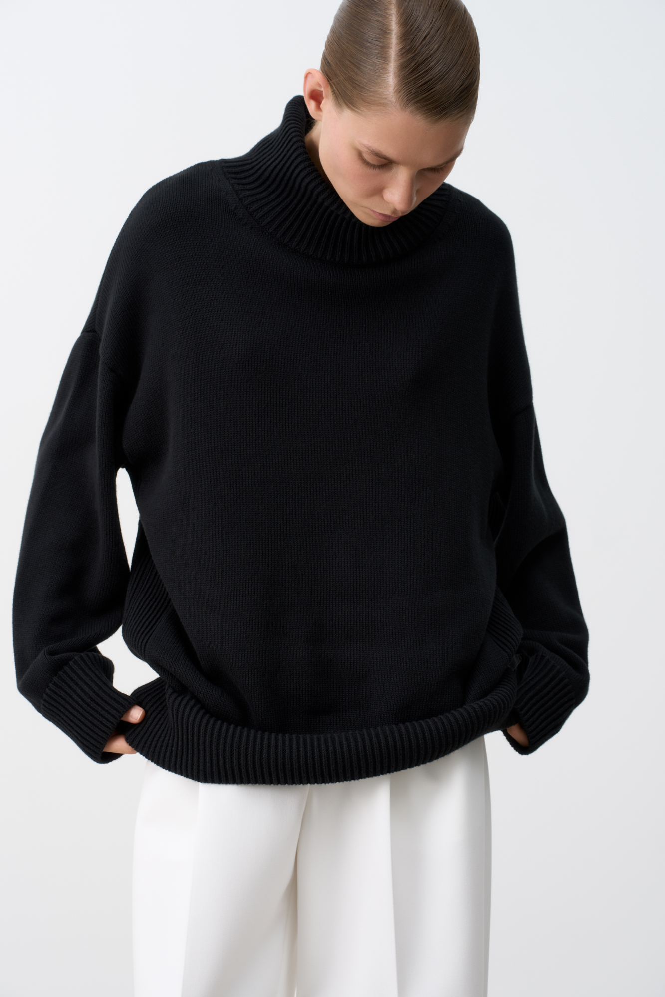 Трикотажный джемпер из 100% хлопка. Модель свободного силуэта со спущенной линией плеча и высоким объемным воротом.