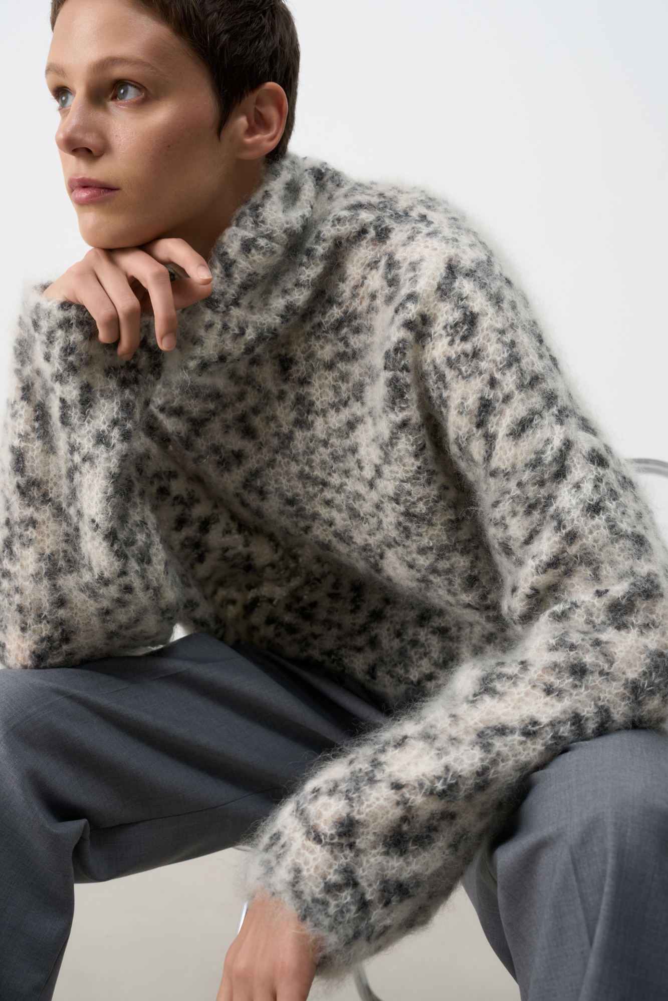 Трикотажный джемпер из мохера. Модель свободного силуэта со спущенной линией плеч и высоким воротом.
