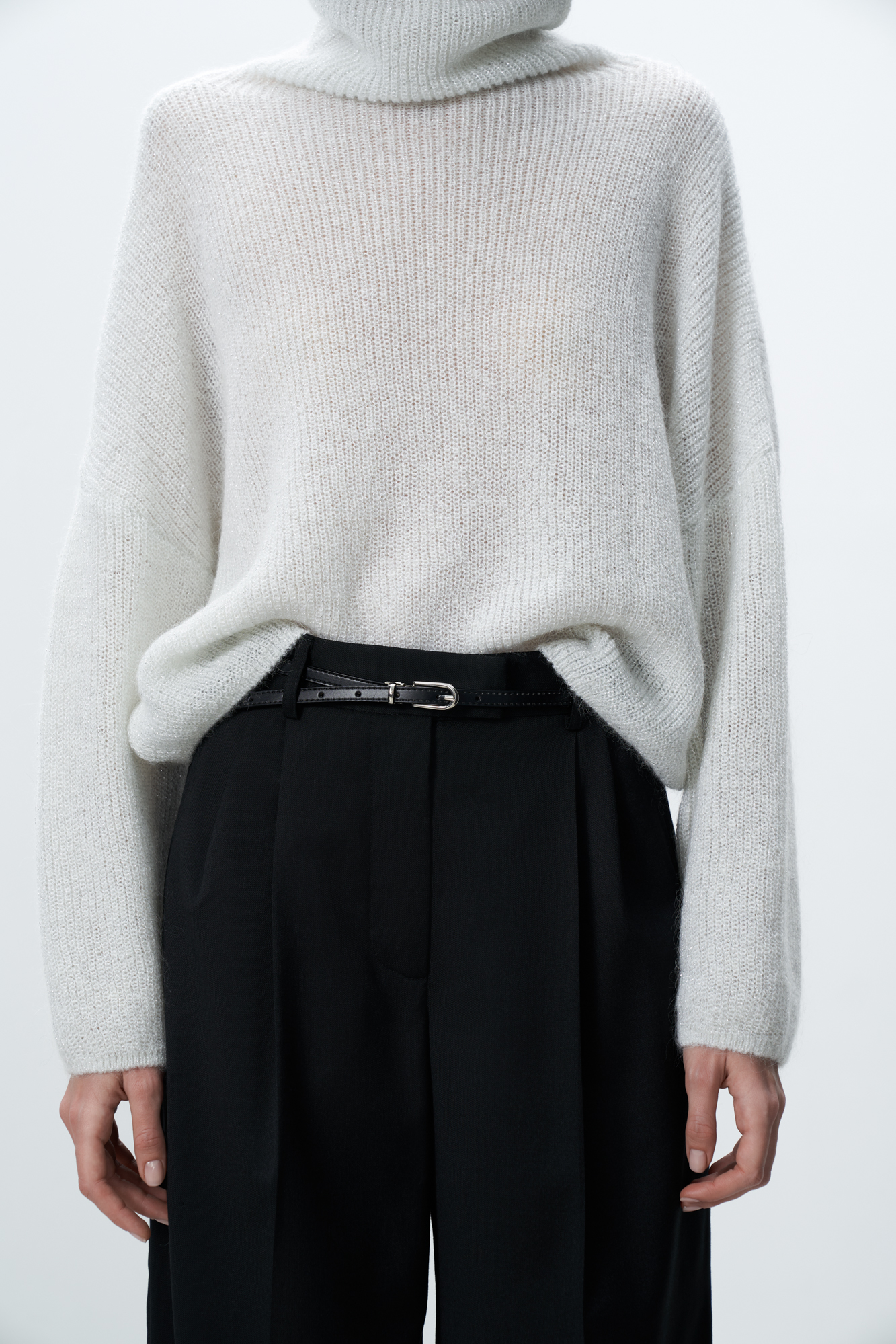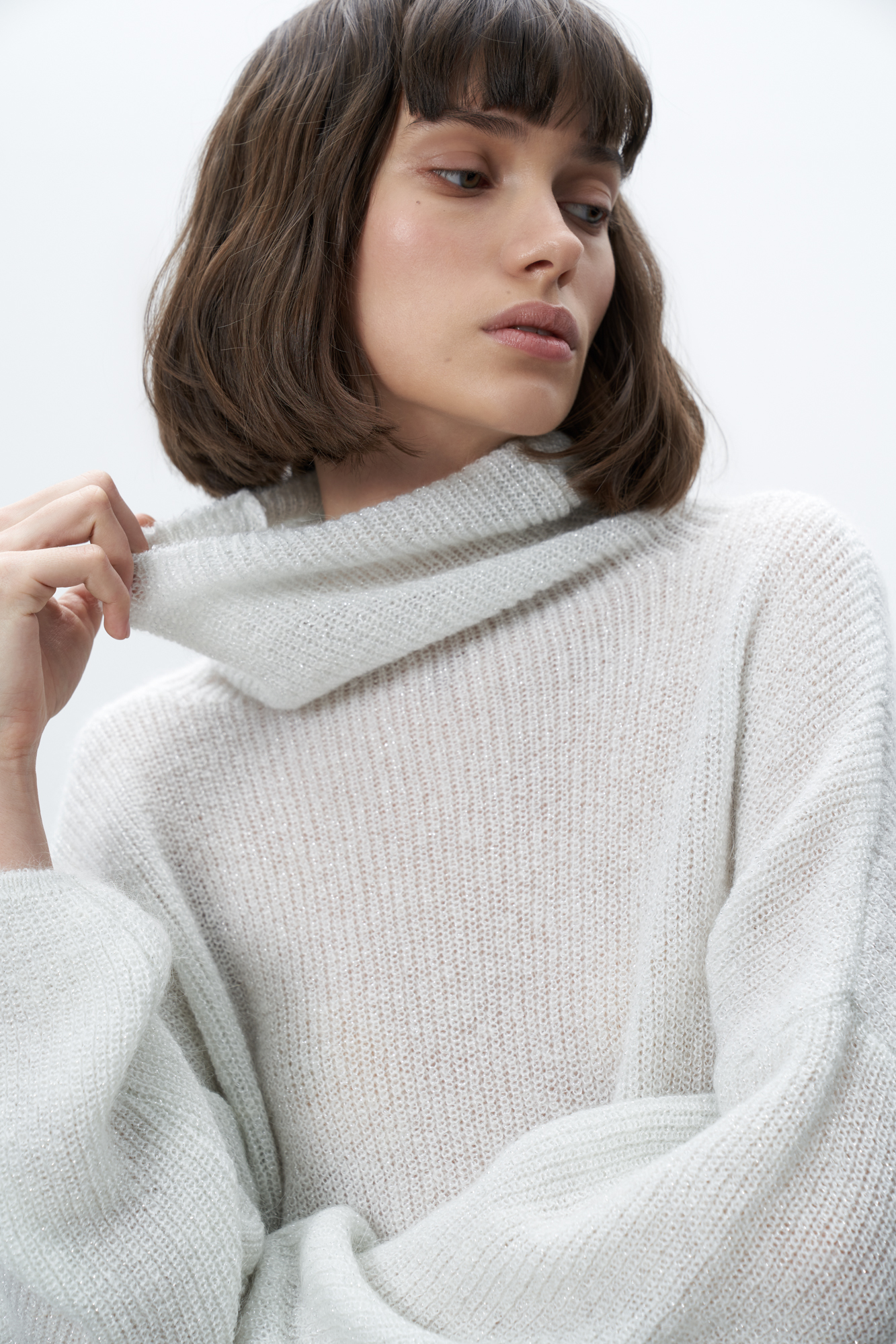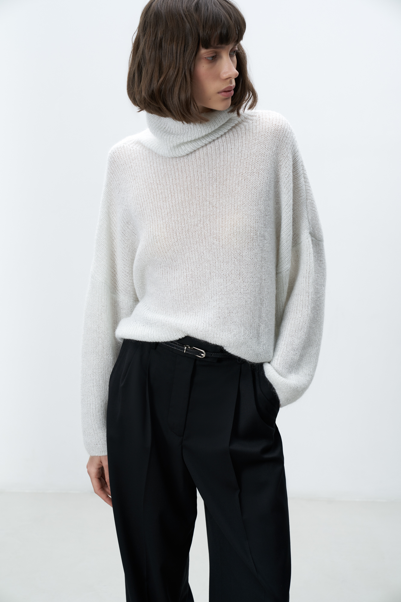 Трикотажный джемпер с люрексом. Укороченная модель свободного силуэта со спущенной линией плеча и вывязанным воротником.