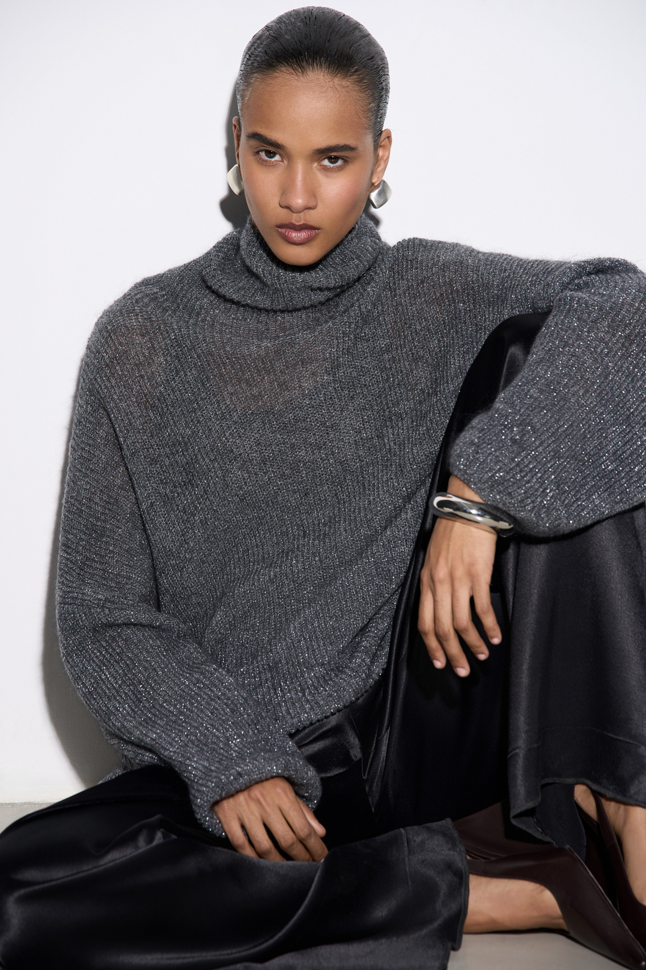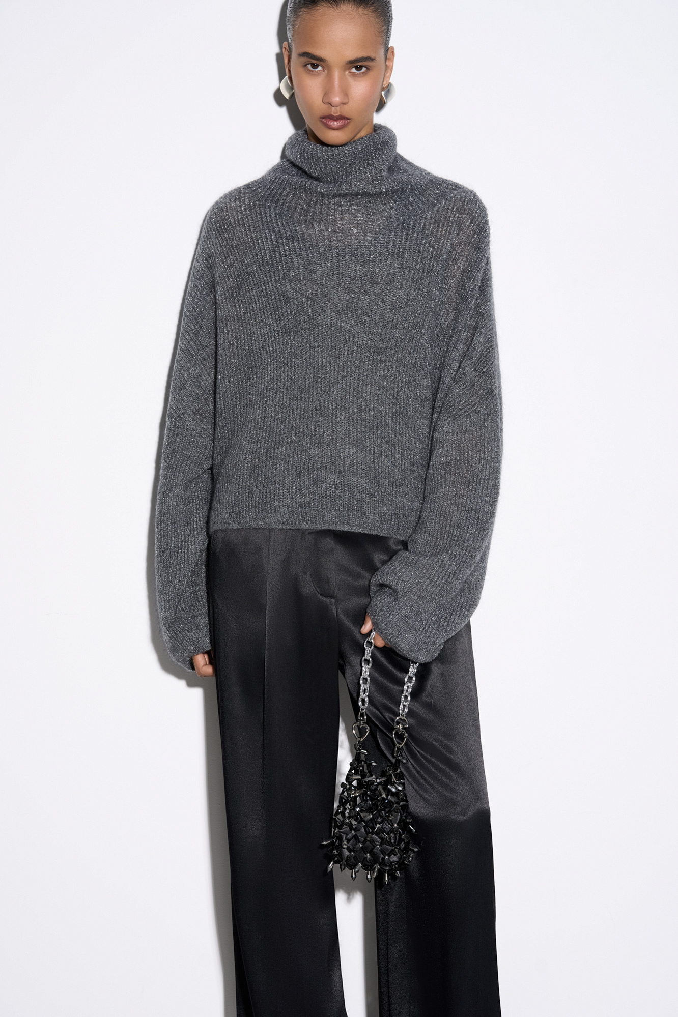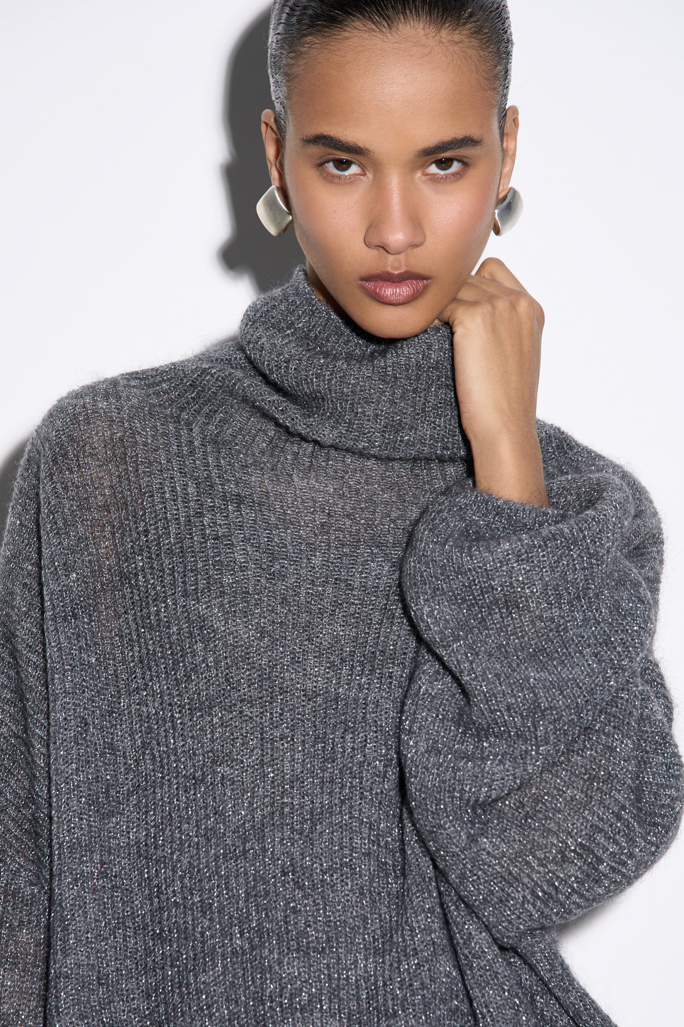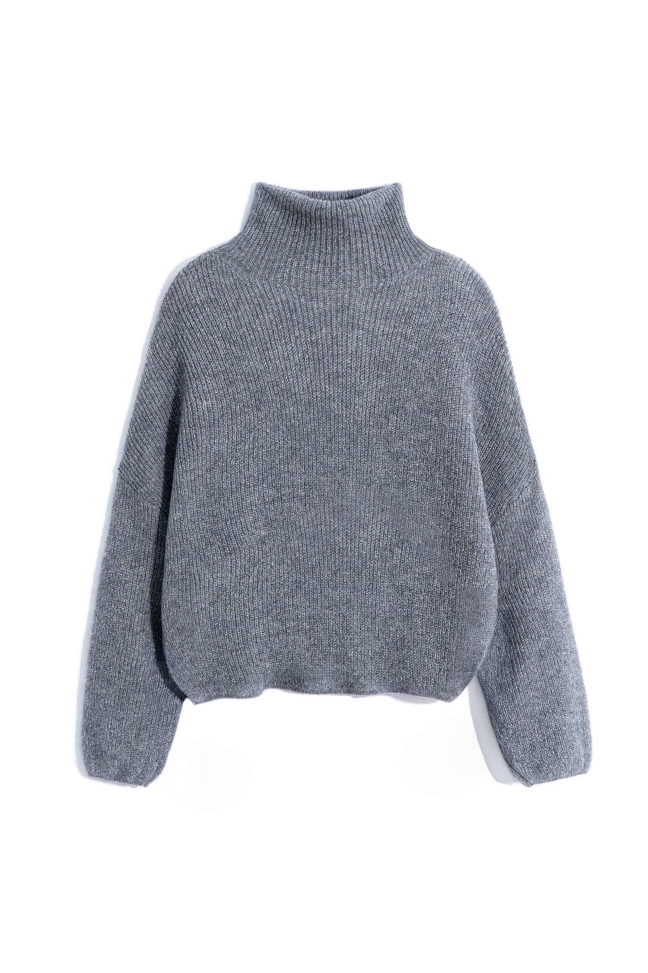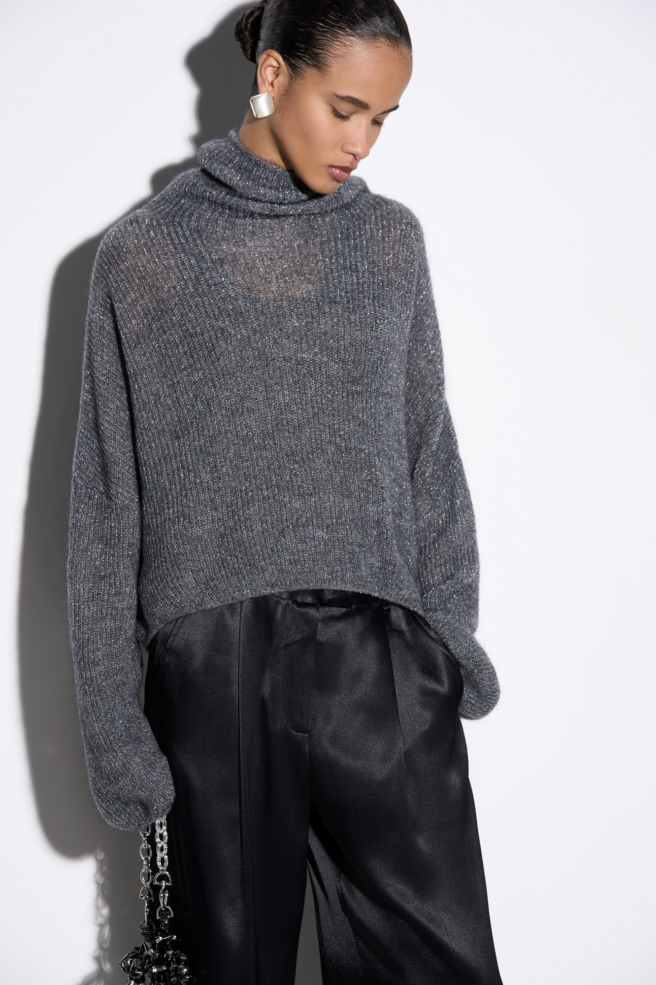 Трикотажный джемпер с люрексом. Укороченная модель свободного силуэта со спущенной линией плеча и вывязанным воротником.