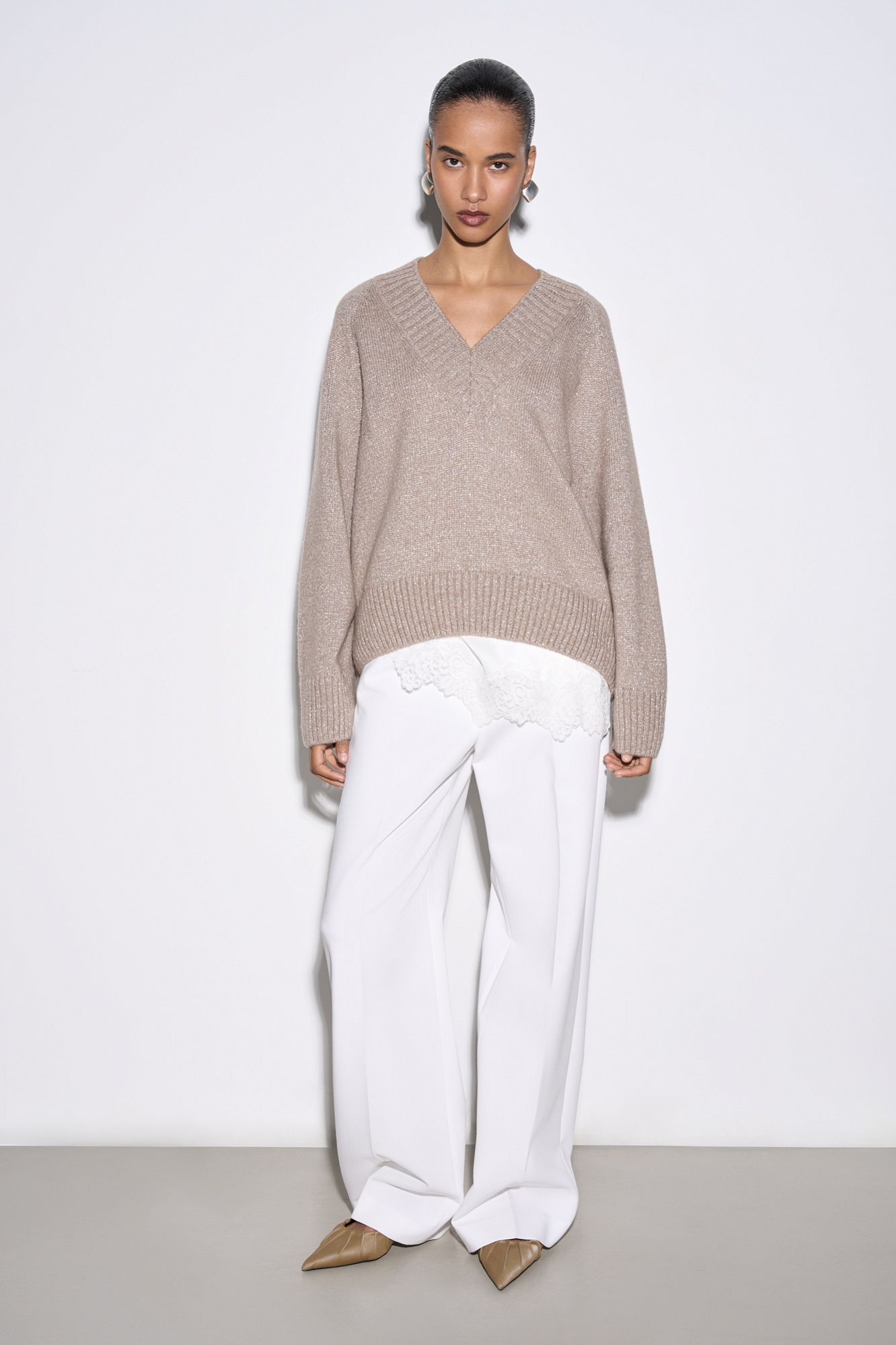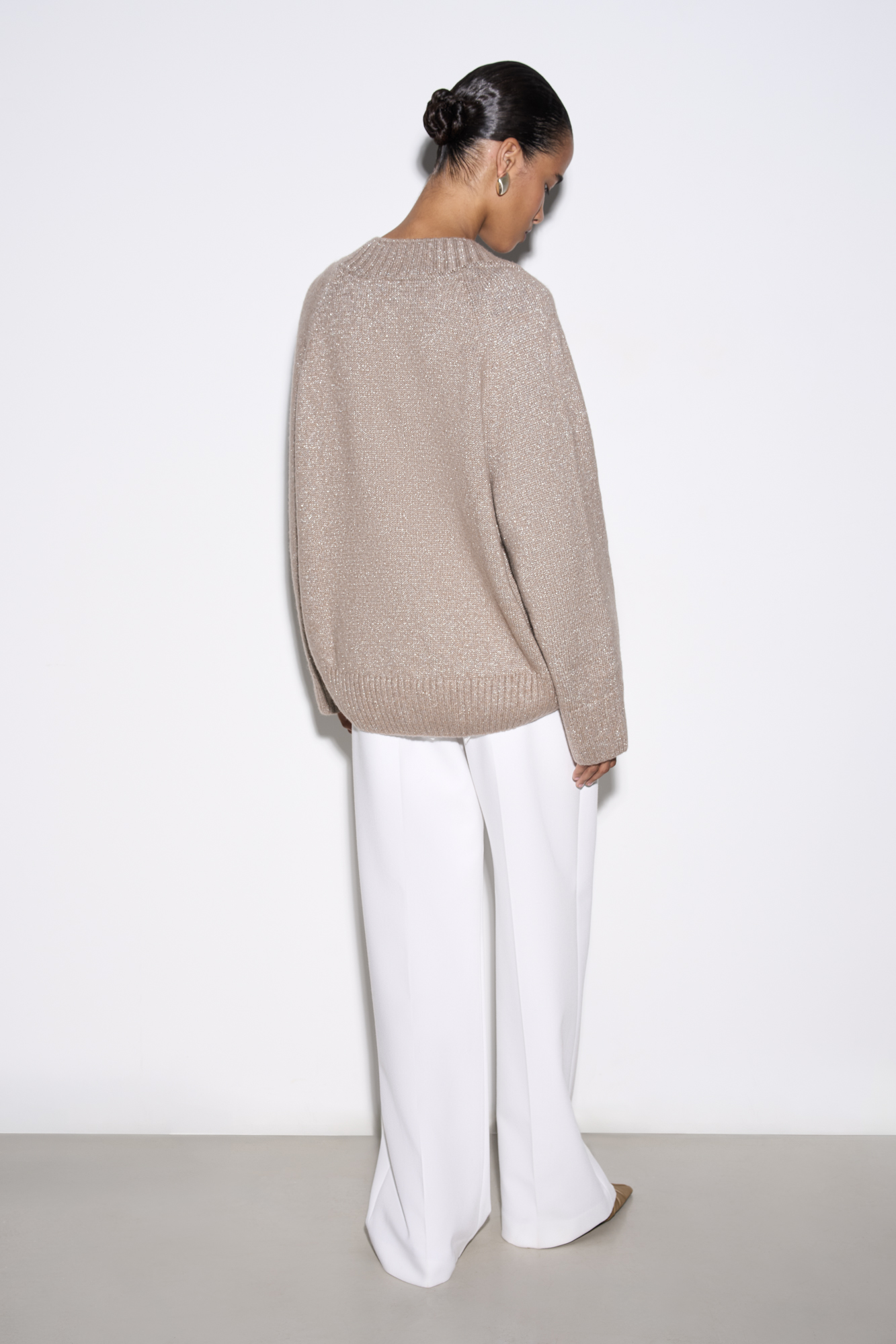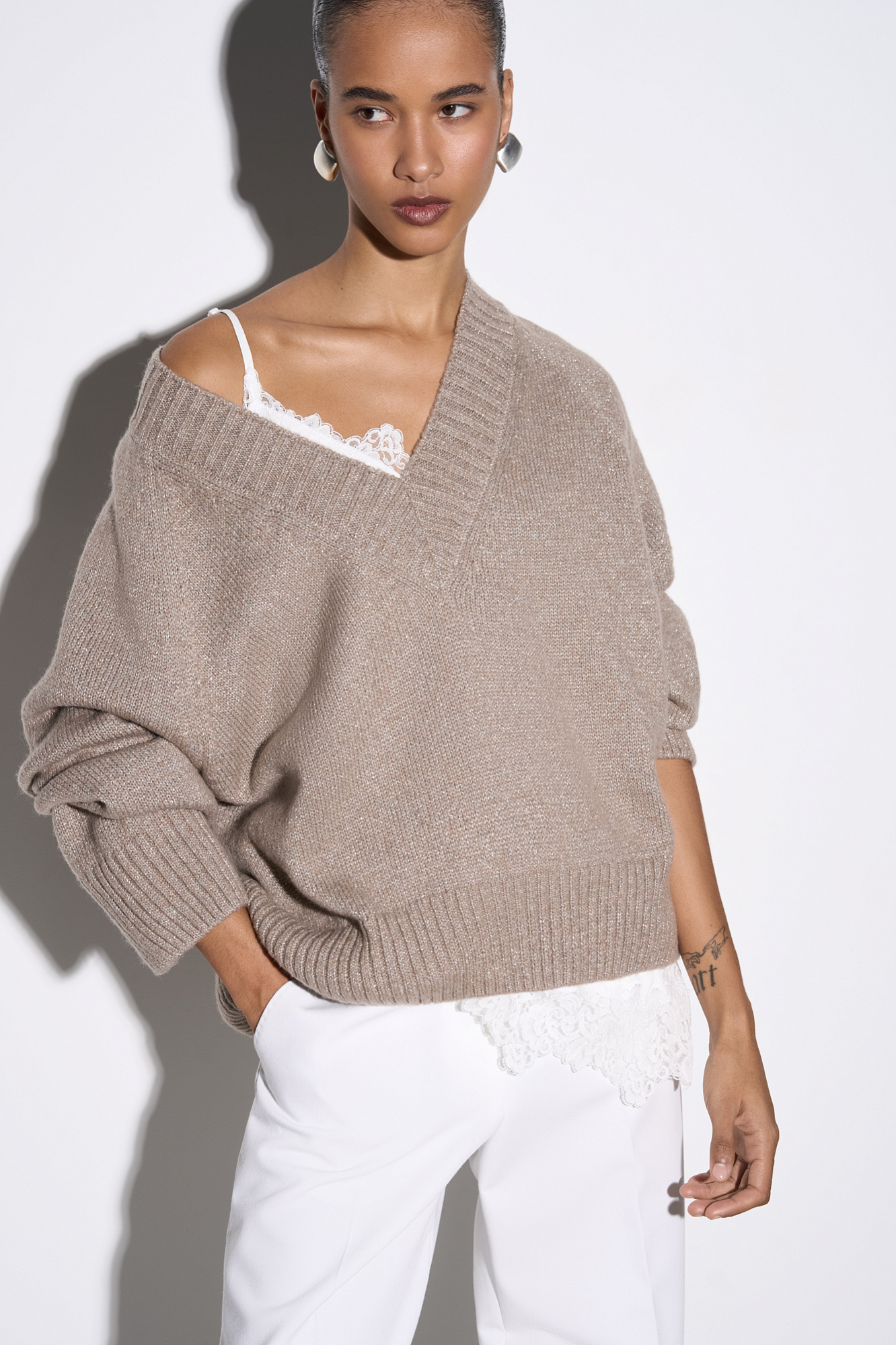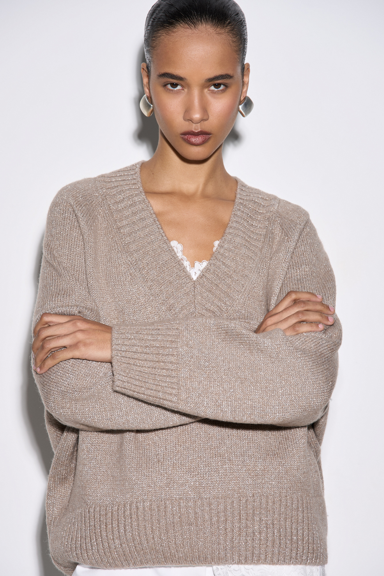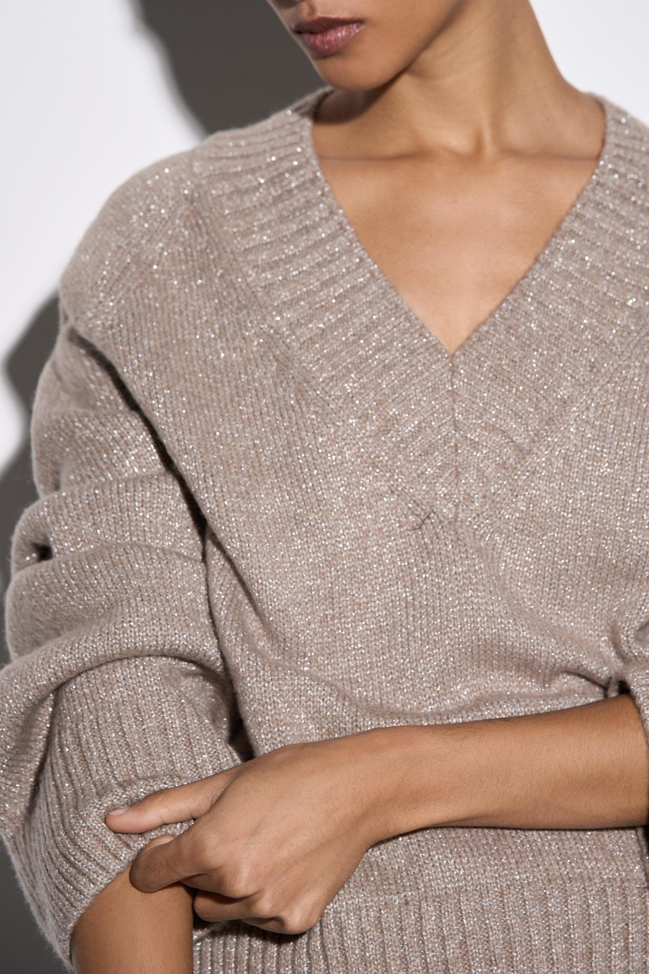 Трикотажный джемпер из шерсти мериноса с люрексом. Модель свободного силуэта с V-образным вырезом.