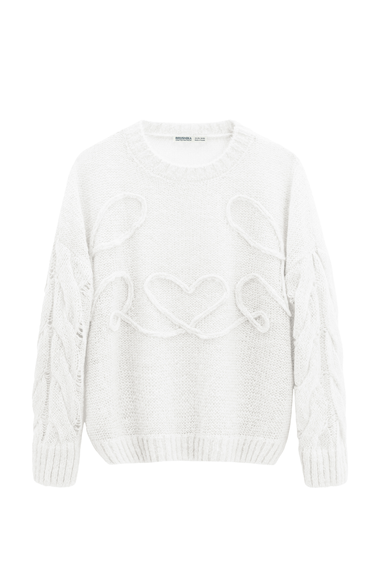 Трикотажный джемпер из шерсти и мохера. Модель свободного силуэта со спущенной линией плеча и круглым вырезом горловины. Изделие декорировано вывязанными косами на рукавах и вензелем в виде сердца на груди.