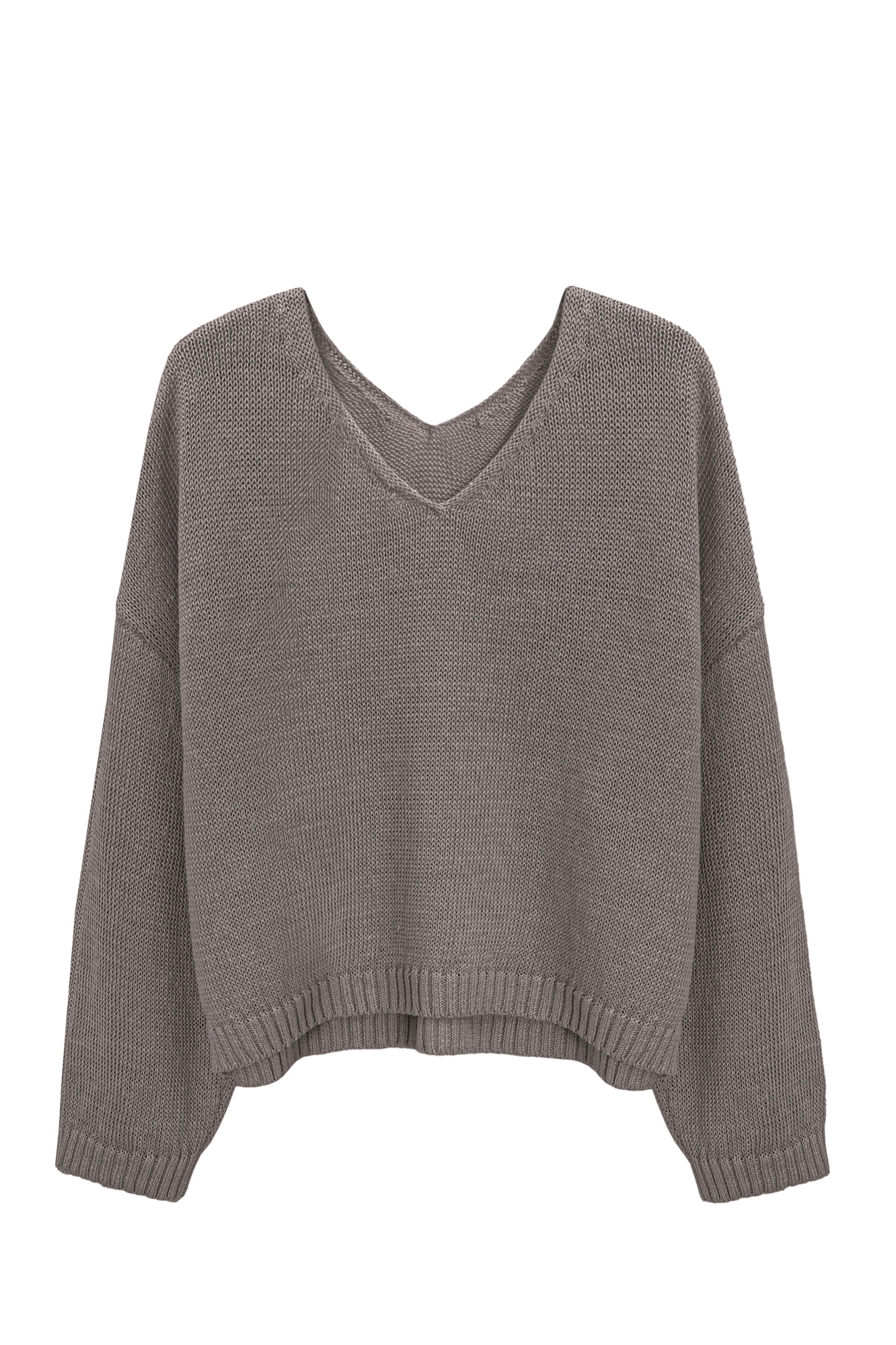 Трикотажный джемпер из 100% льна с V-образным вырезом. Модель прямого силуэта с длинным рукавом и удлиненной спинкой. Края изделия выполнены в рубчик.