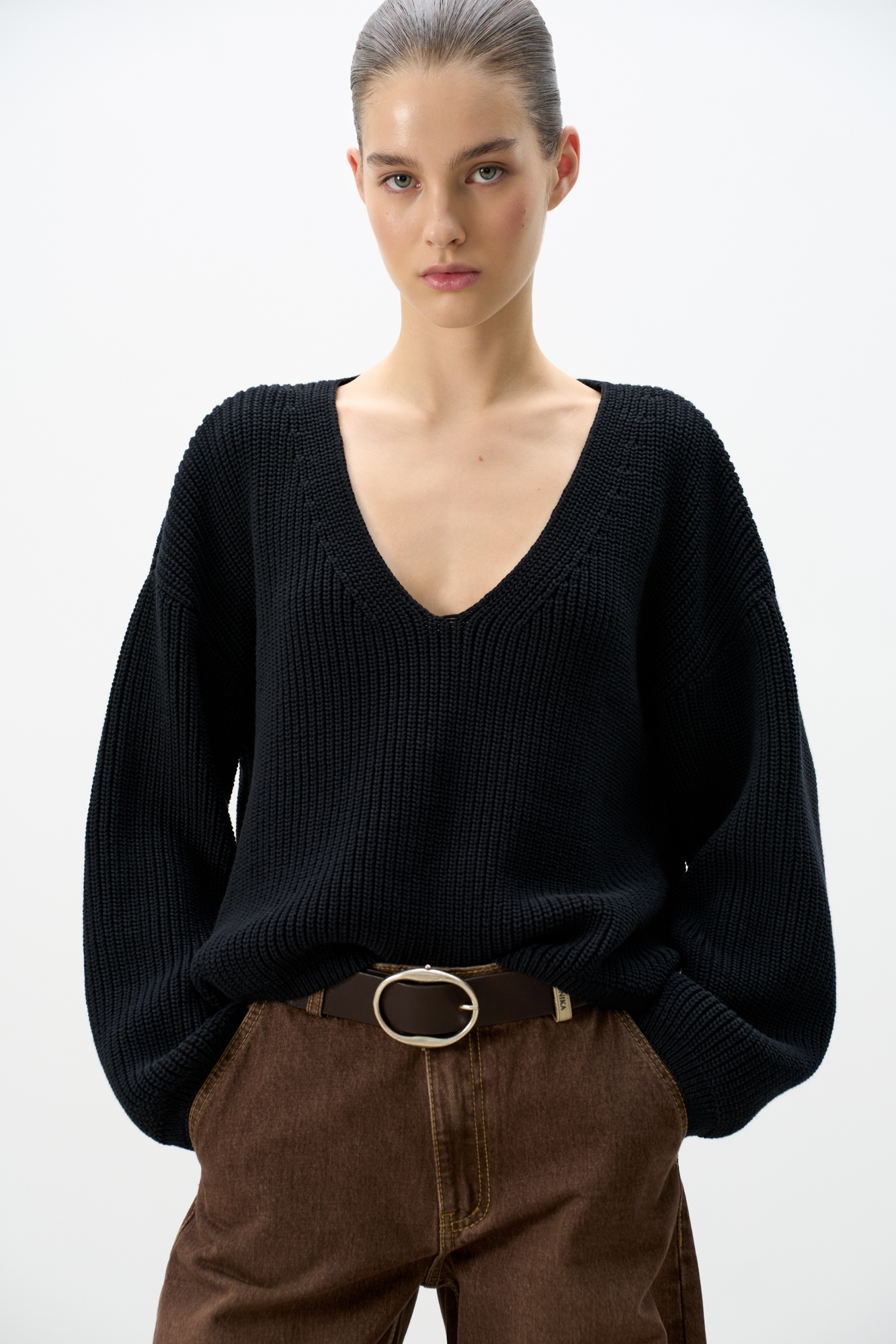 Трикотажный джемпер из хлопка с добавлением эластана. Модель свободного силуэта с V-образным вырезом горловины и спущенной линией плеч.