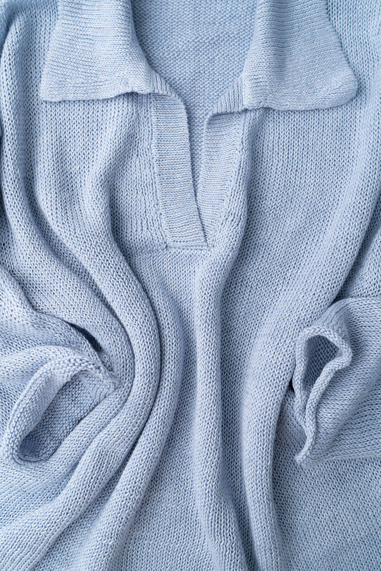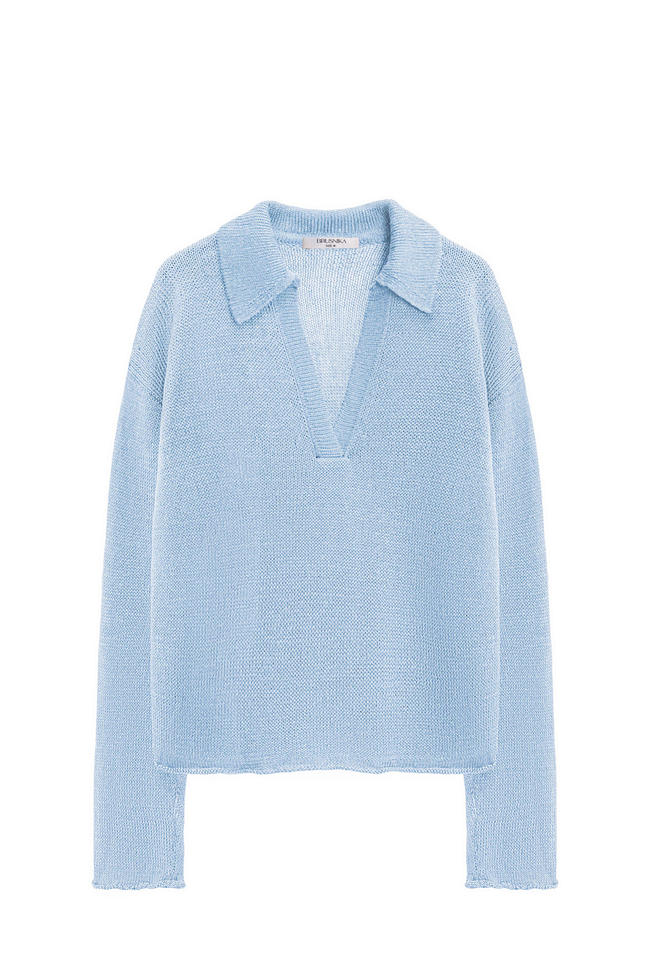 Трикотажный джемпер из 100% льна с воротником поло. Модель свободного силуэта, со спущенной линией плеча, длинными рукавами, V-образным вырезом горловины и валиками по нижнему краю изделия.