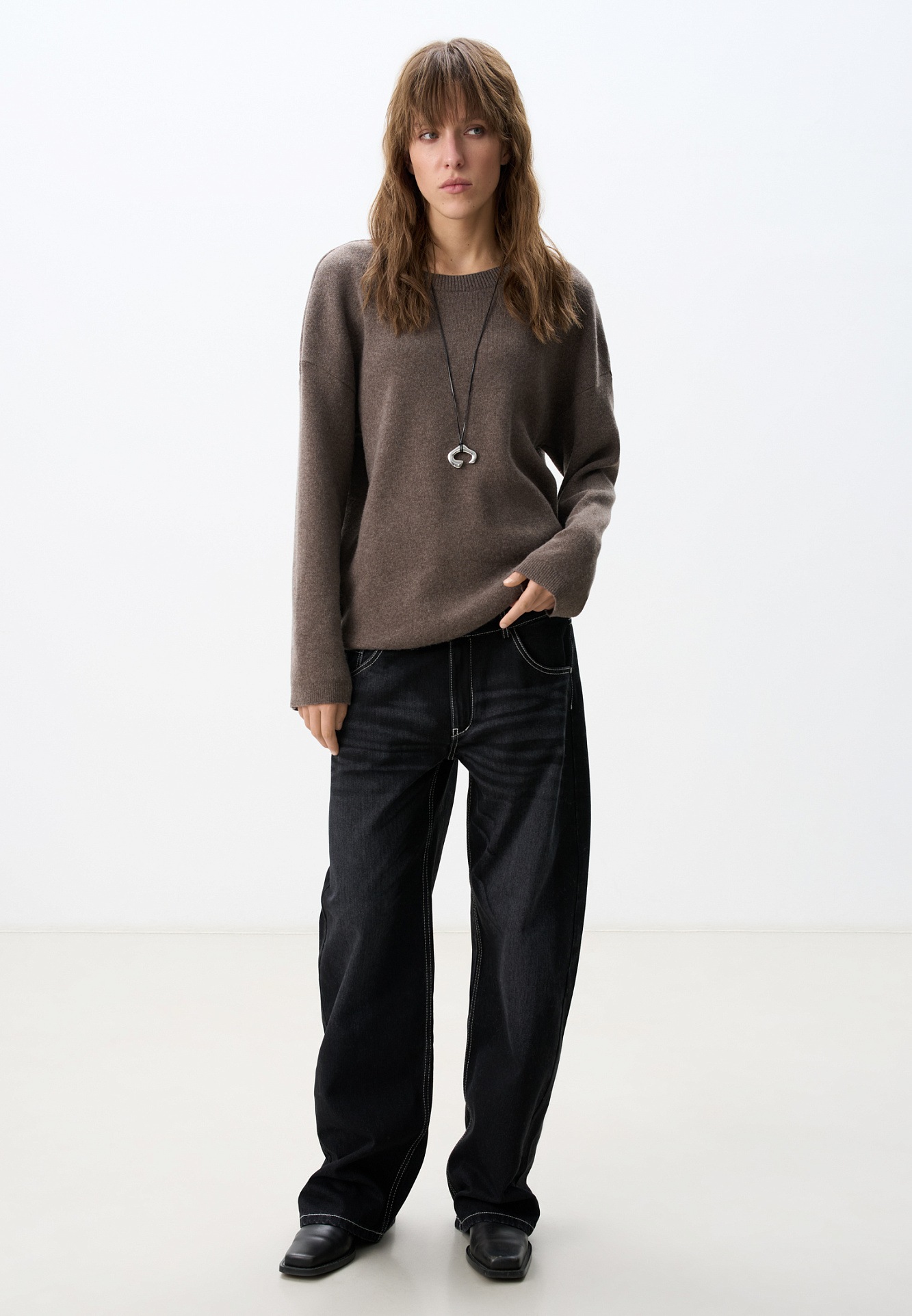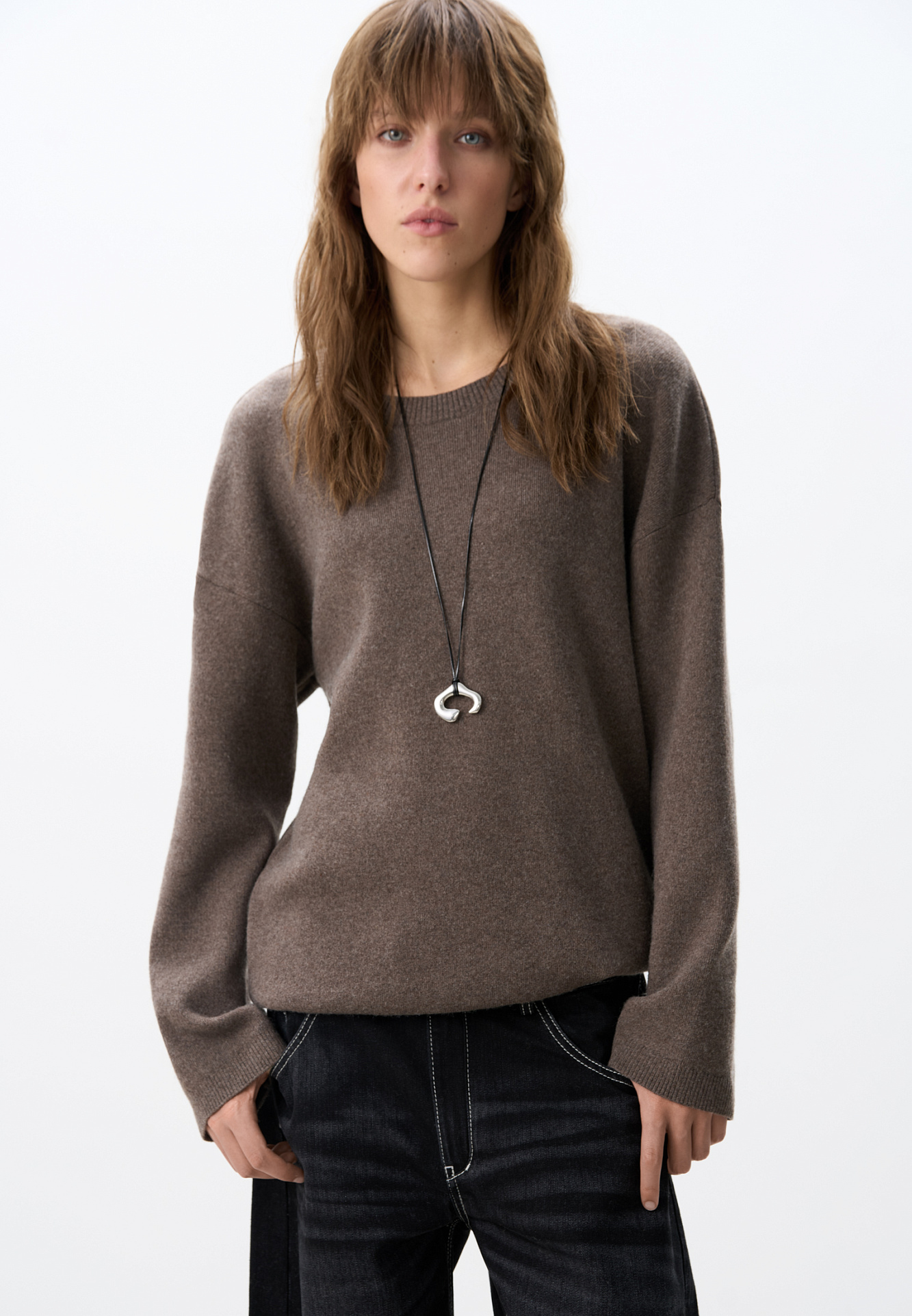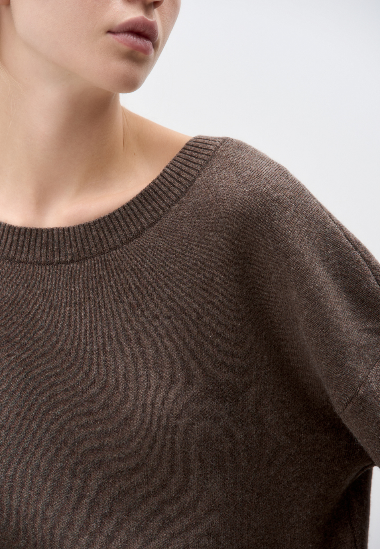 Трикотажный джемпер из кашемира и шерсти. Модель свободного силуэта с длинными рукавами и глубоким вырезом с перемычкой на спине. Края изделия выполнены в рубчик.
