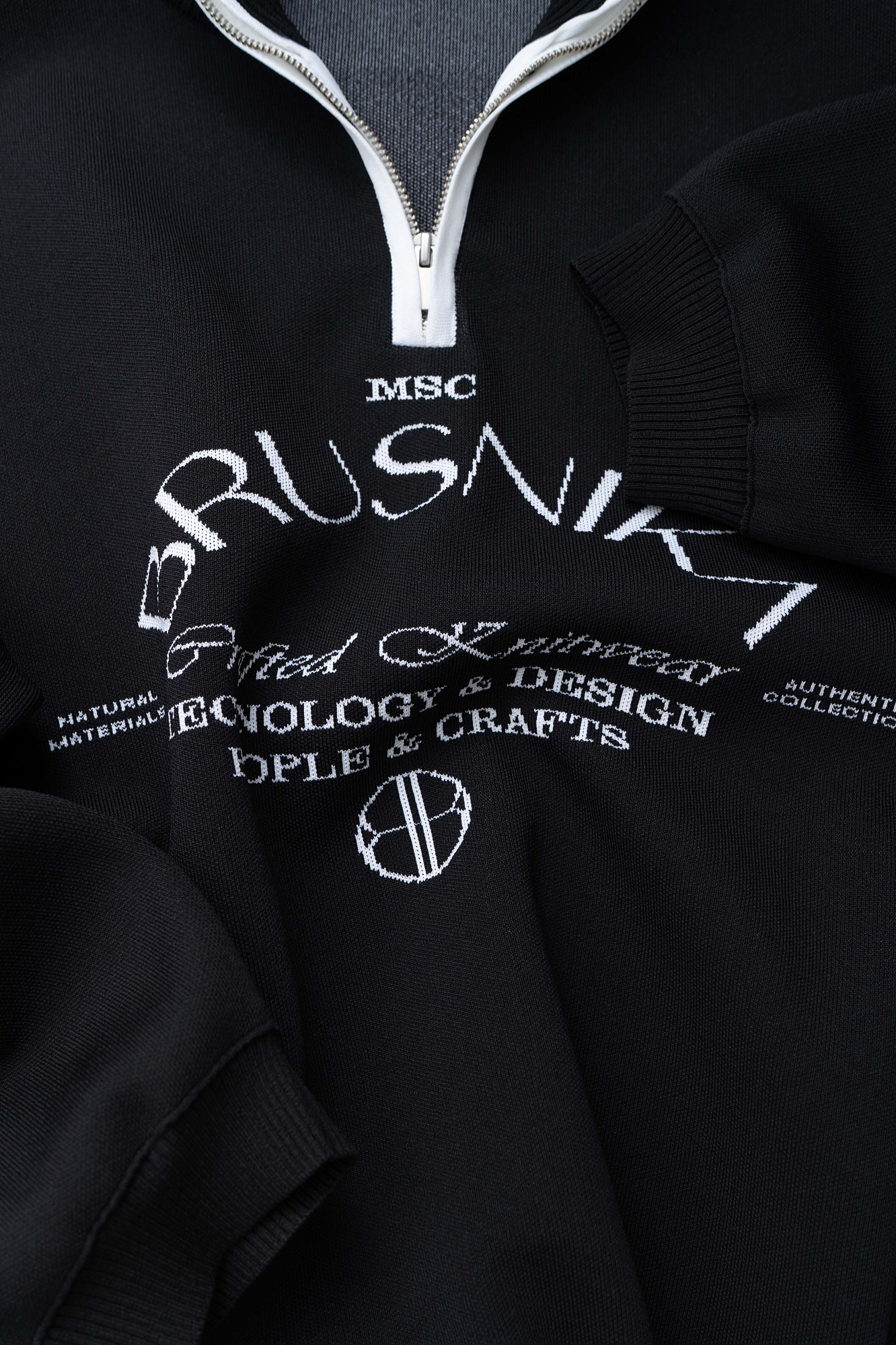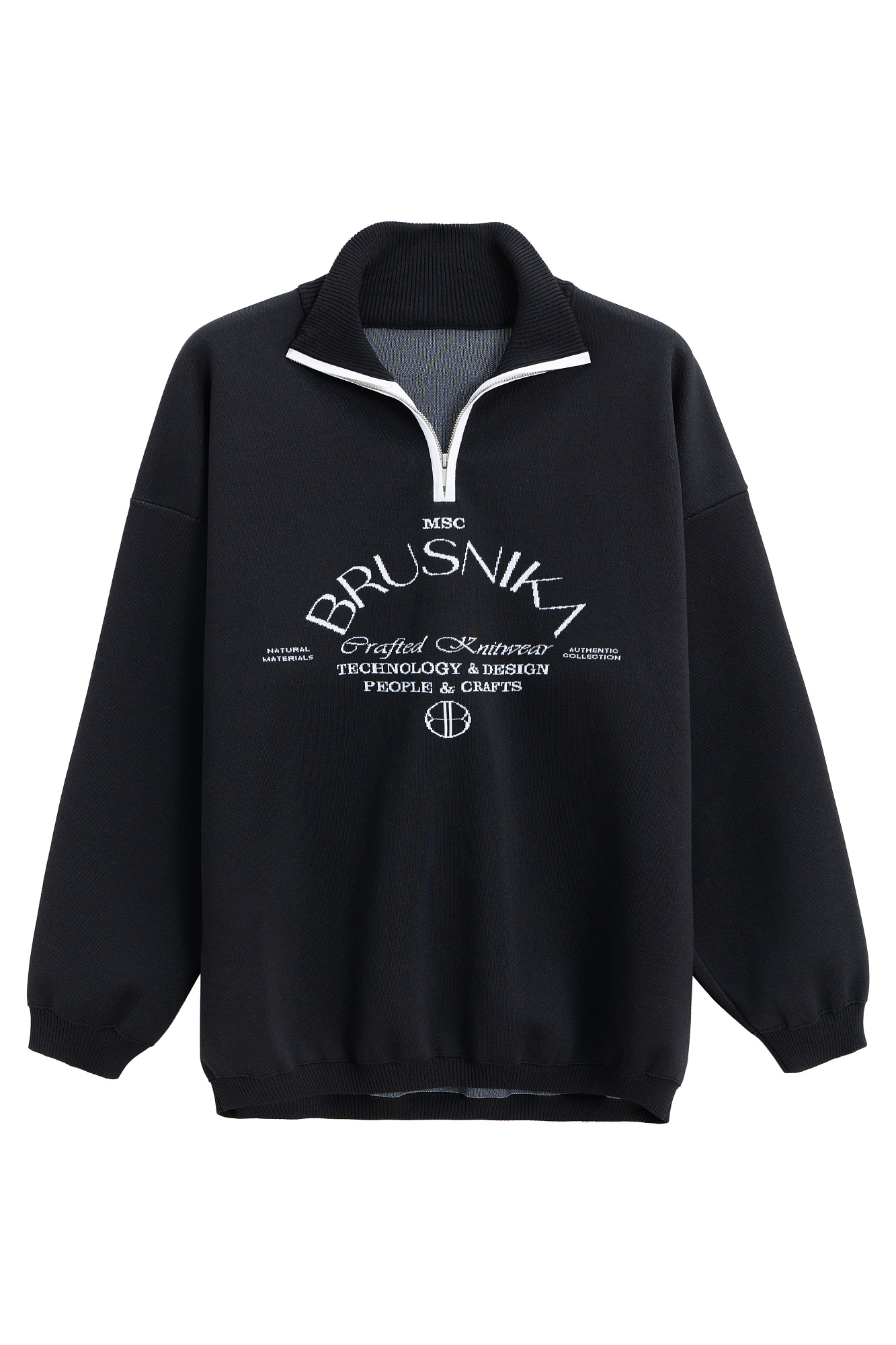 Принтованный джемпер из вискозы. Модель свободного силуэта со спущенной линией плеча и воротником-стойкой, застегивающимся на молнию. Манжеты и низ изделия выполнены в рубчик.