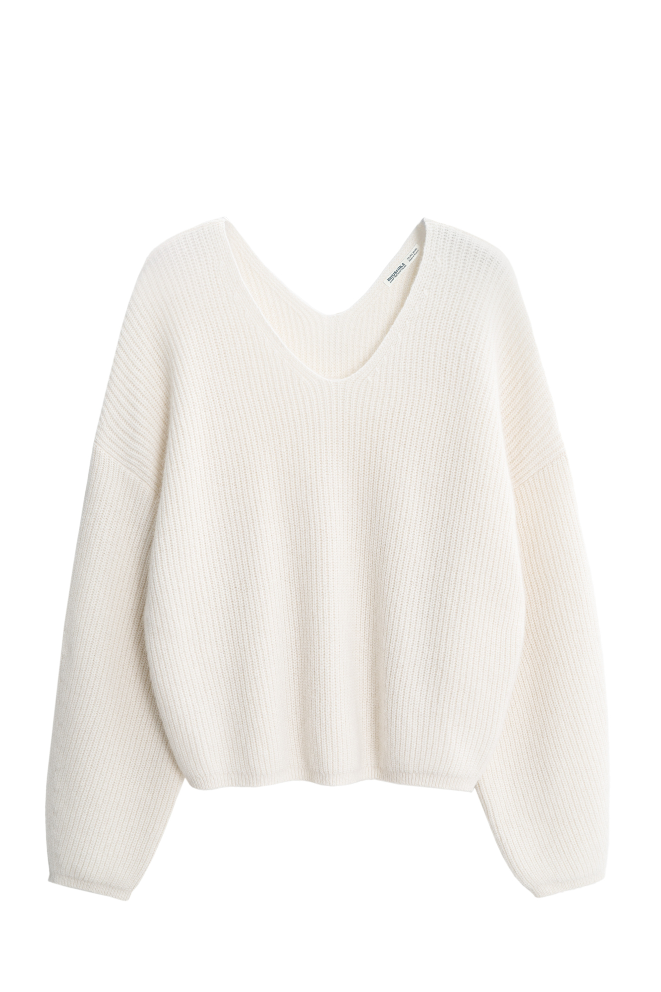 Трикотажный джемпер из пуха лисы. Модель свободного силуэта со спущенной линией плеч и V-образным вырезом горловины. Образ можно дополнить юбкой в том же стиле.