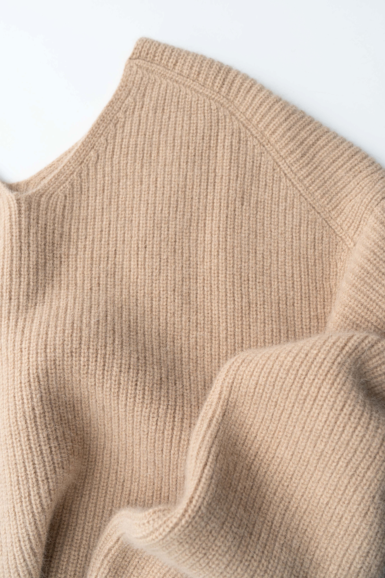 Трикотажный джемпер из пуха лисы. Модель свободного силуэта со спущенной линией плеч и V-образным вырезом горловины. Образ можно дополнить юбкой в том же стиле.