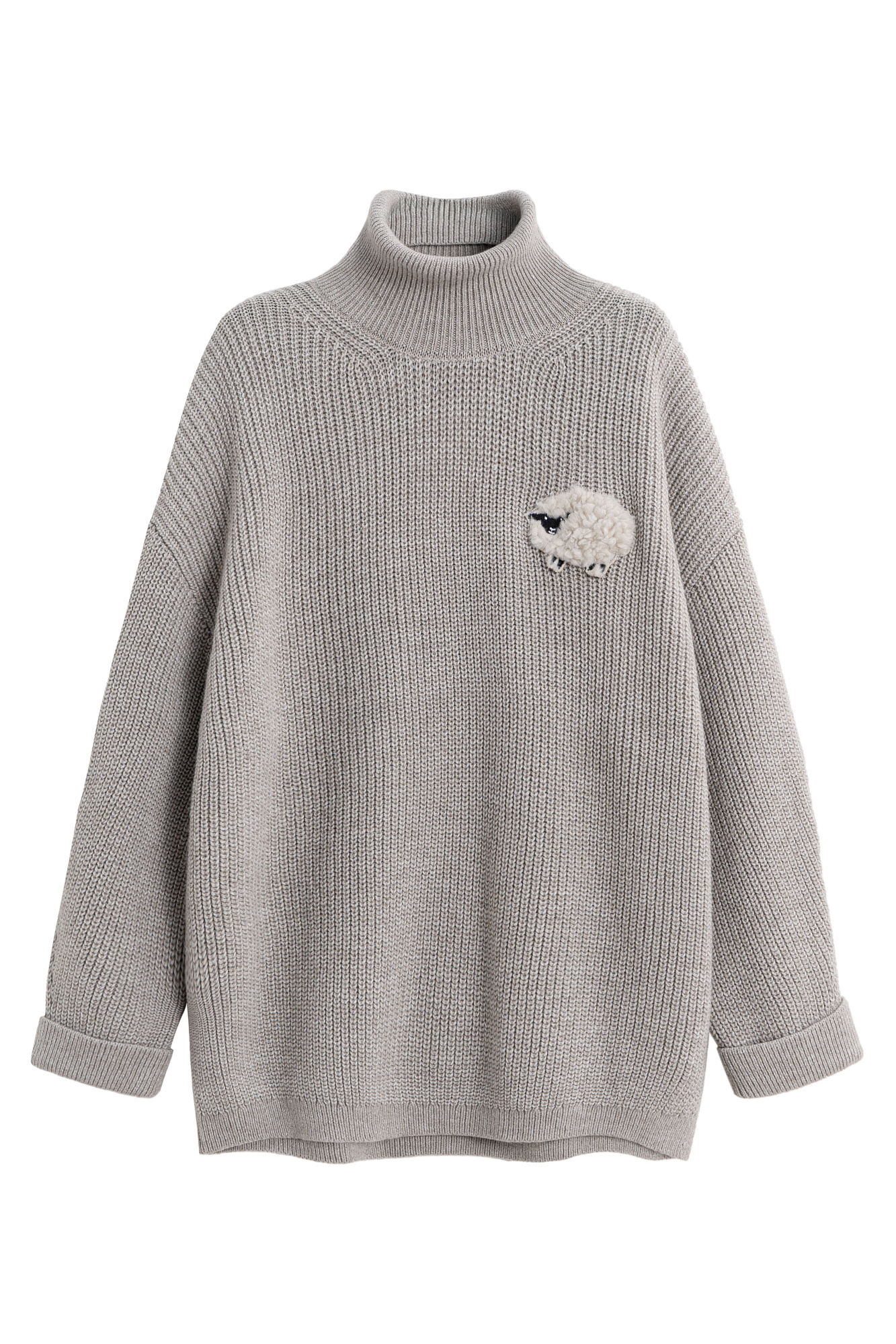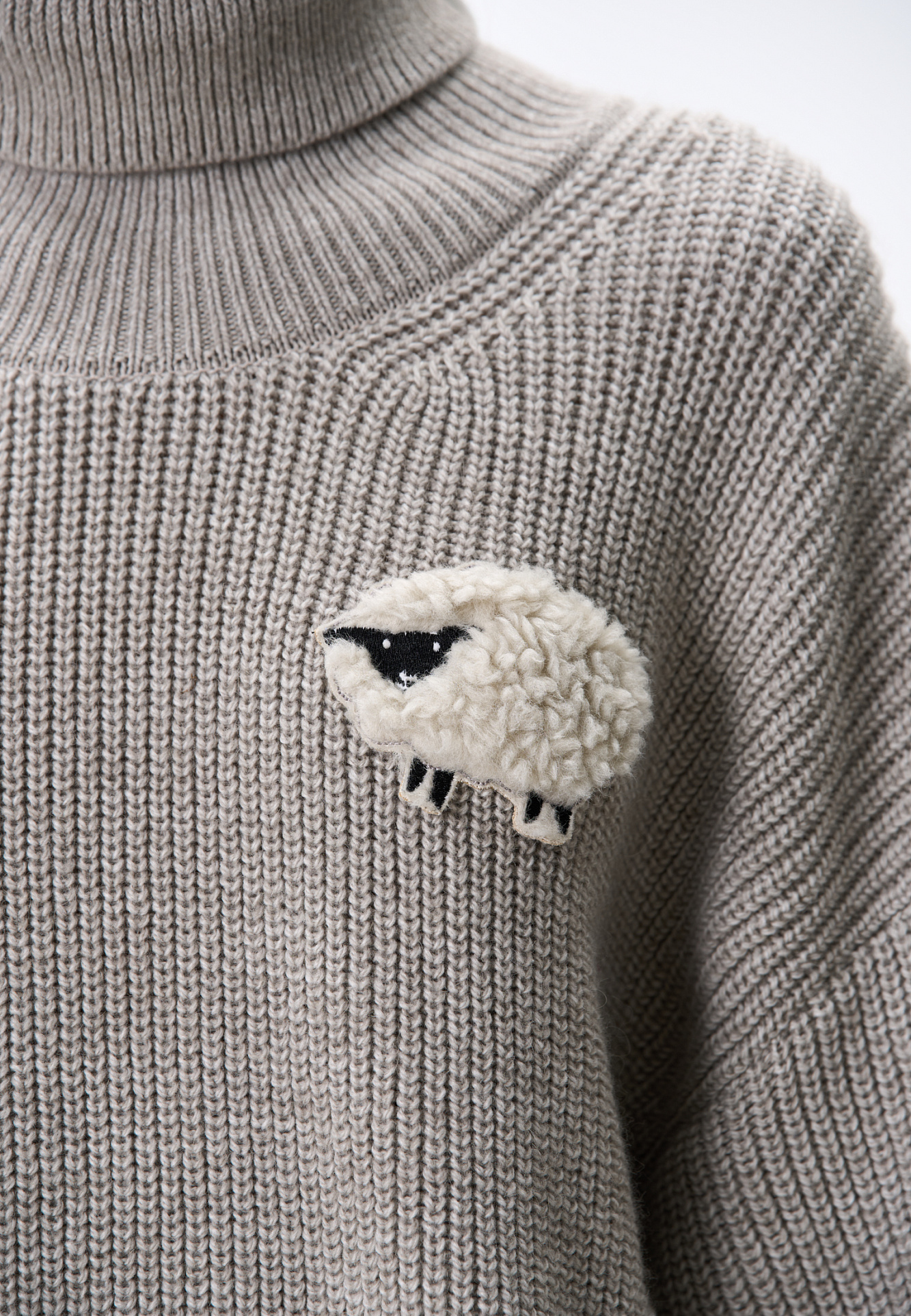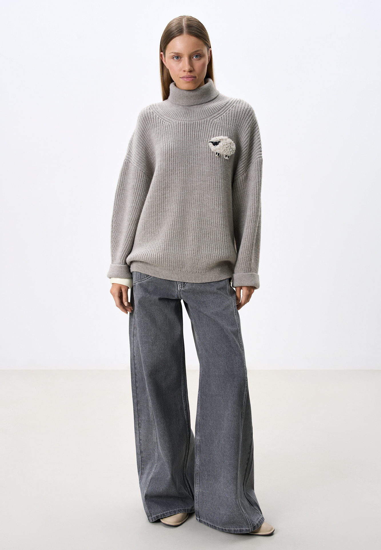 Трикотажный джемпер из шерсти альпака. Модель свободного силуэта, с высоким вывязанным горлом, спущенной линией плеч и длинными рукавами с манжетами. Изделие декорировано объемным элементом в виде барашка.