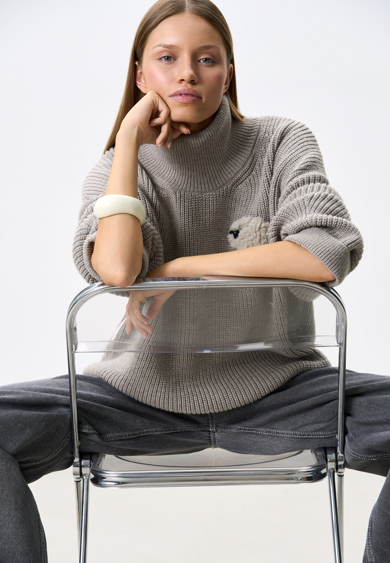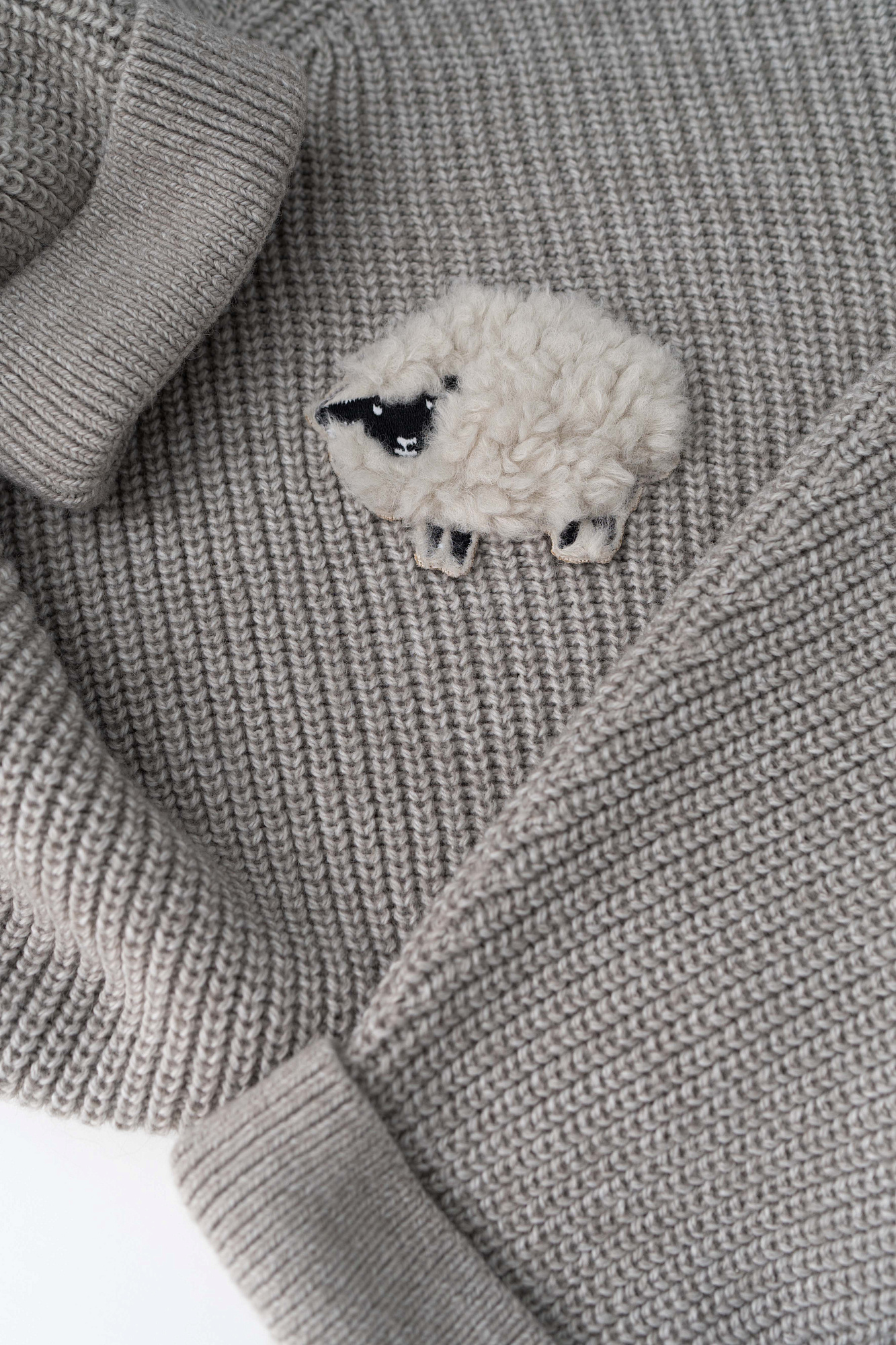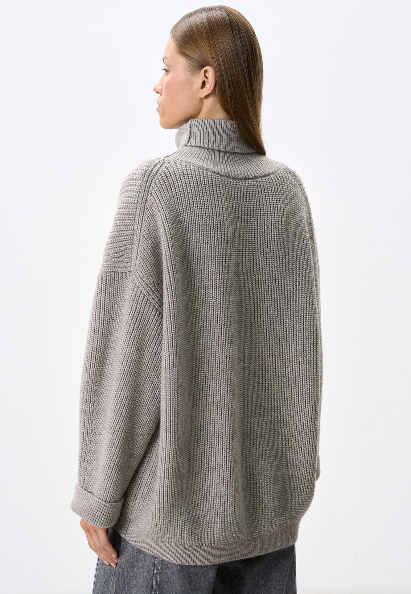 Трикотажный джемпер из шерсти альпака. Модель свободного силуэта, с высоким вывязанным горлом, спущенной линией плеч и длинными рукавами с манжетами. Изделие декорировано объемным элементом в виде барашка.