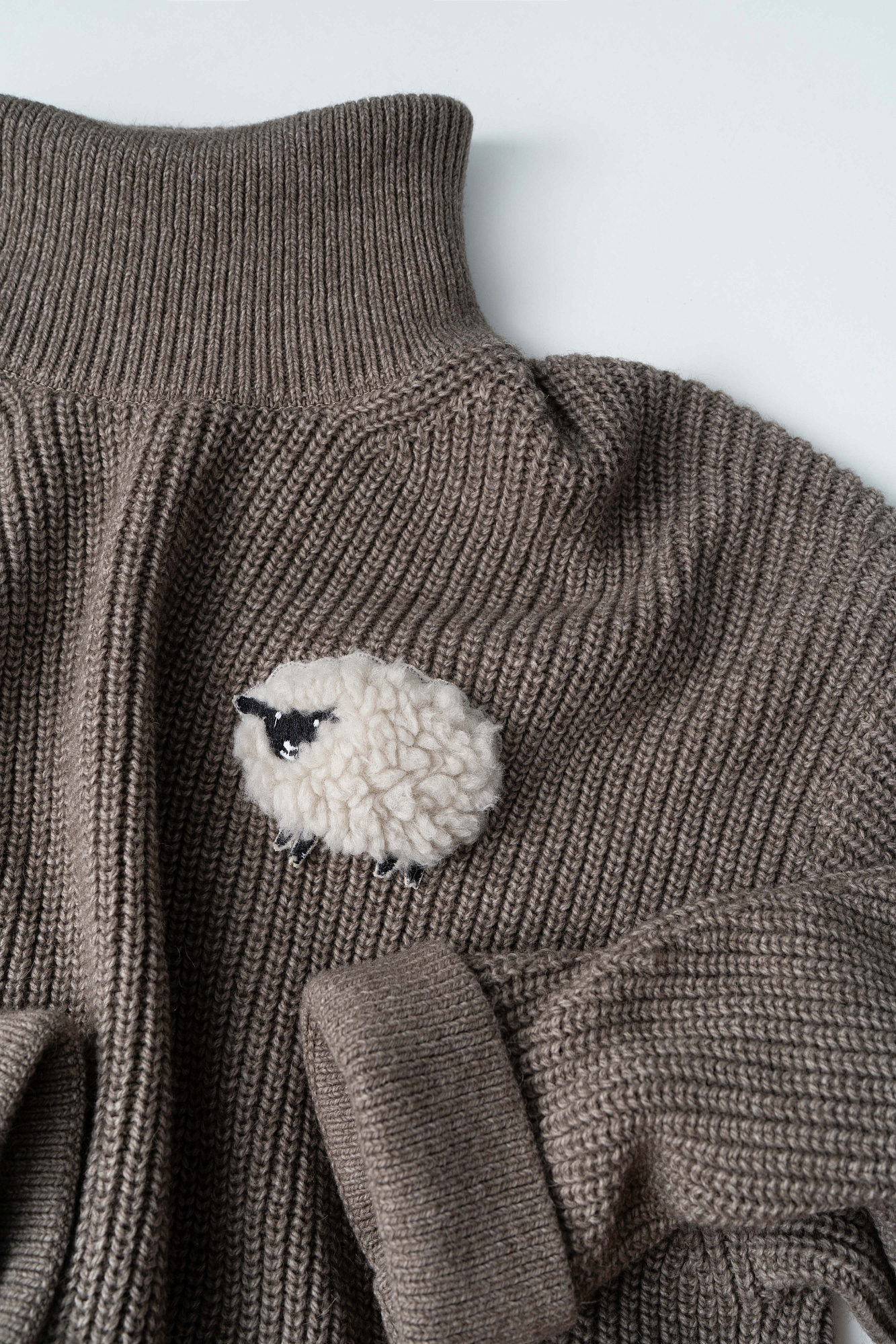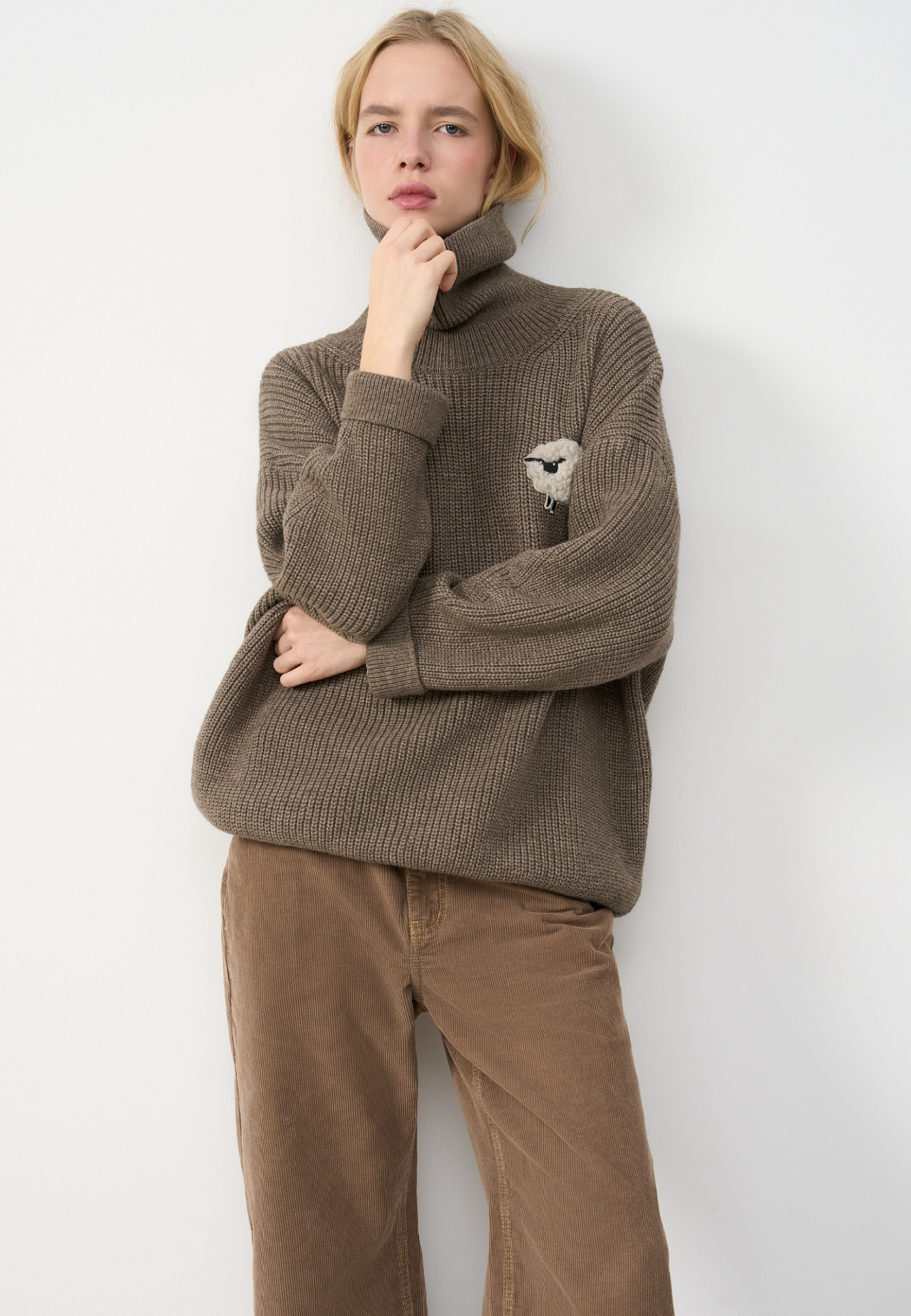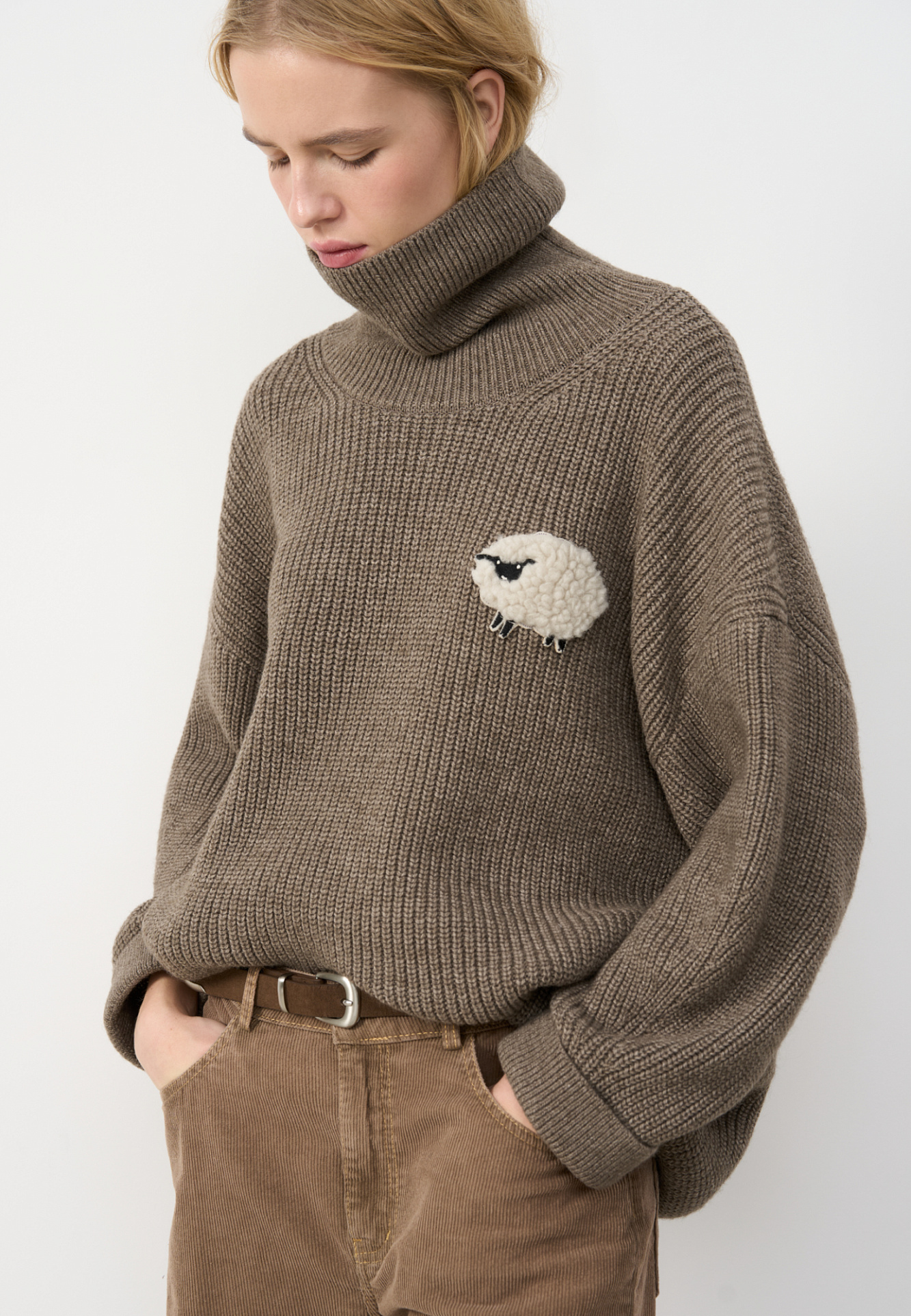 Трикотажный джемпер из шерсти альпака. Модель свободного силуэта, с высоким вывязанным горлом, спущенной линией плеч и длинными рукавами с манжетами. Изделие декорировано объемным элементом в виде барашка.