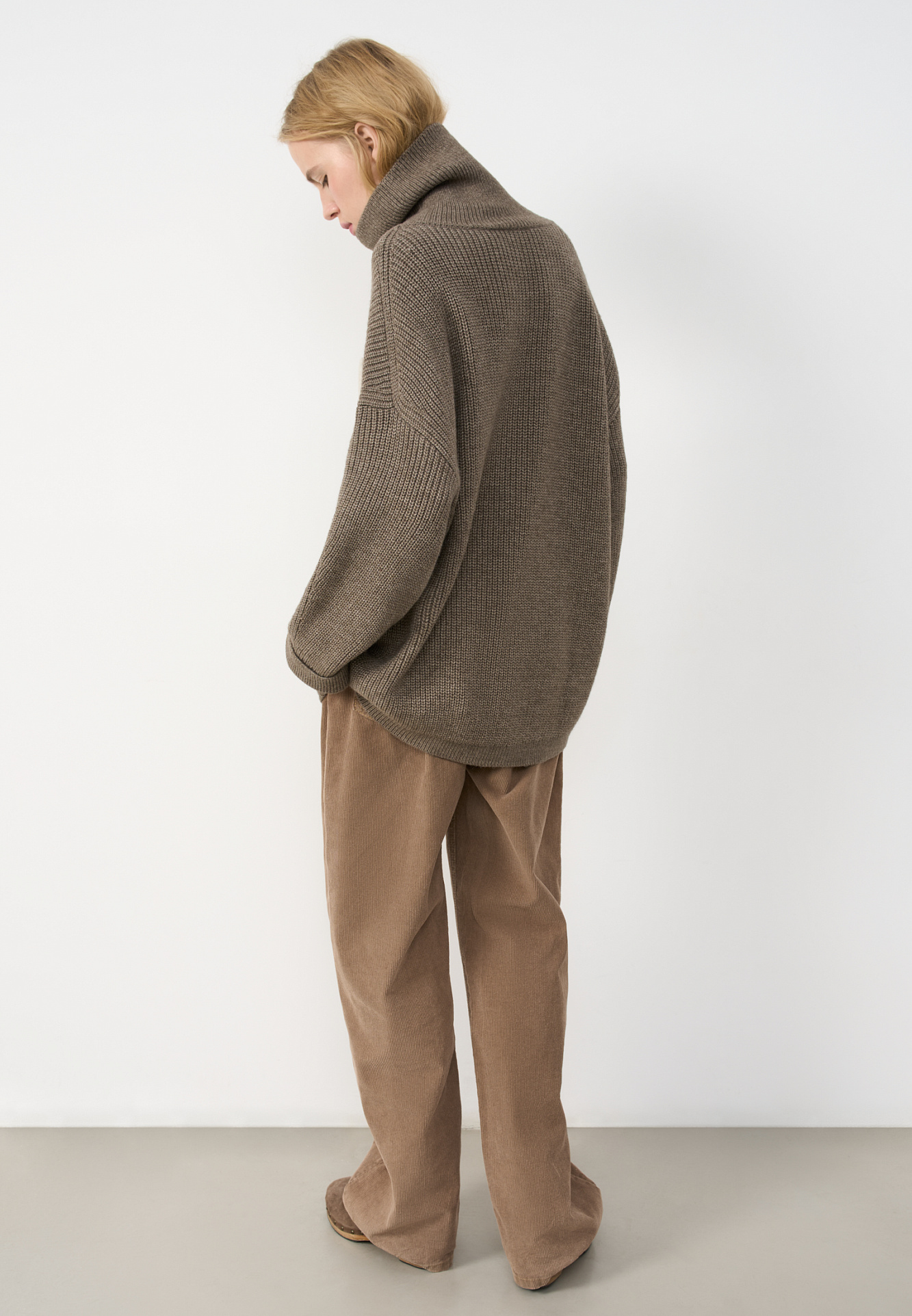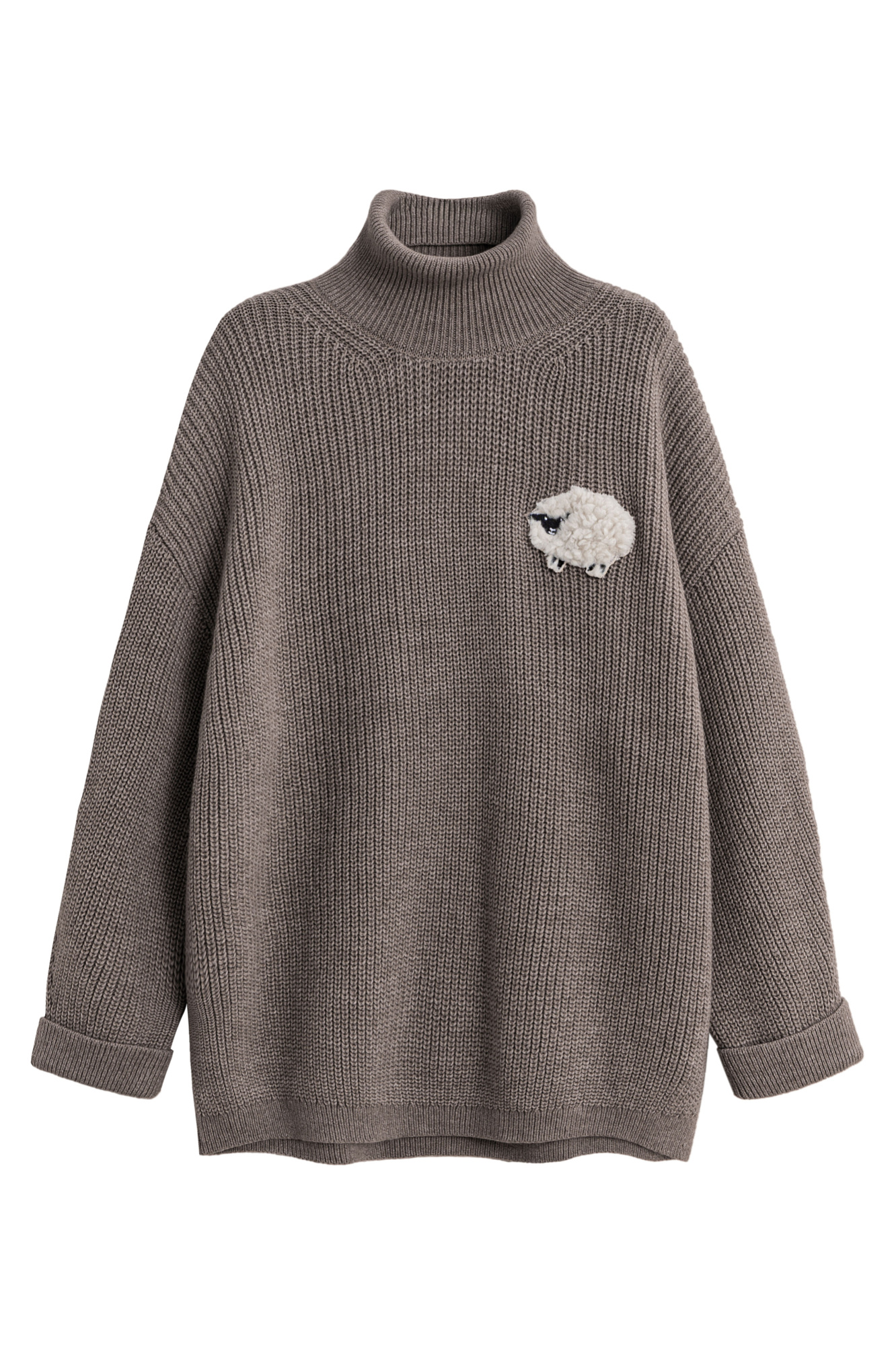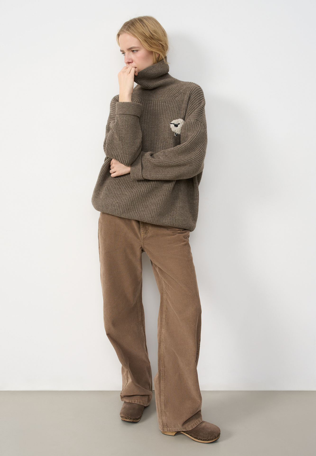 Трикотажный джемпер из шерсти альпака. Модель свободного силуэта, с высоким вывязанным горлом, спущенной линией плеч и длинными рукавами с манжетами. Изделие декорировано объемным элементом в виде барашка.