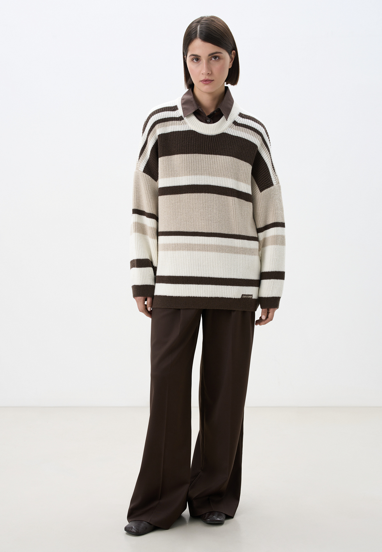 Трикотажный джемпер из шерсти в полоску. Модель свободного силуэта, со спущенной линией плеч, длинными рукавами и круглым вырезом горловины. Изделие декорировано пришивным логотипом бренда.