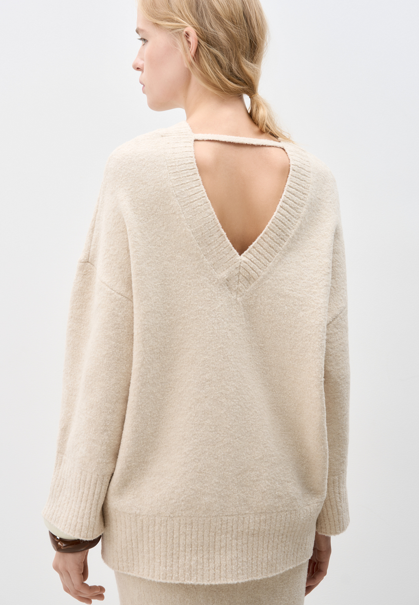 Трикотажный джемпер из буклированной пряжи. Модель свободного силуэта с длинным рукавом и глубоким вырезом на спине. Края изделия выполнены в рубчик. Дополнить образ можно юбкой в таком же стиле.