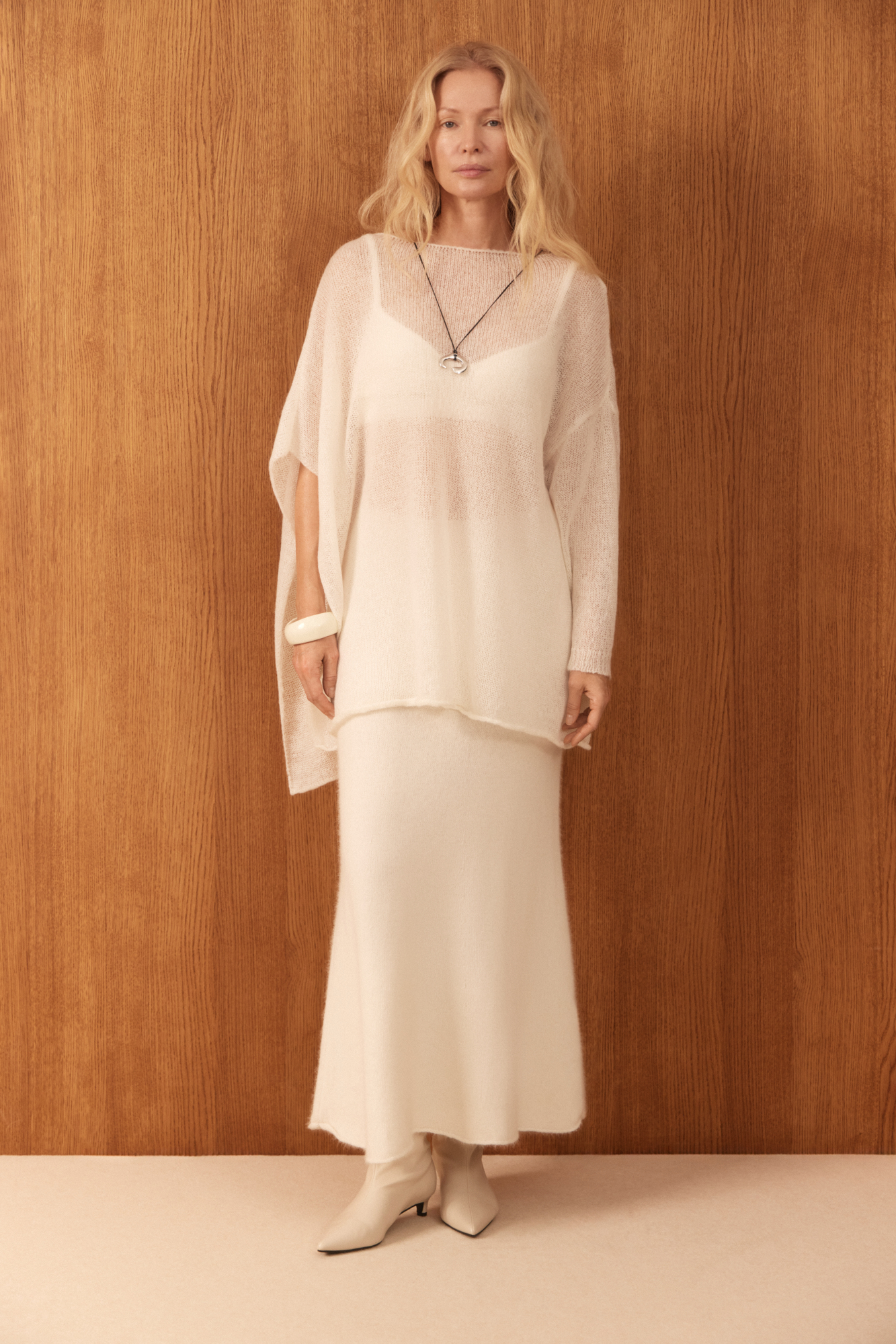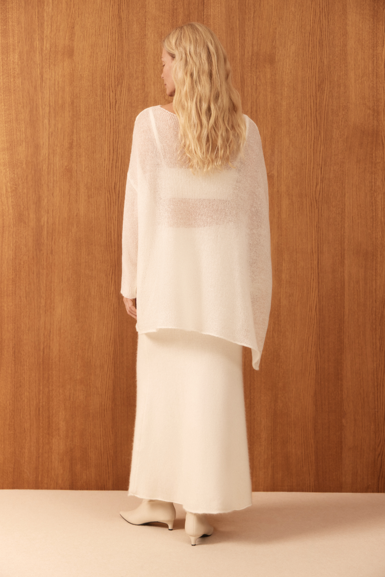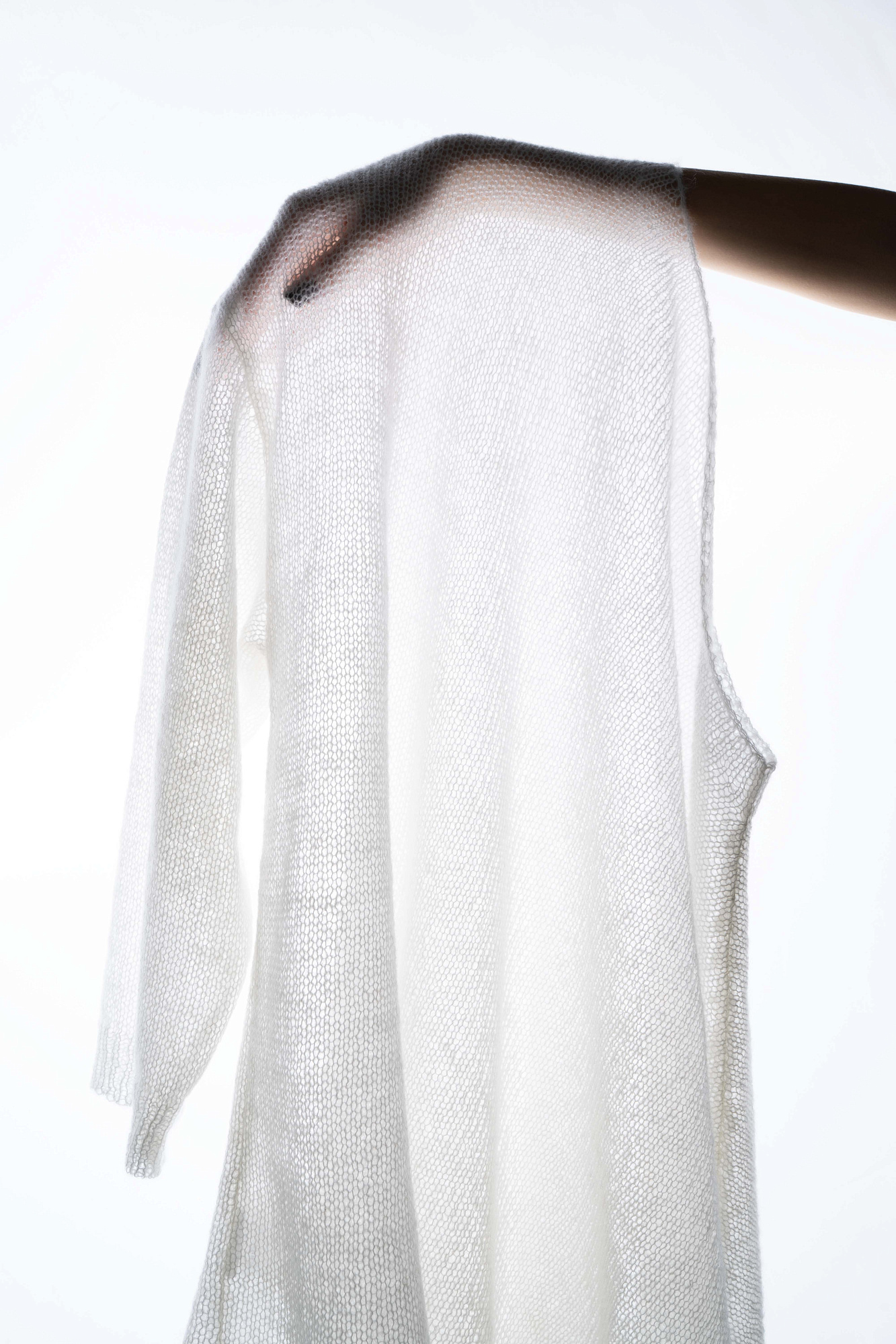 Полупрозрачный трикотажный джемпер из шерсти с добавлением мохера. Модель асимметричного силуэта с одним длинным рукавом и круглым вырезом горловины.