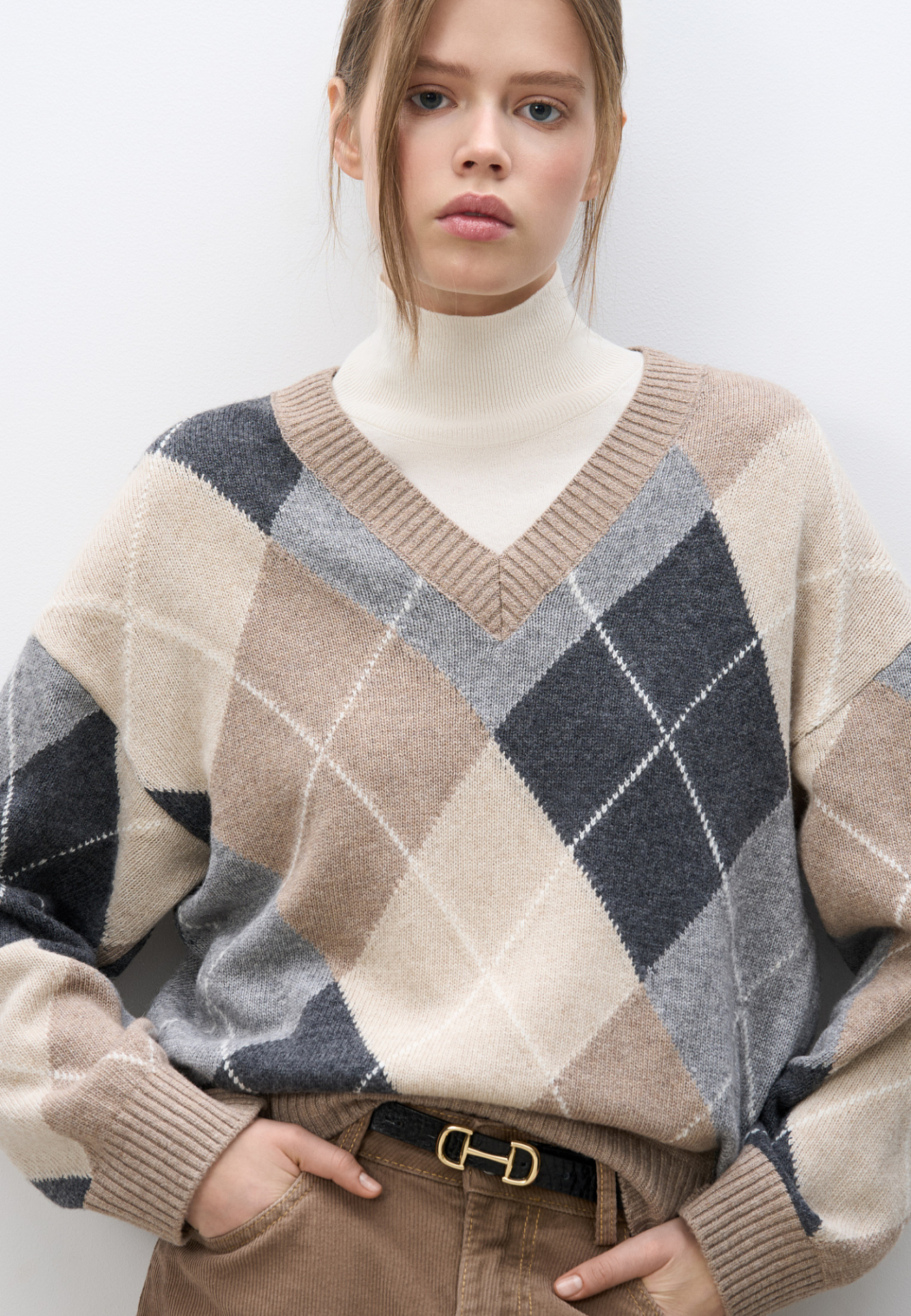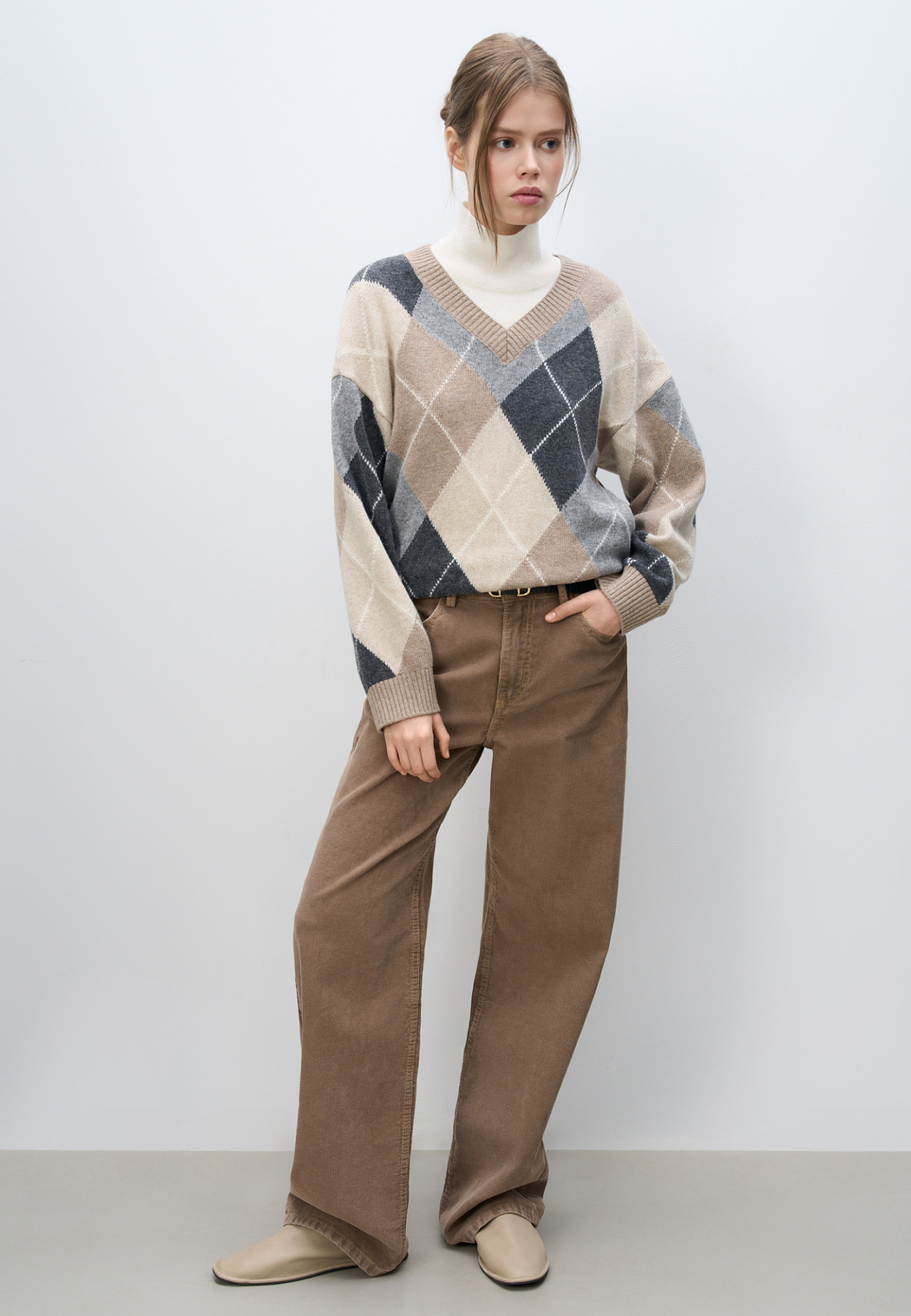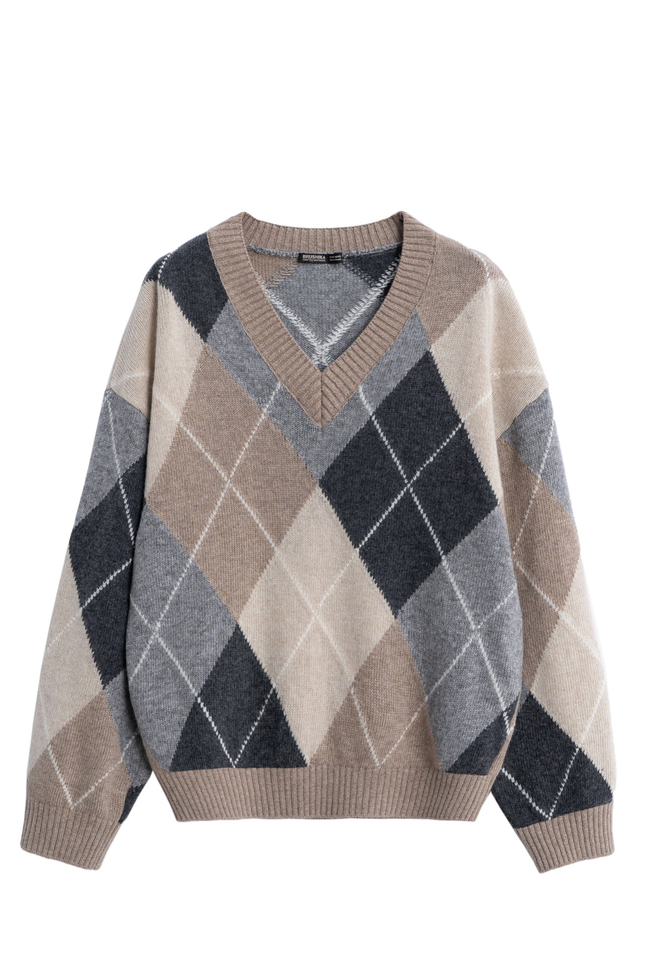 Трикотажный джемпер из кашемира с узором аргайл. Модель свободного силуэта, со спущенной линией плеча и V-вырезом горловины. Края изделия выполнены в рубчик.