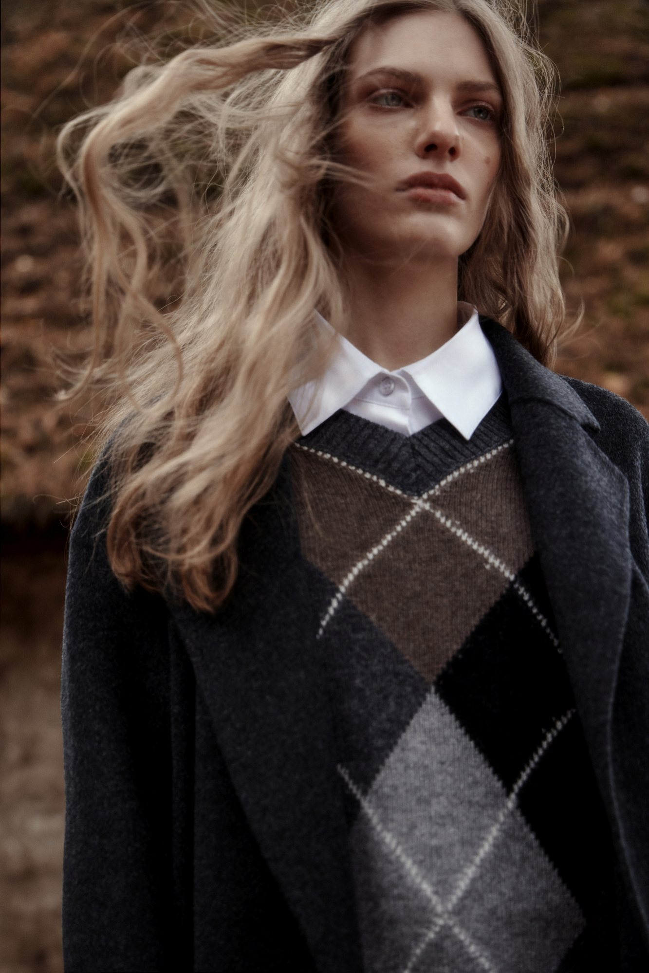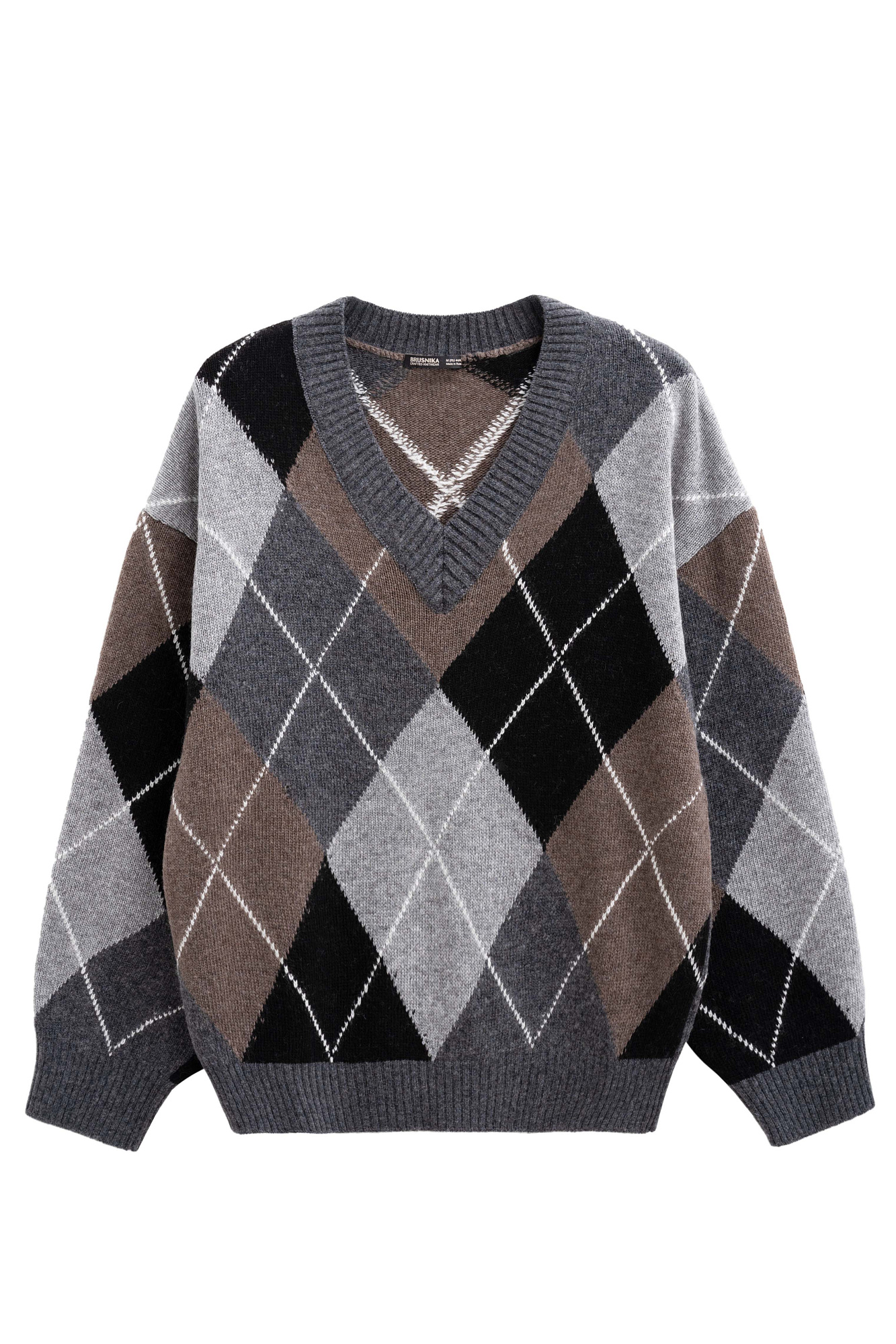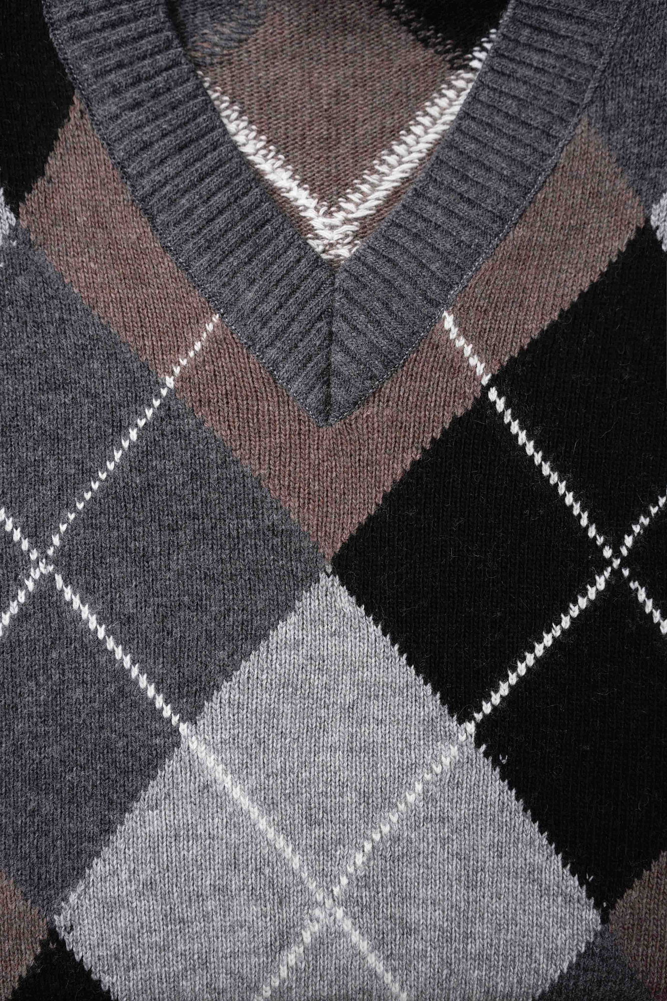 Трикотажный джемпер из кашемира с узором аргайл. Модель свободного силуэта, со спущенной линией плеча и V-вырезом горловины. Края изделия выполнены в рубчик.