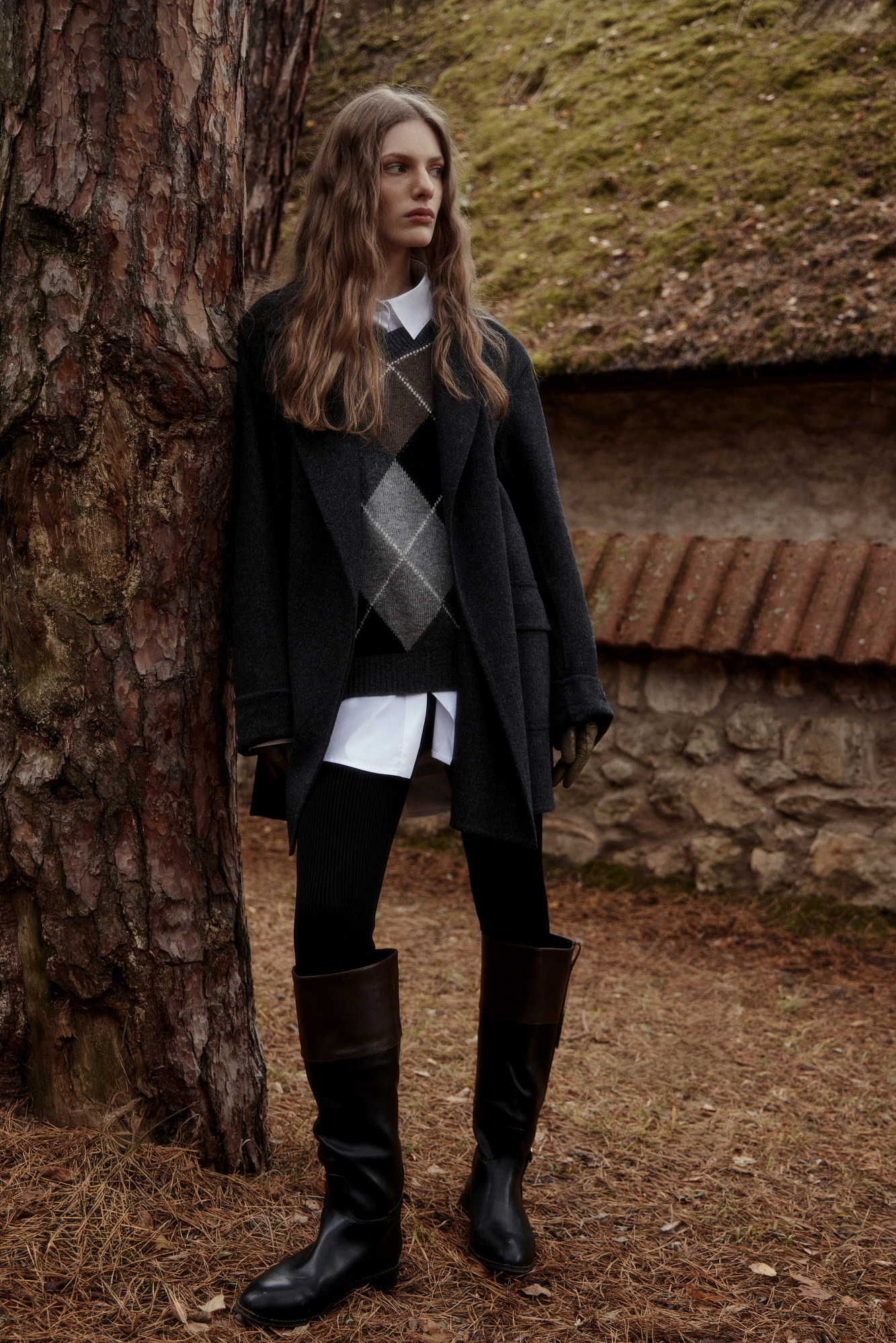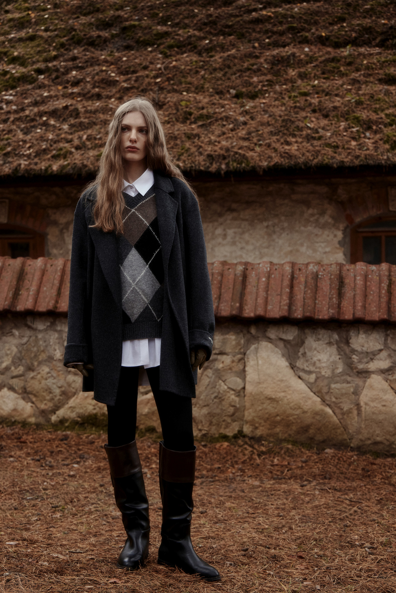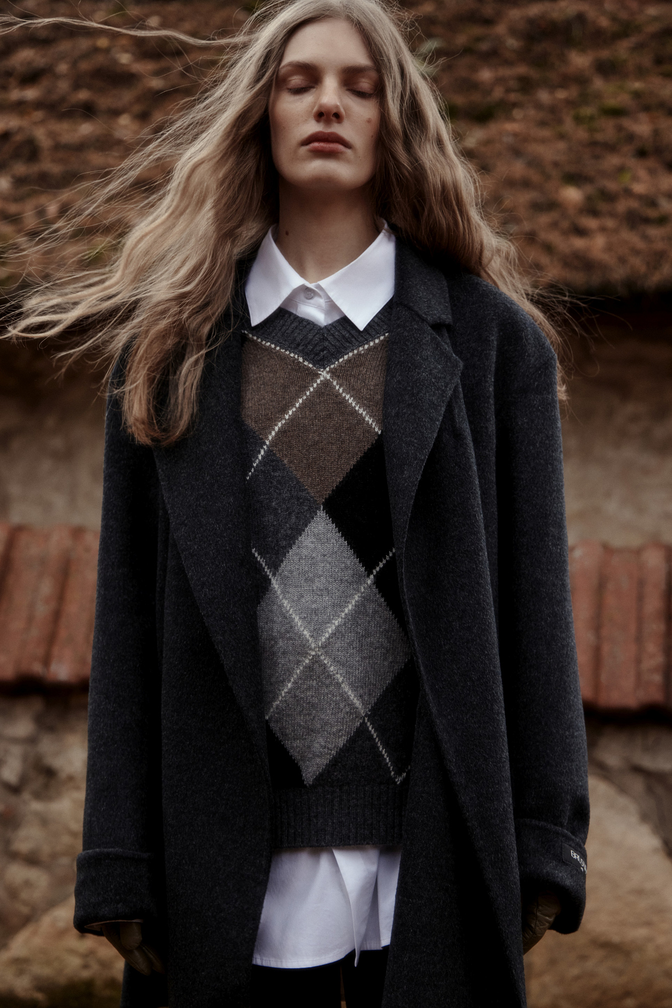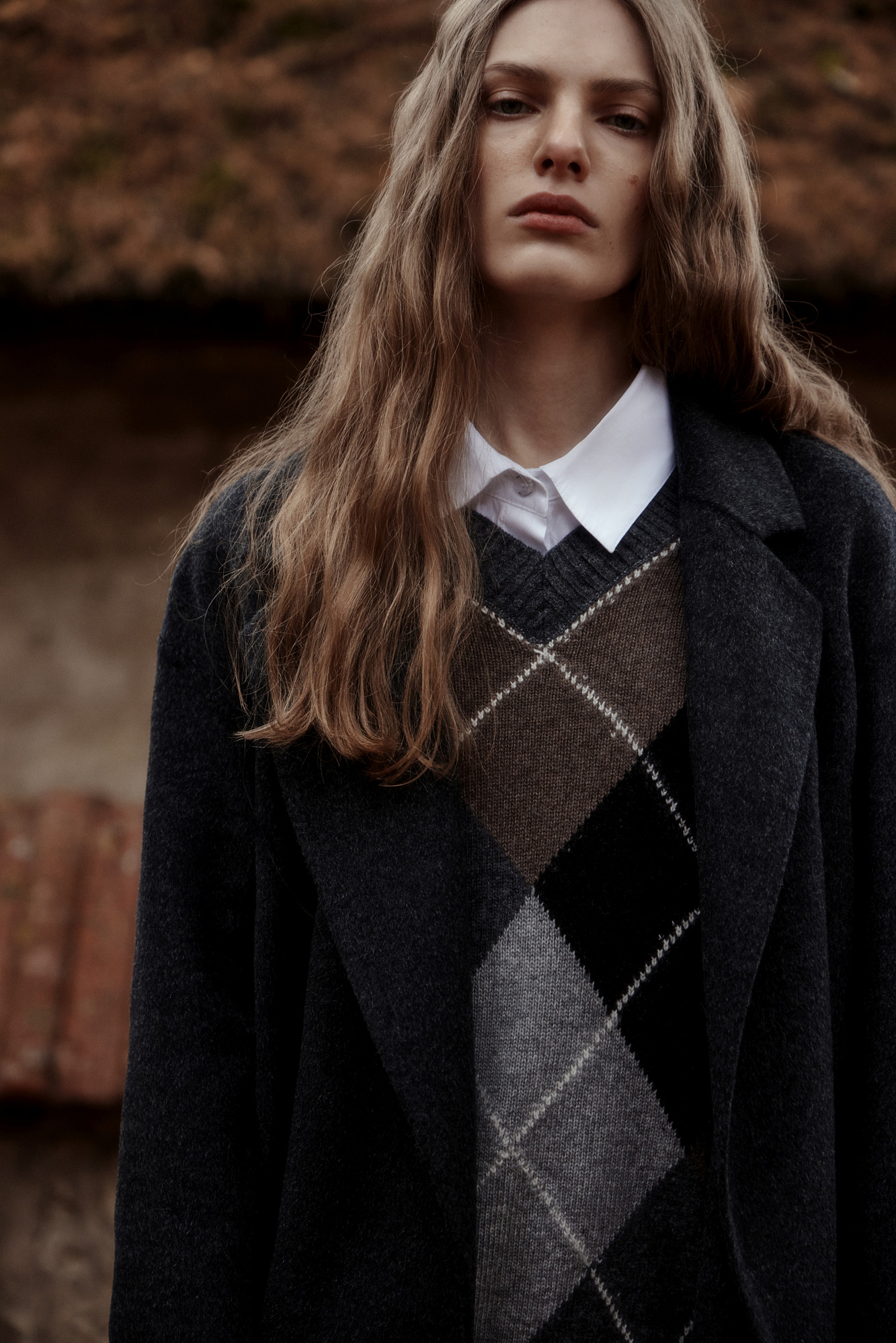 Трикотажный джемпер из кашемира с узором аргайл. Модель свободного силуэта, со спущенной линией плеча и V-вырезом горловины. Края изделия выполнены в рубчик.