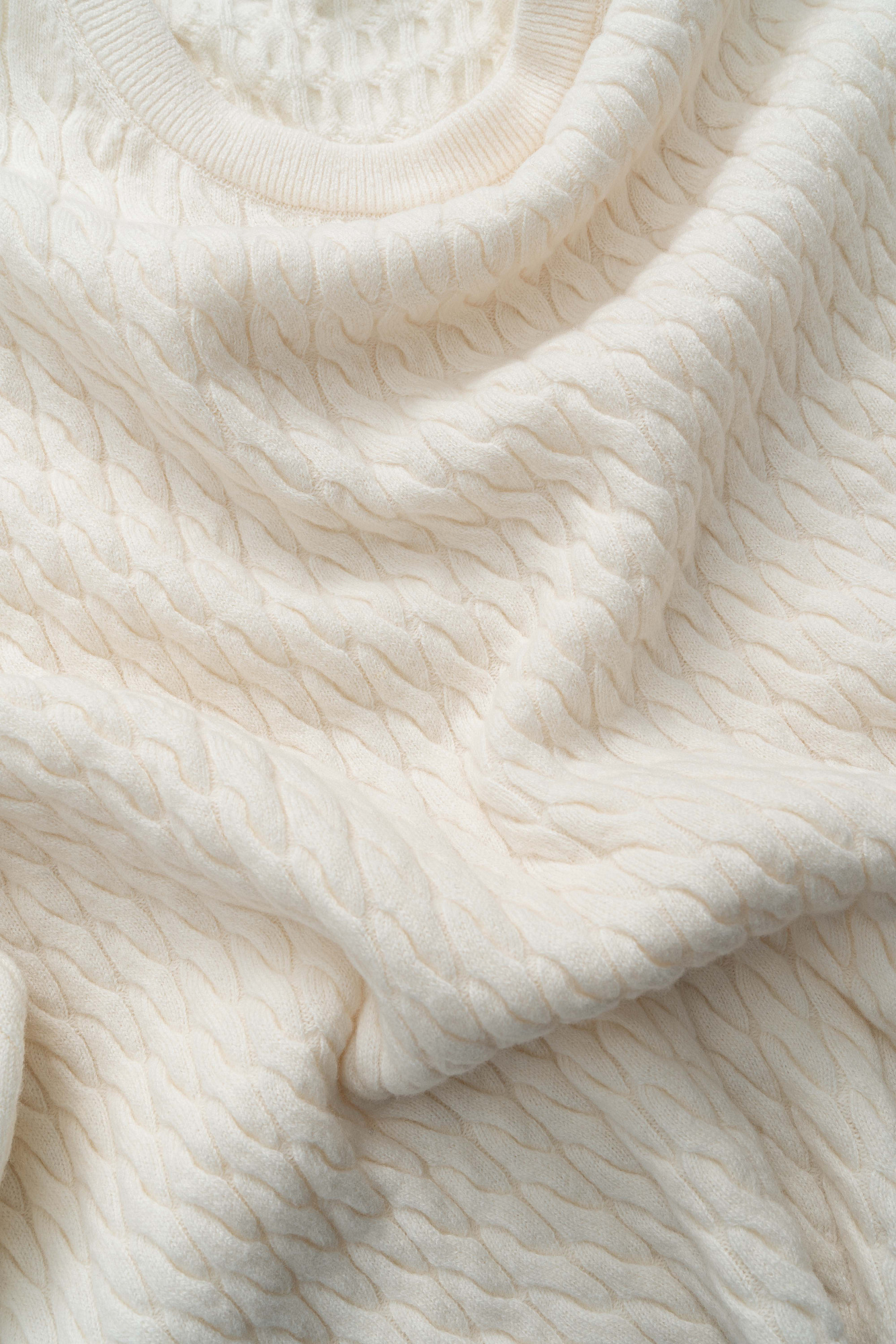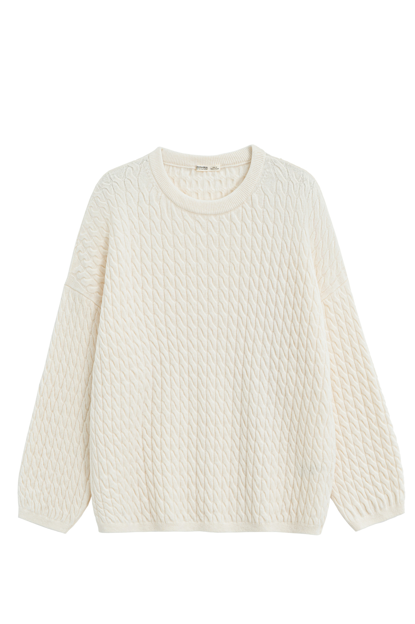 Трикотажный джемпер с объемными косами из 100% шерсти мериноса экстрафайн. Модель свободного силуэта, со спущенной линией плеч и круглым вырезом горловины, оформленным двойной бейкой. Края изделия выполнены в мелкий рубчик.