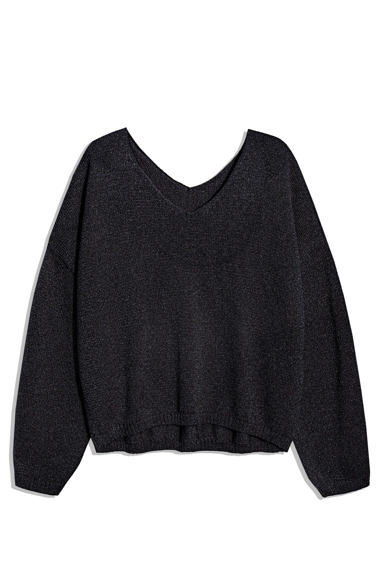 Джемпер из вискозы с добавлением люрекса. Модель свободного силуэта, со спущенной линией плеч и V-образным вырезом. Манжеты рукавов и низ изделия выполнены в рубчик.