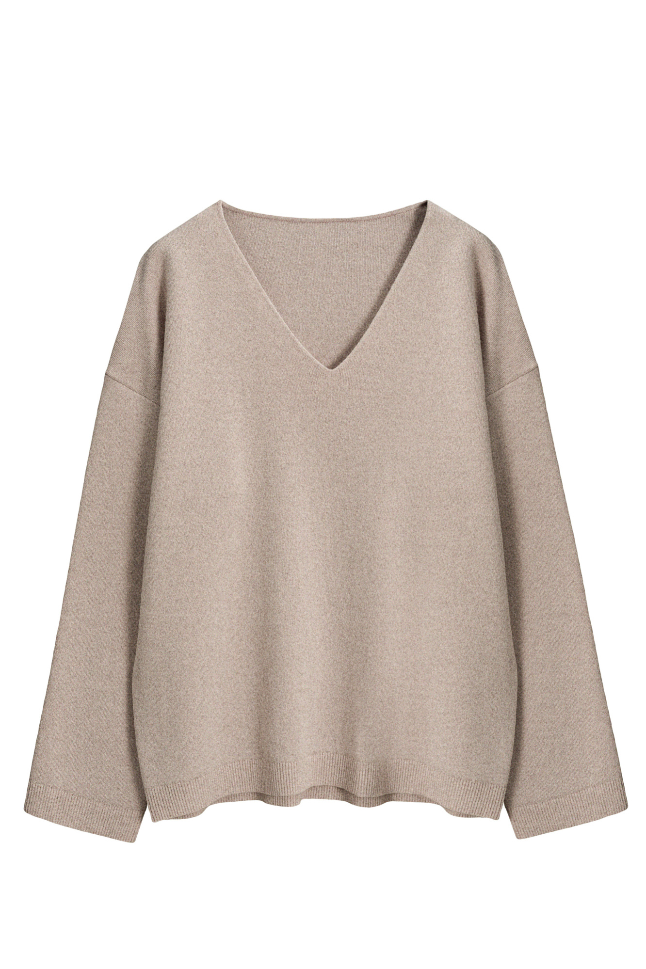 Трикотажный джемпер из шерсти с добавлением кашемира. Модель свободного силуэта со спущенной линией плеч и V-образным вырезом горловины. Манжеты рукавов и низ изделия выполнены в рубчик.