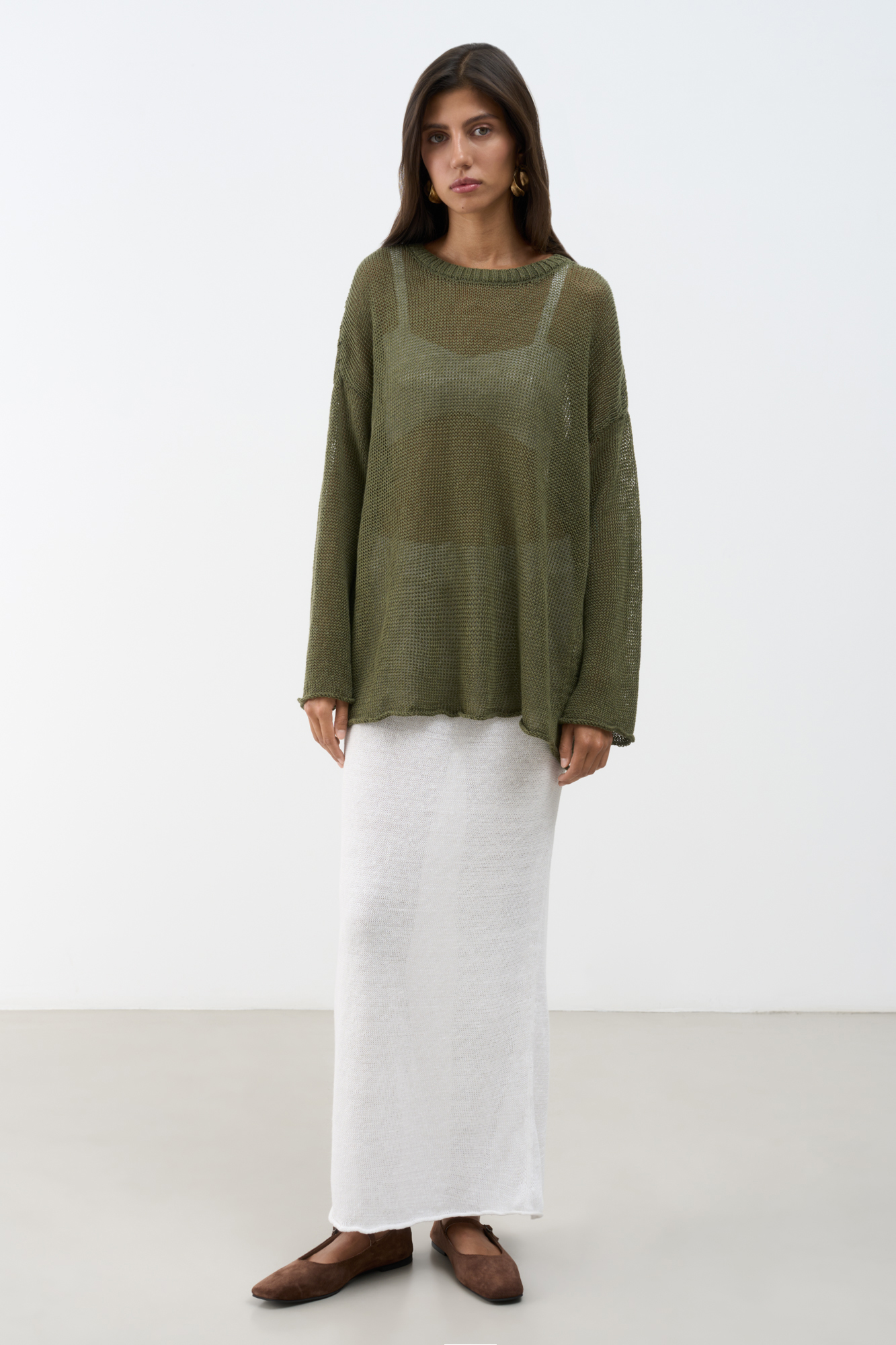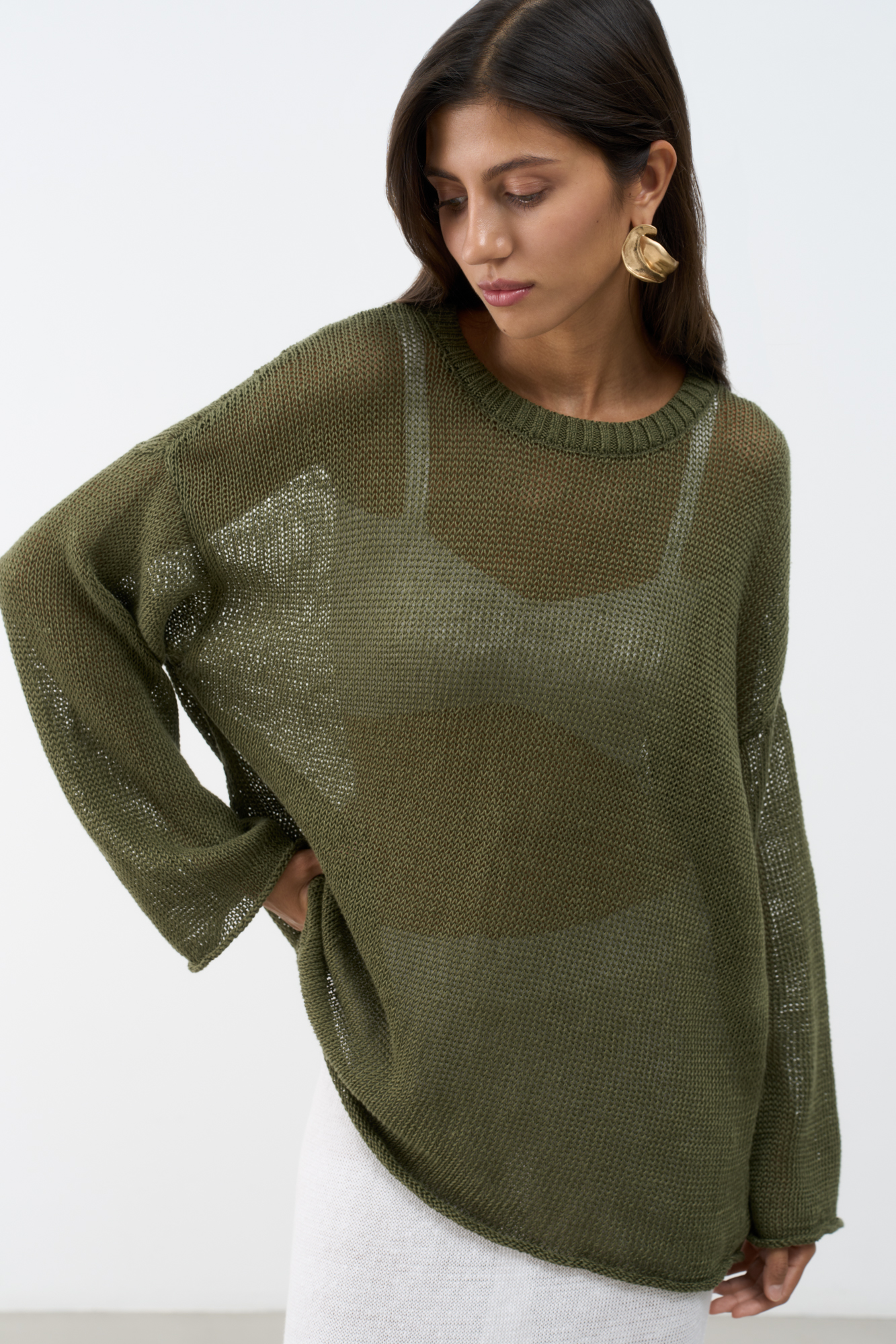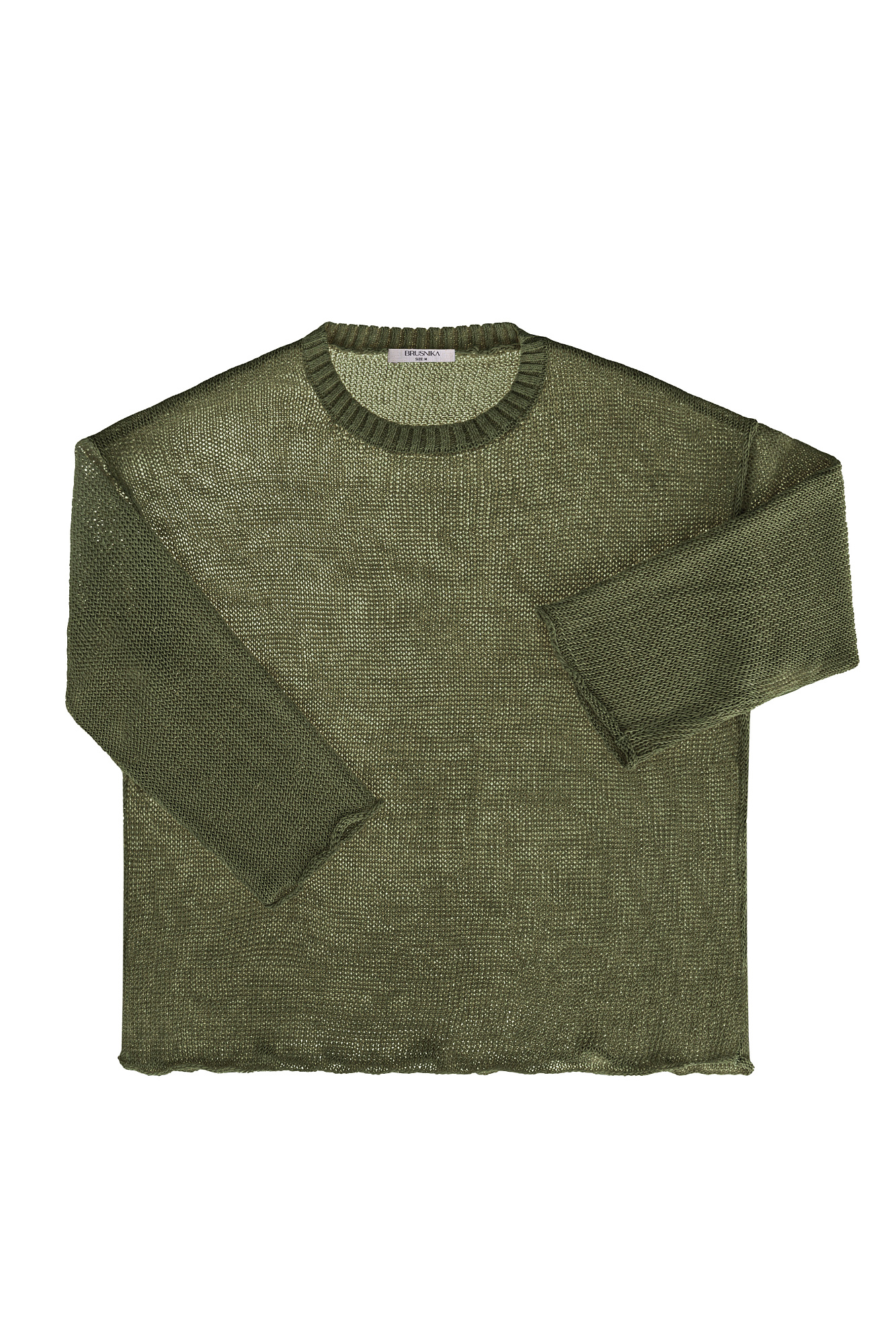 Полупрозрачный джемпер из 100% льна. Модель свободного силуэта со спущенной линией плеча и круглым вырезом горловины.