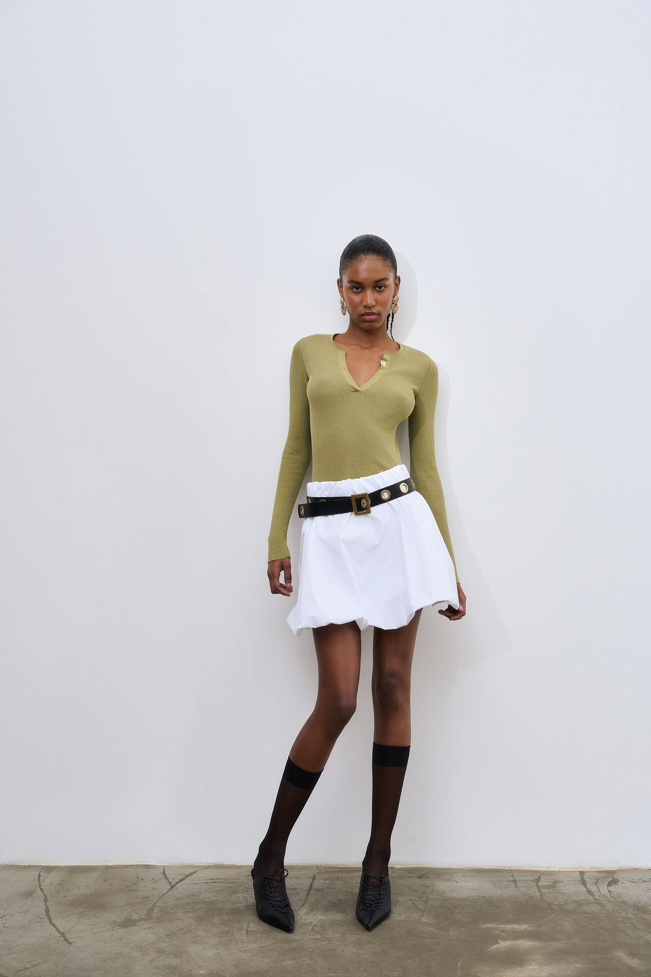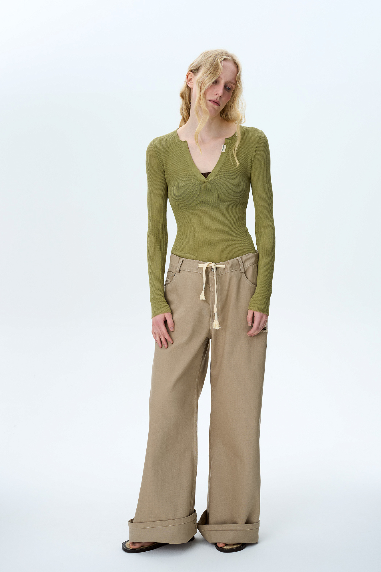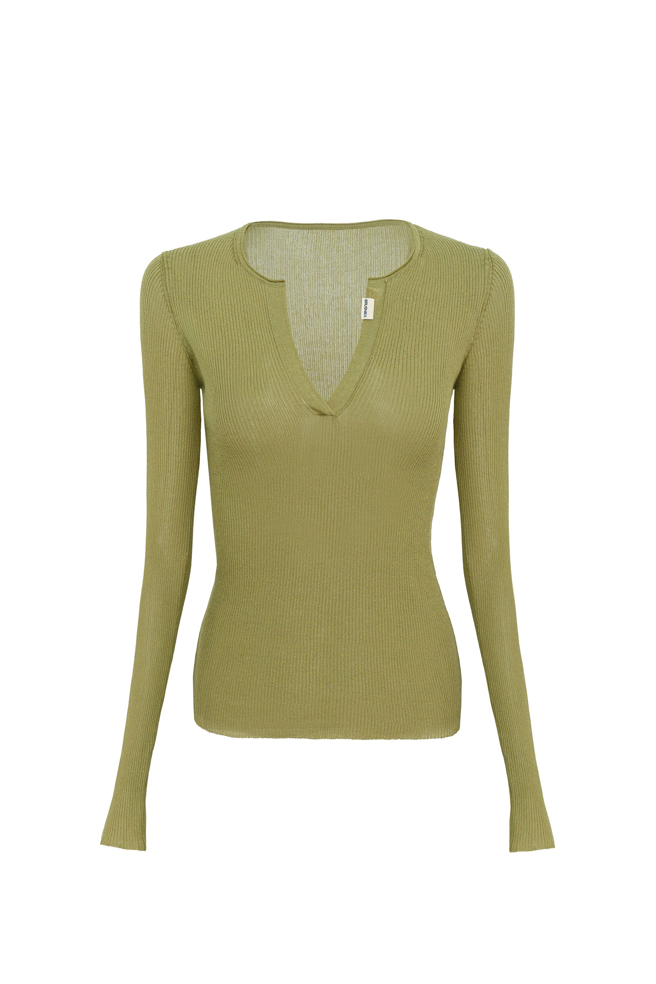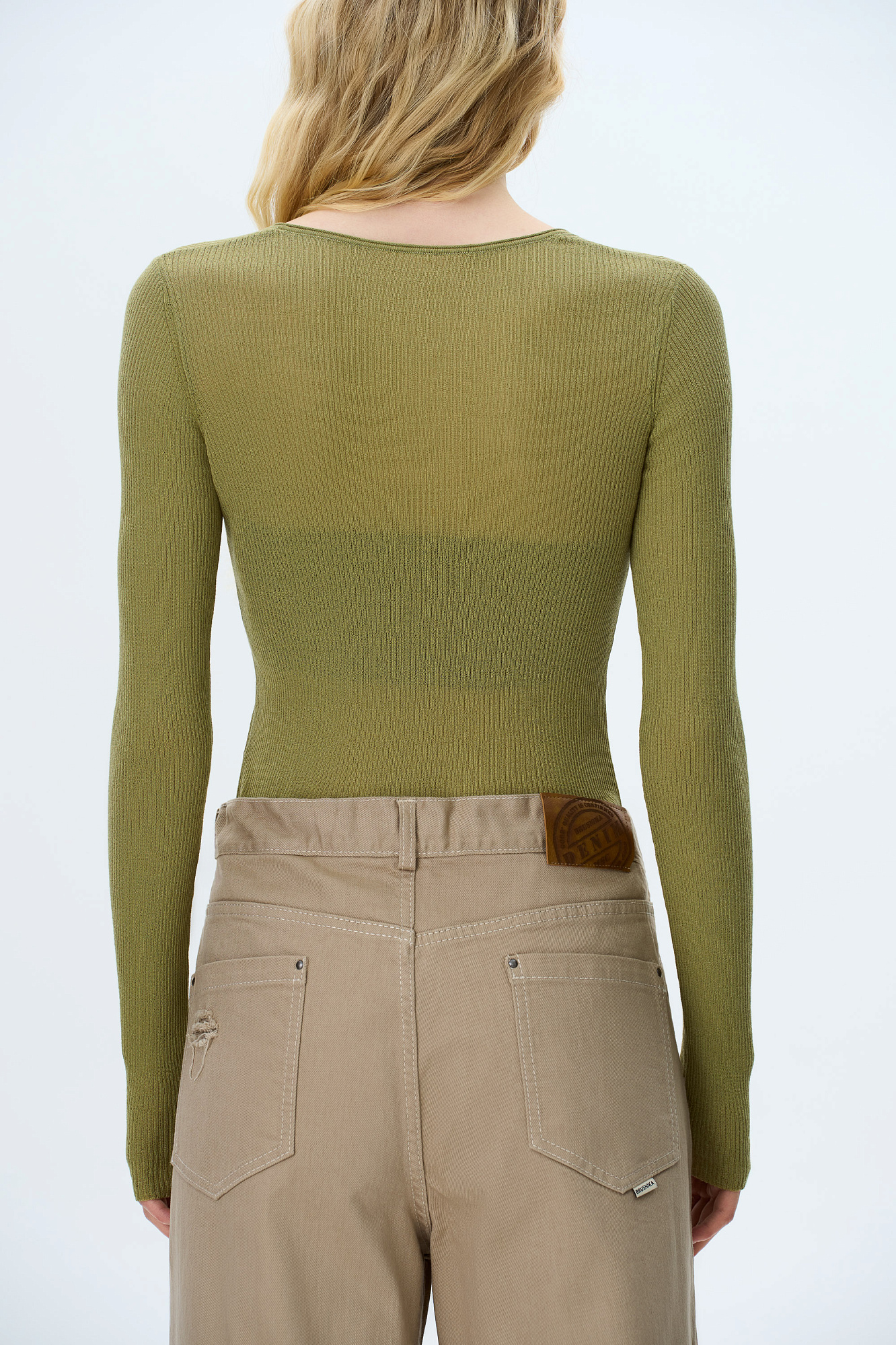 Трикотажный полупрозрачный лонгслив из хлопка с добавлением полиамида. Модель приталенного силуэта с длинными рукавами, V-образным вырезом и брендированным ярлыком на планке.