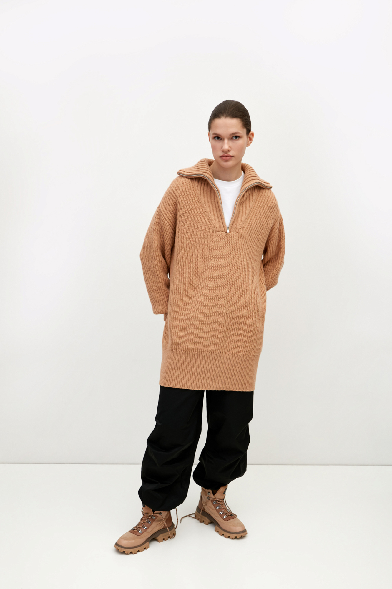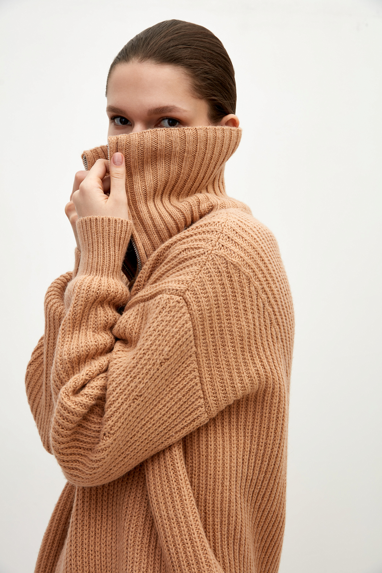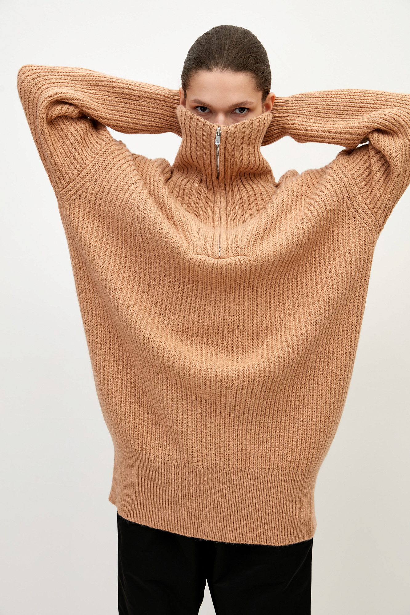 Удлиненный джемпер из шерсти альпака. Модель свободного силуэта со спущенным плечом и воротником-стойкой. Застежка на молнию.