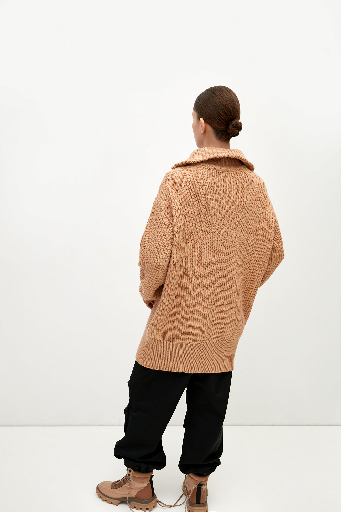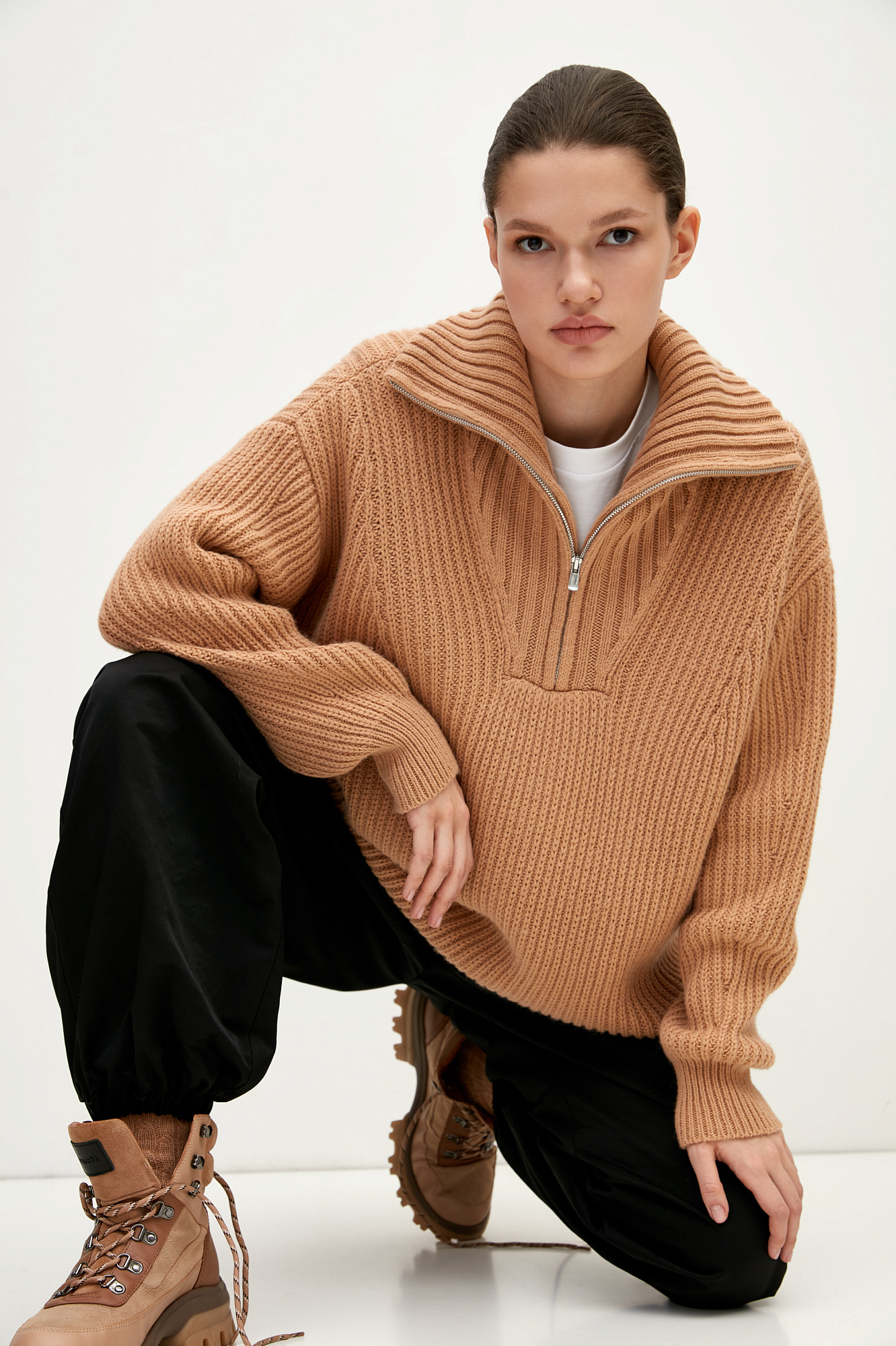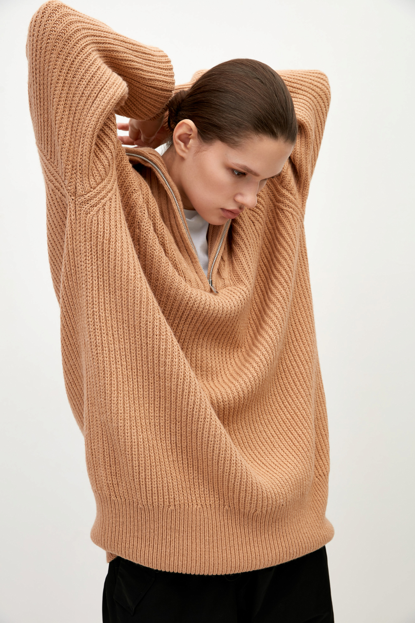 Удлиненный джемпер из шерсти альпака. Модель свободного силуэта со спущенным плечом и воротником-стойкой. Застежка на молнию.