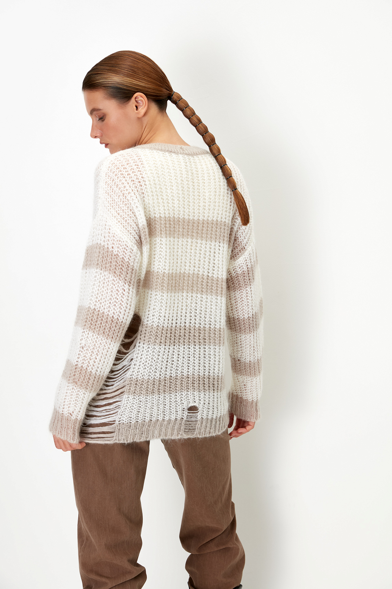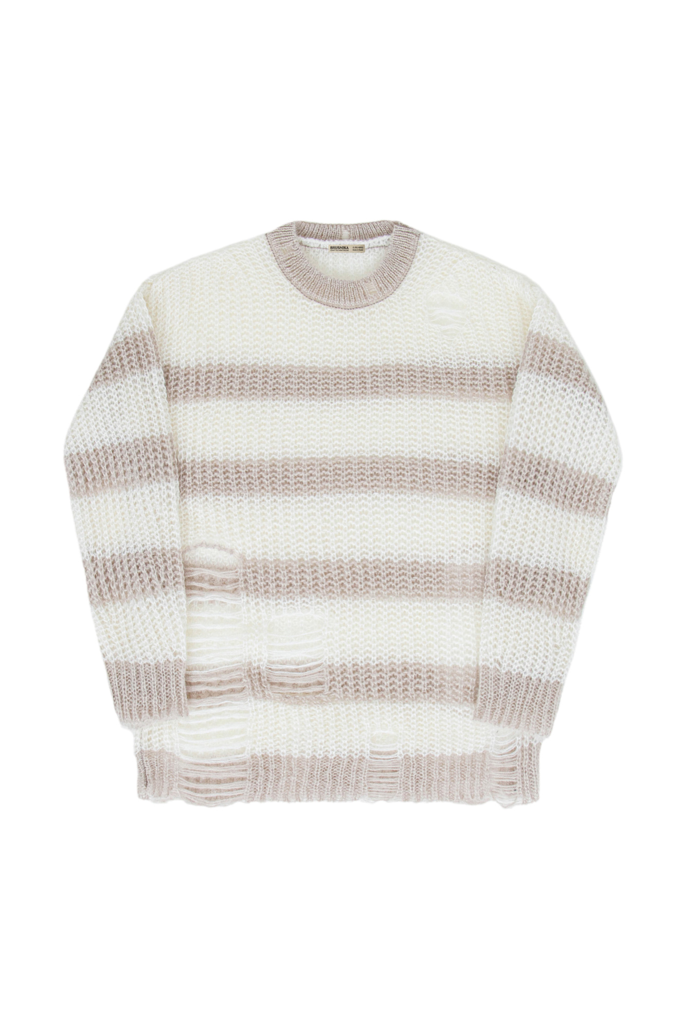 Трикотажный полосатый джемпер из шерсти с добавлением мохера в стиле гранж. Модель свободного силуэта со спущенной линией плеч и круглым вырезом горловины. Изделие выполнено с эффектом рваности.