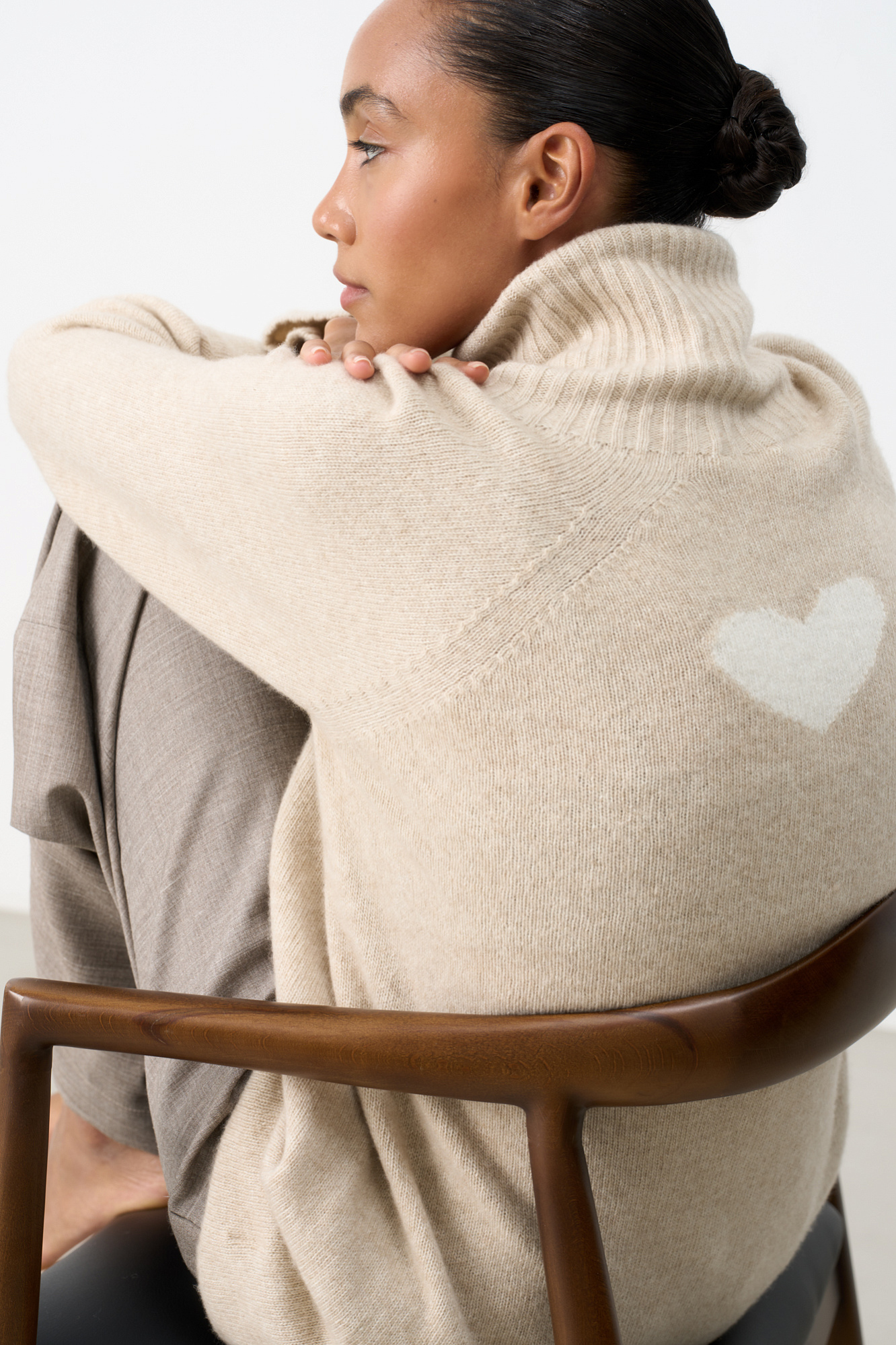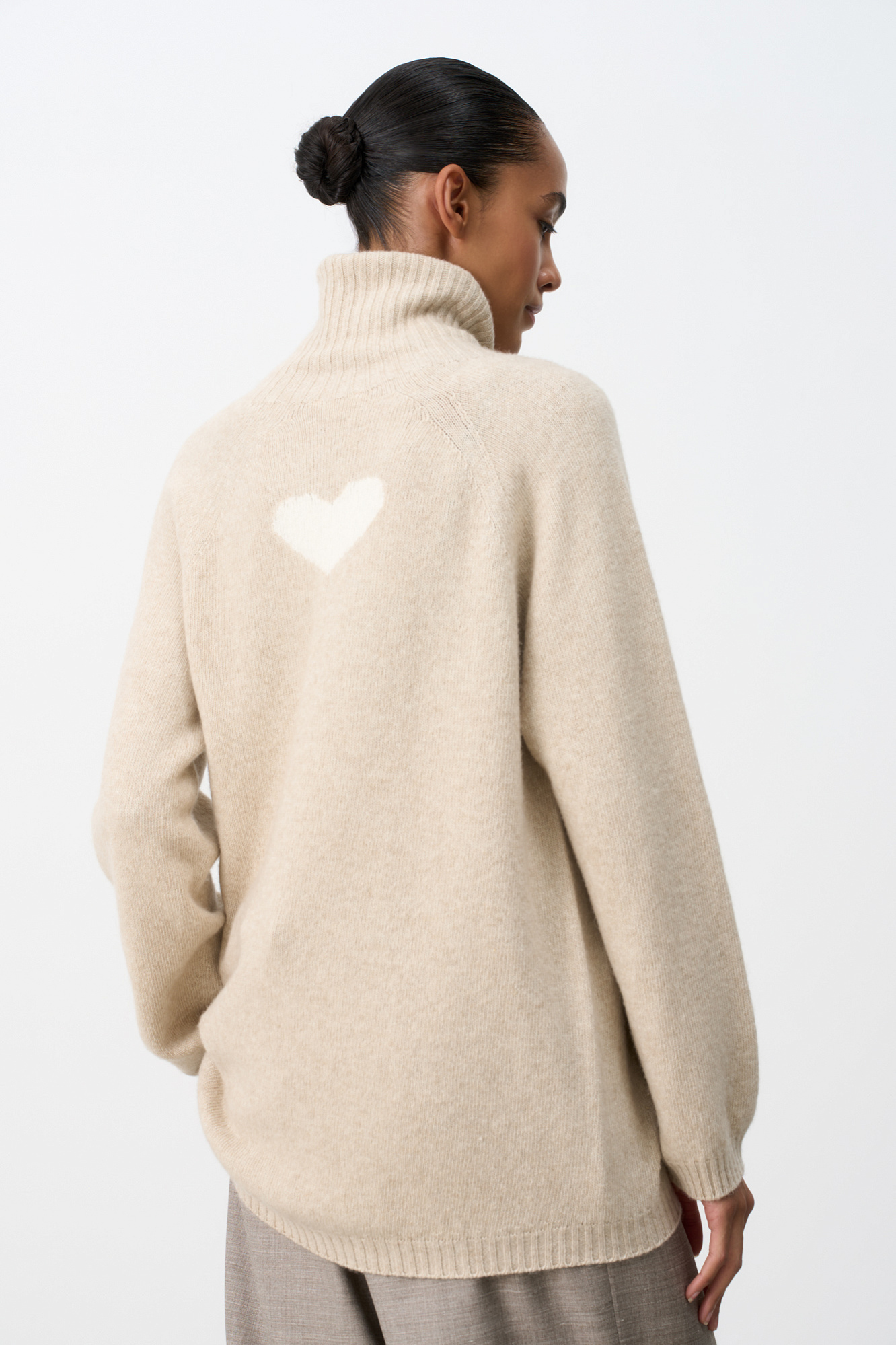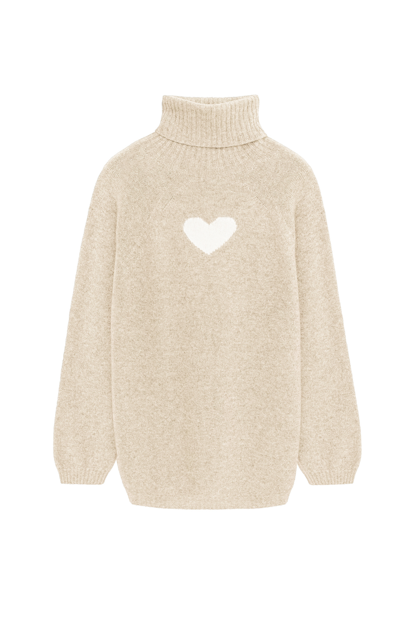 Трикотажный oversize джемпер из шерсти с добавлением кашемира. Высокий воротник в рубчик, спущенный рукав и удлиненная спинка с жаккардовым рисунком в виде сердца.