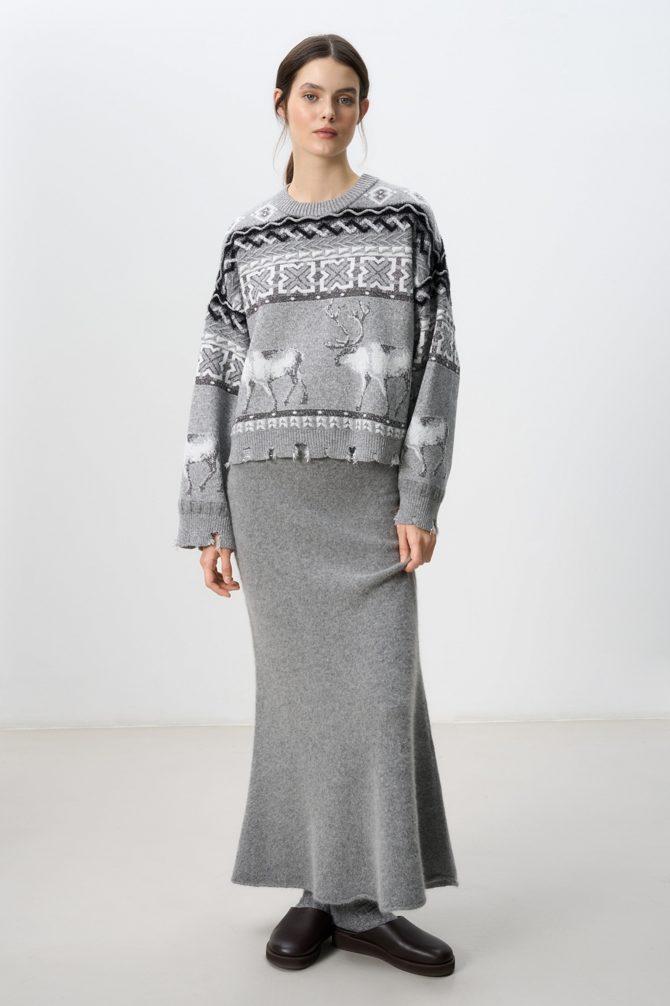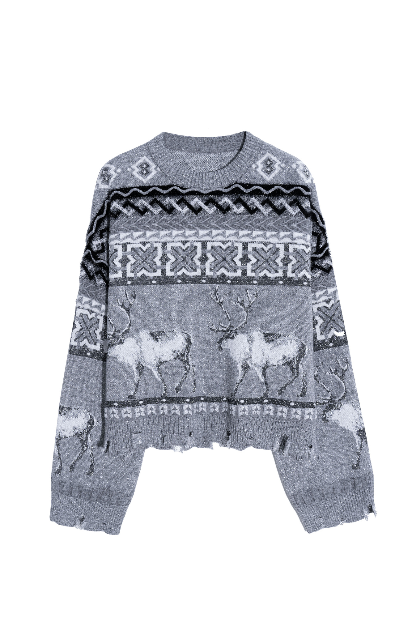 Укороченный трикотажный джемпер с добавлением кашемира с жаккардовым узором в виде оленей и орнамента. Модель со спущенной линией плеча и круглым вырезом горловины. Декорировано люрексом. Манжеты рукавов и низ изделия с рваным краем.
