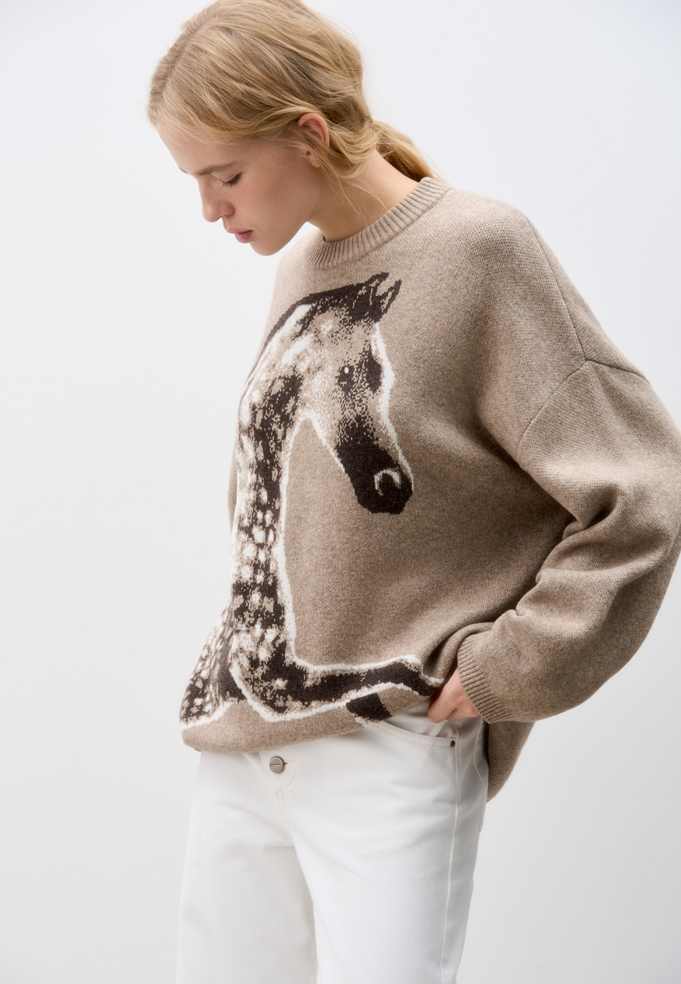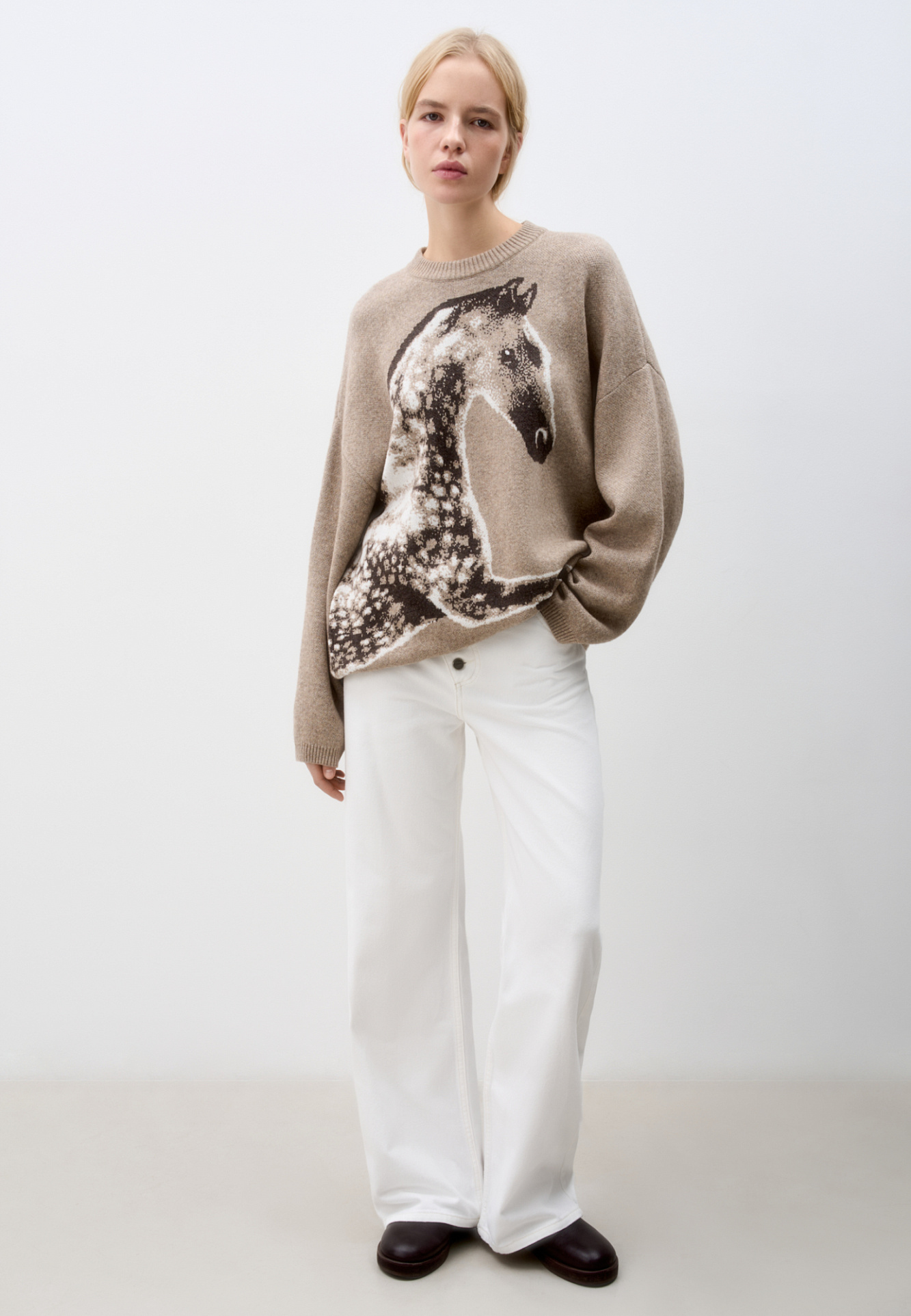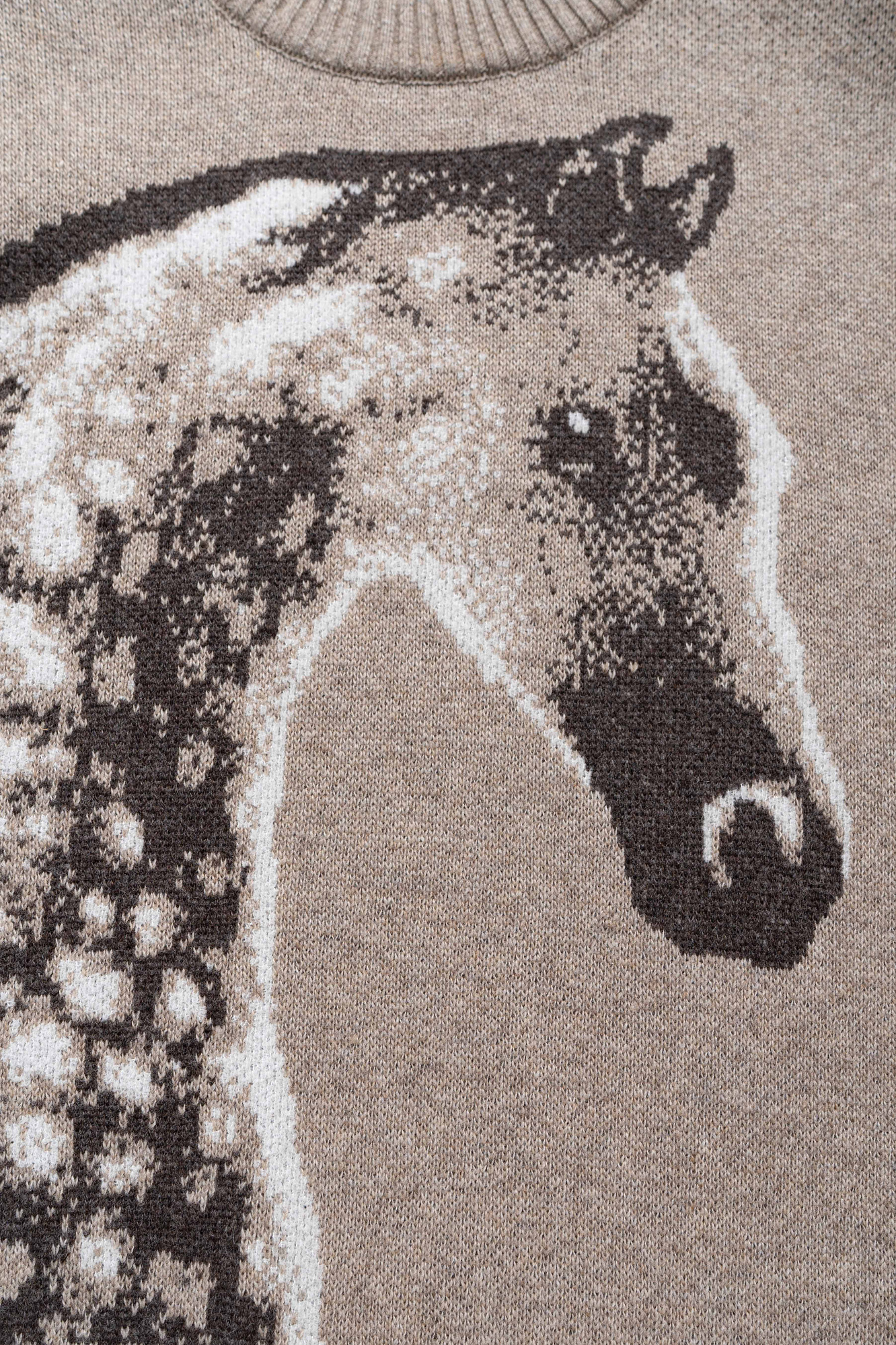 Трикотажный джемпер из шерсти и кашемира. Модель свободного силуэта со спущенной линией плеч, круглым вырезом горловины и жаккардовым анималистичным принтом лошади. Края изделия выполнены в рубчик.