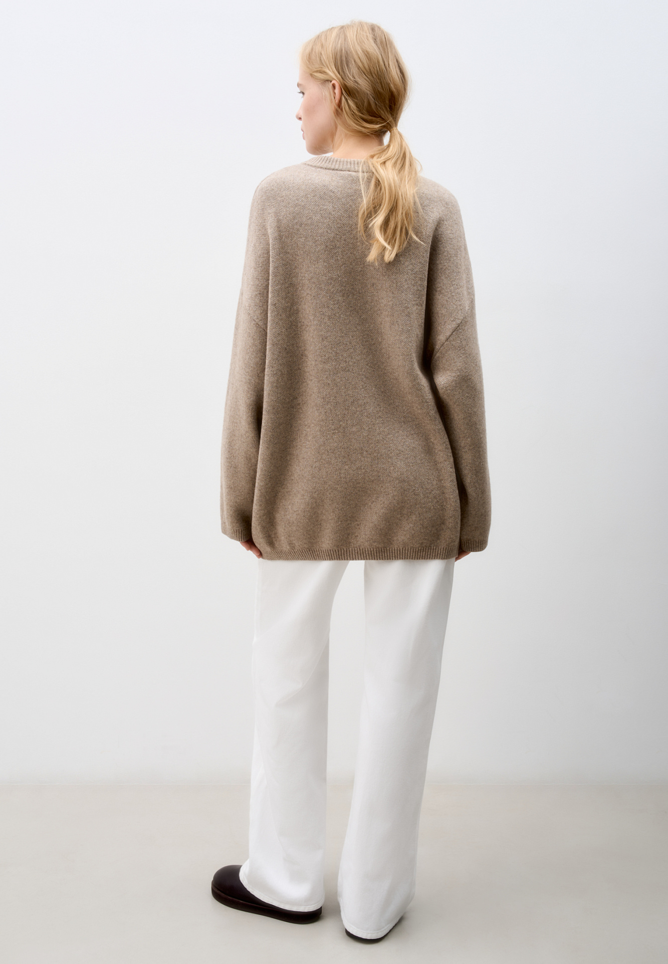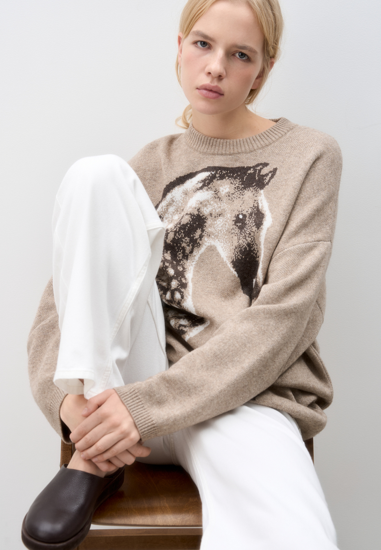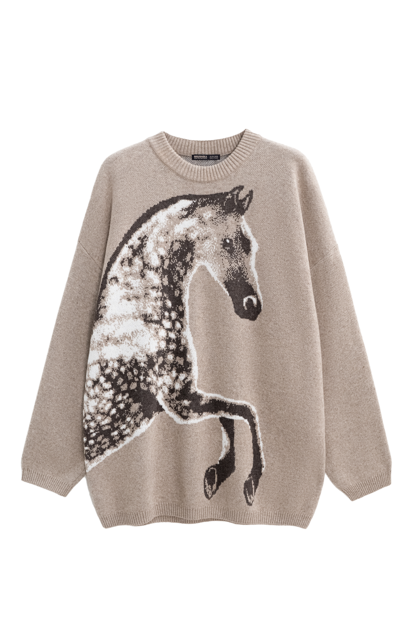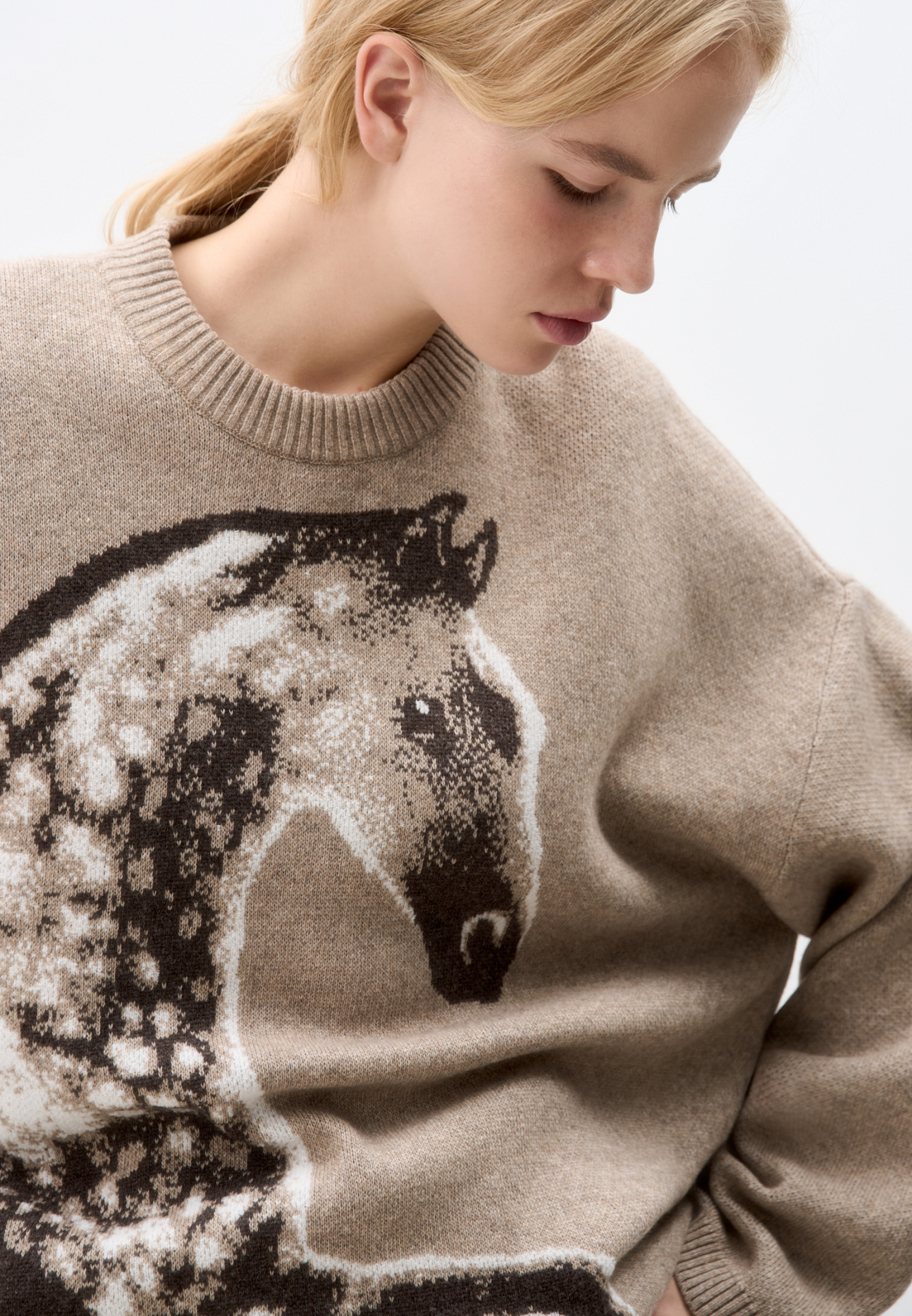 Трикотажный джемпер из шерсти и кашемира. Модель свободного силуэта со спущенной линией плеч, круглым вырезом горловины и жаккардовым анималистичным принтом лошади. Края изделия выполнены в рубчик.