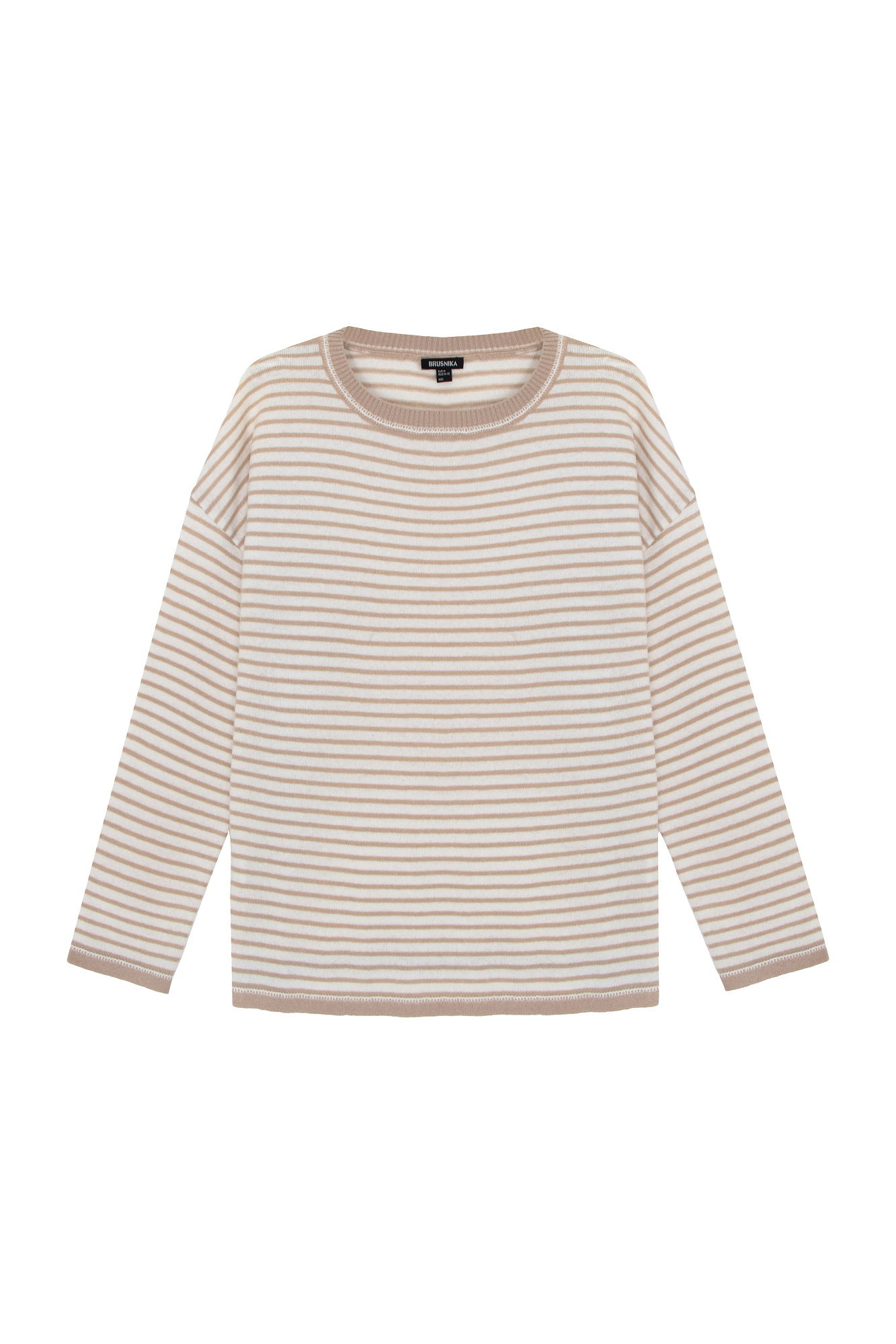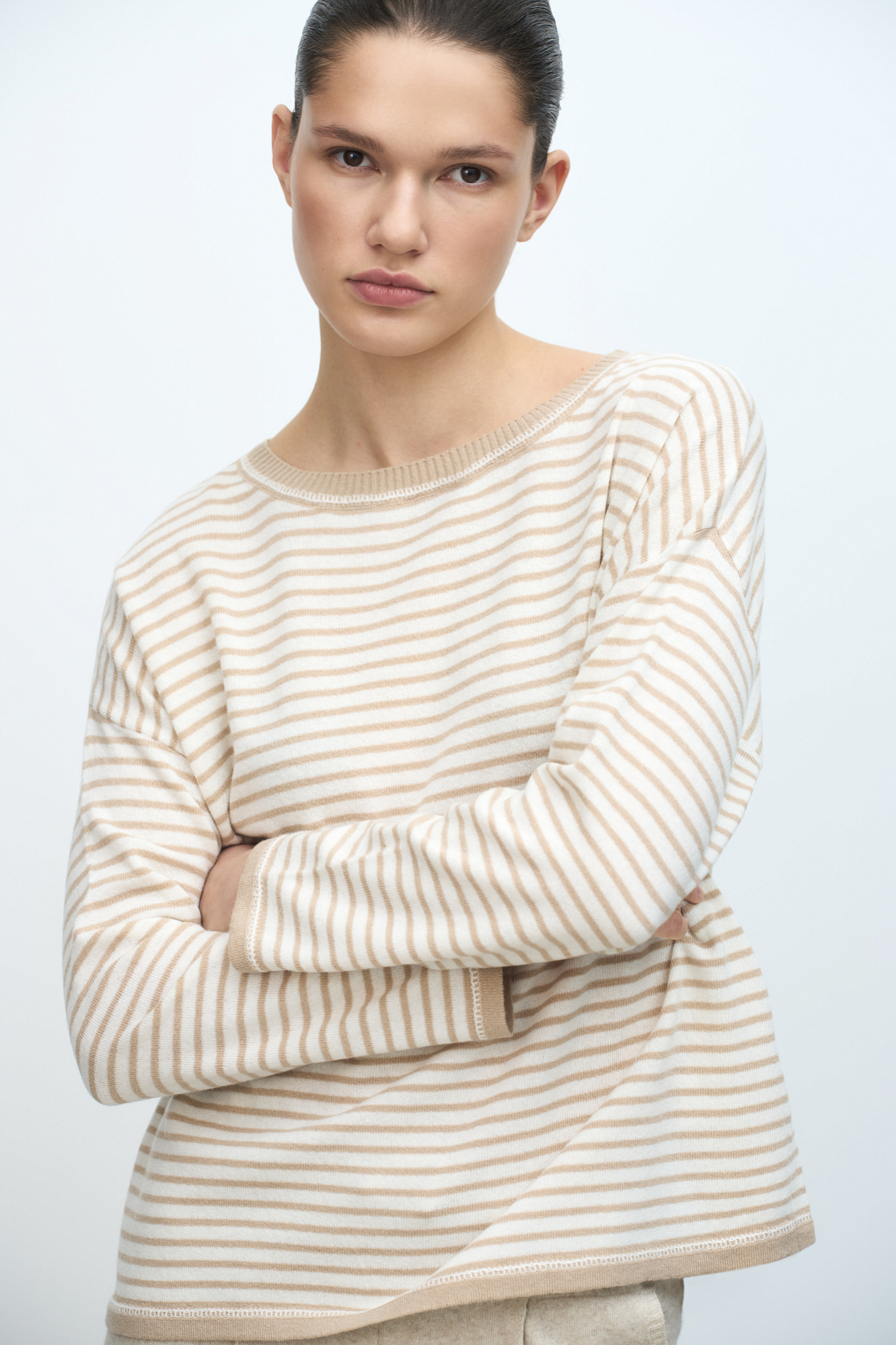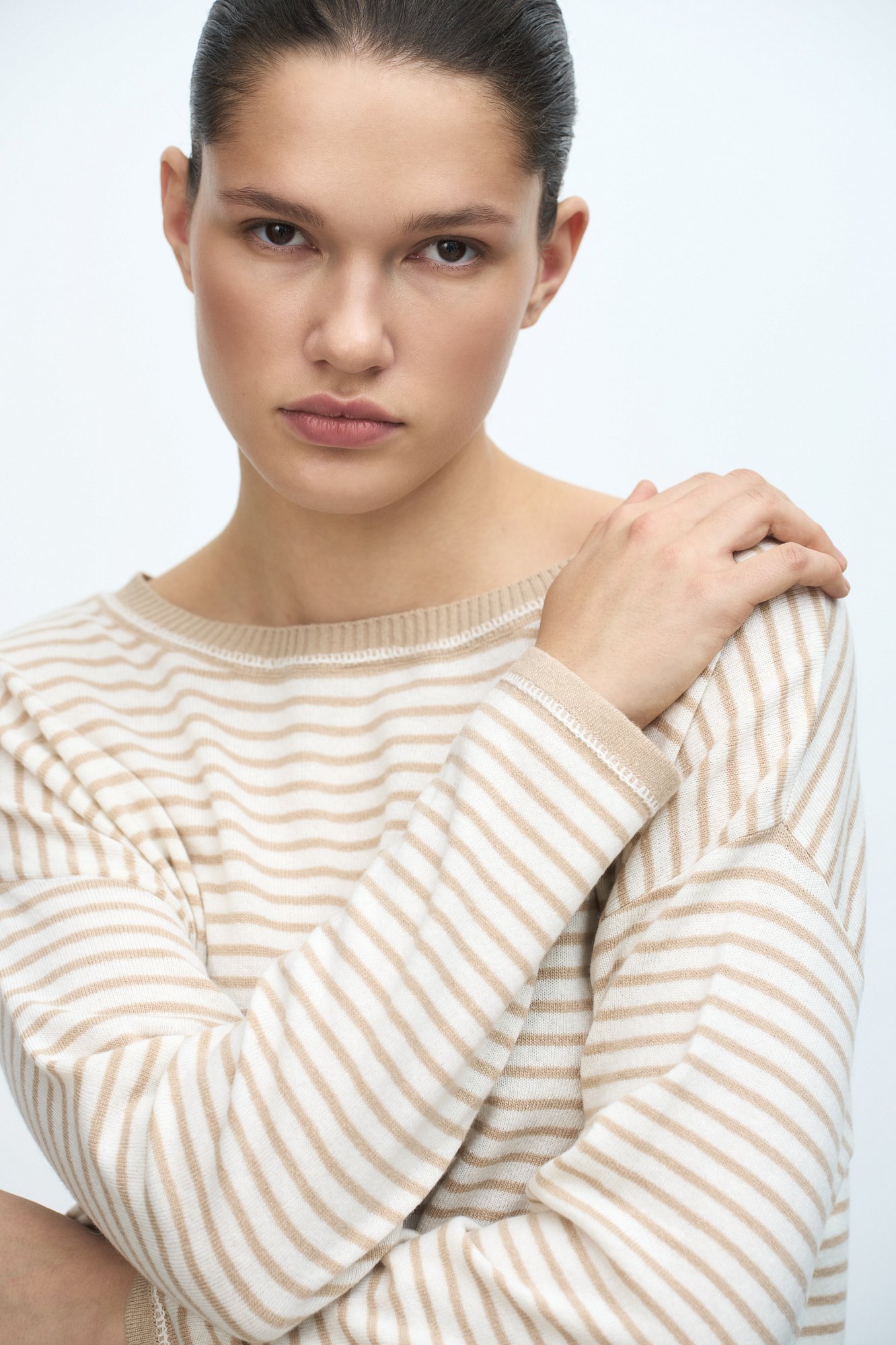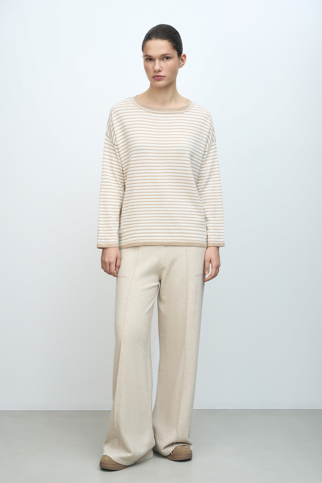 Трикотажный джемпер в полоску из шерсти с добавлением кашемира. Модель свободного силуэта со спущенной линией плеч и круглым вырезом горловины.