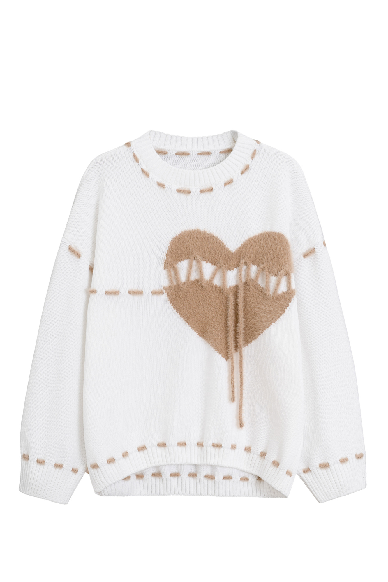 Трикотажный джемпер из хлопка. Модель свободного кроя со спущенной линией плеча и круглым вырезом горловины. Изделие декорировано крупным вывязанным сердцем и контрастной белой строчкой, имитирующей ручные стежки.