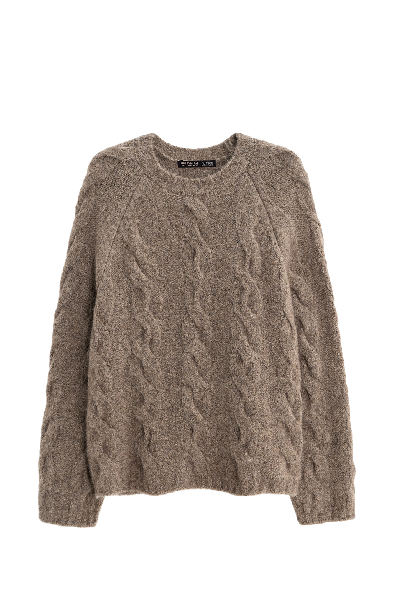 Трикотажный джемпер из шерсти и мохера. Модель свободного силуэта со спущенной линией плеч, объемными рукавами и круглым вырезом горловины. Изделие декорировано фактурной вязкой в виде кос. Края выполнены в рубчик.