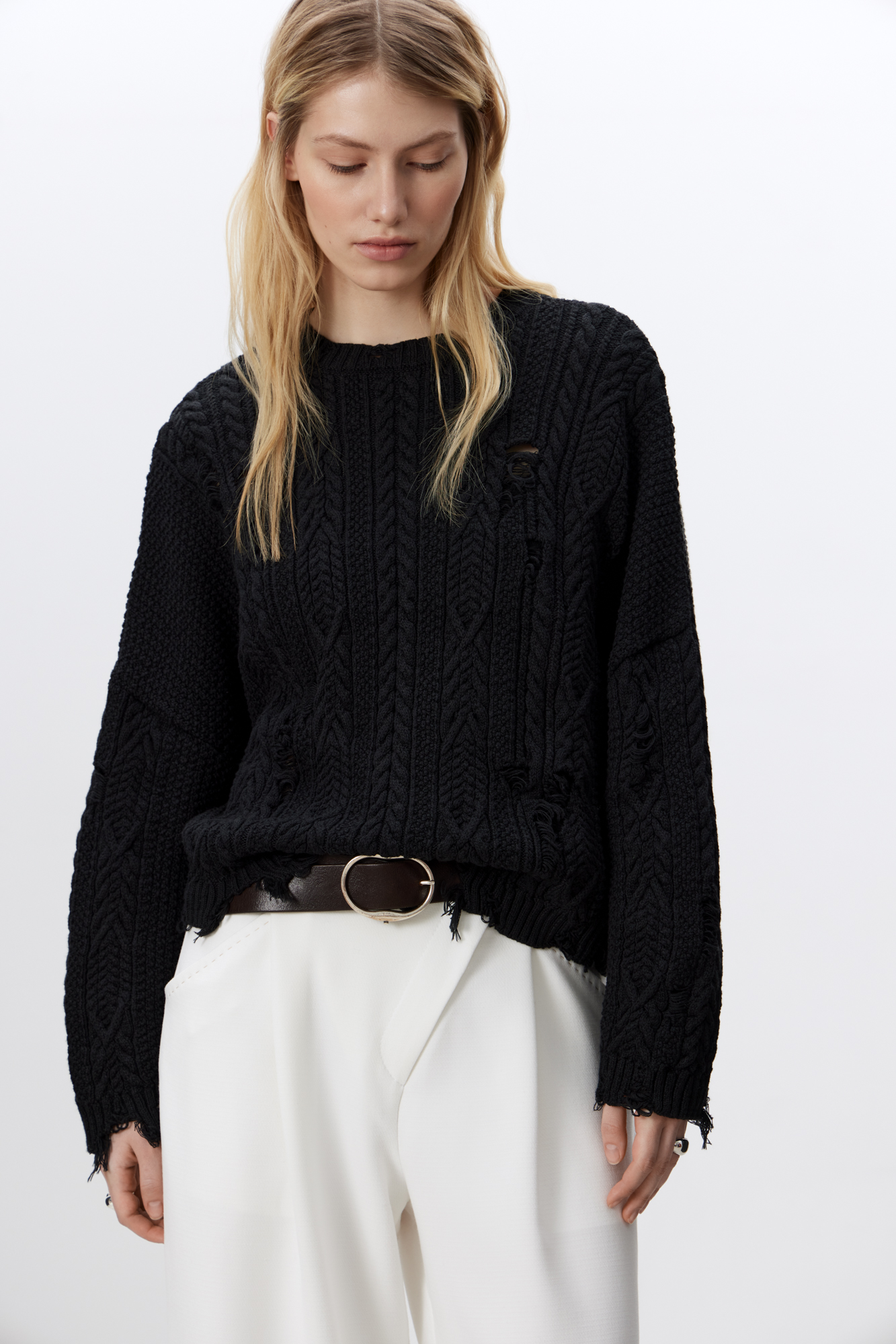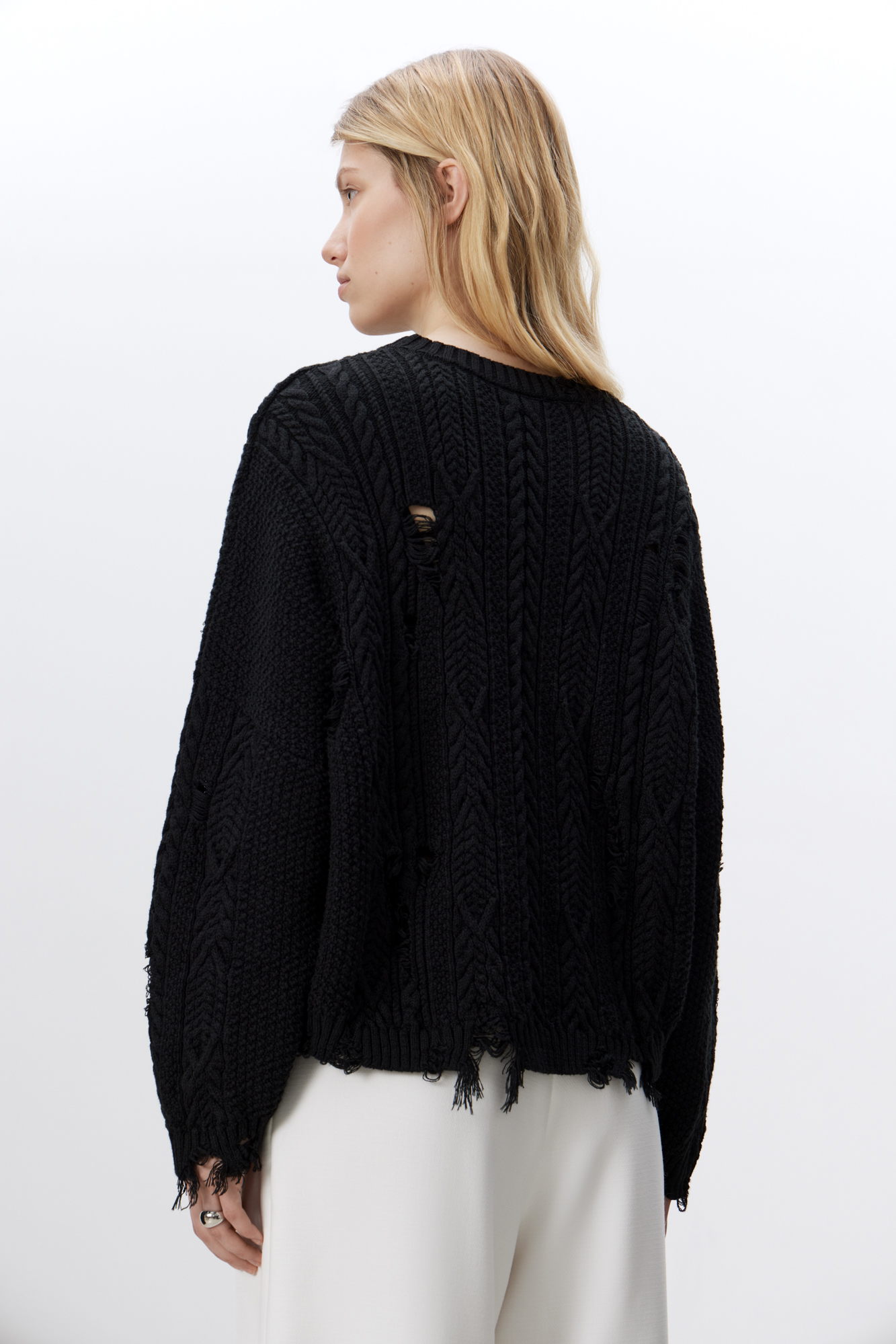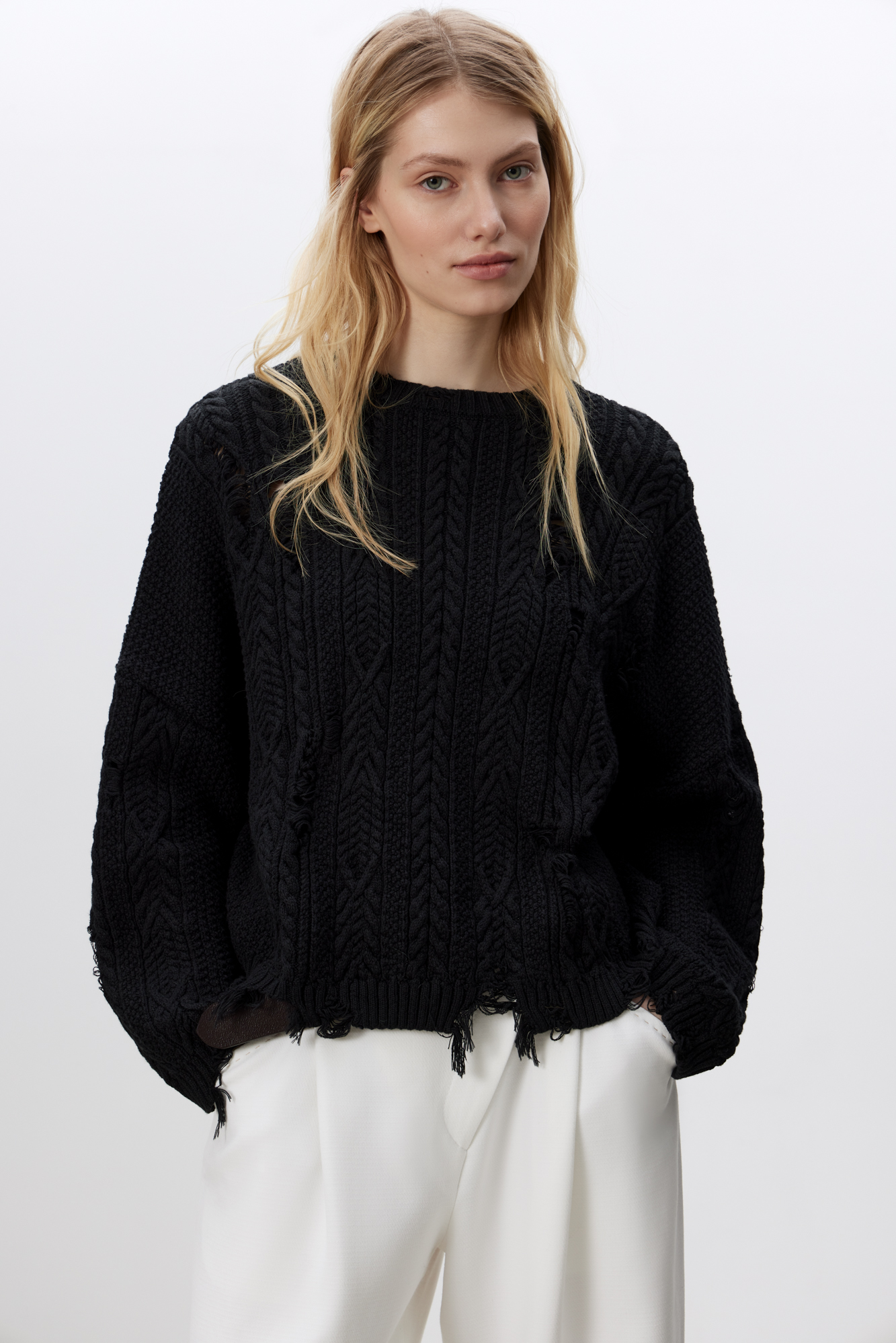Трикотажный джемпер из вискозы с добавлением хлопка. Длинные рукава, круглый вырез, разрезы по всему изделию в стиле гранж.