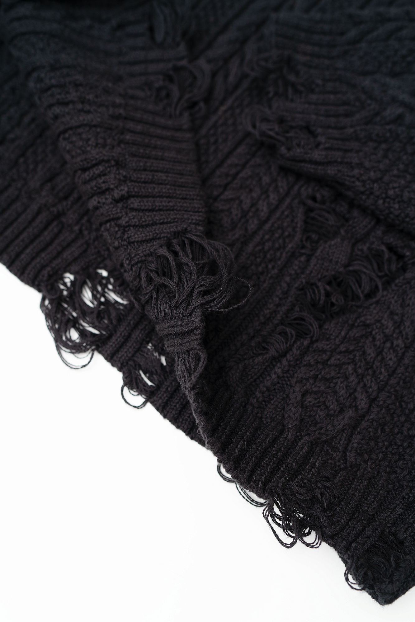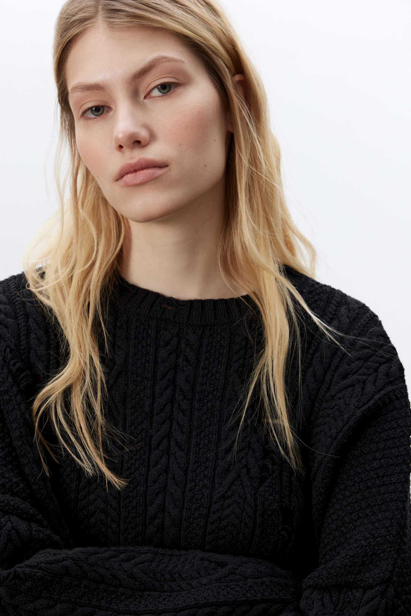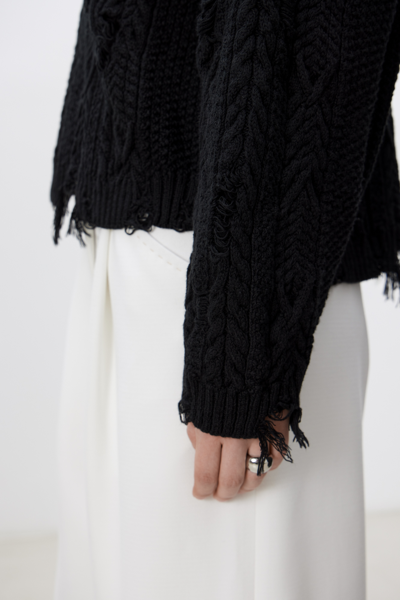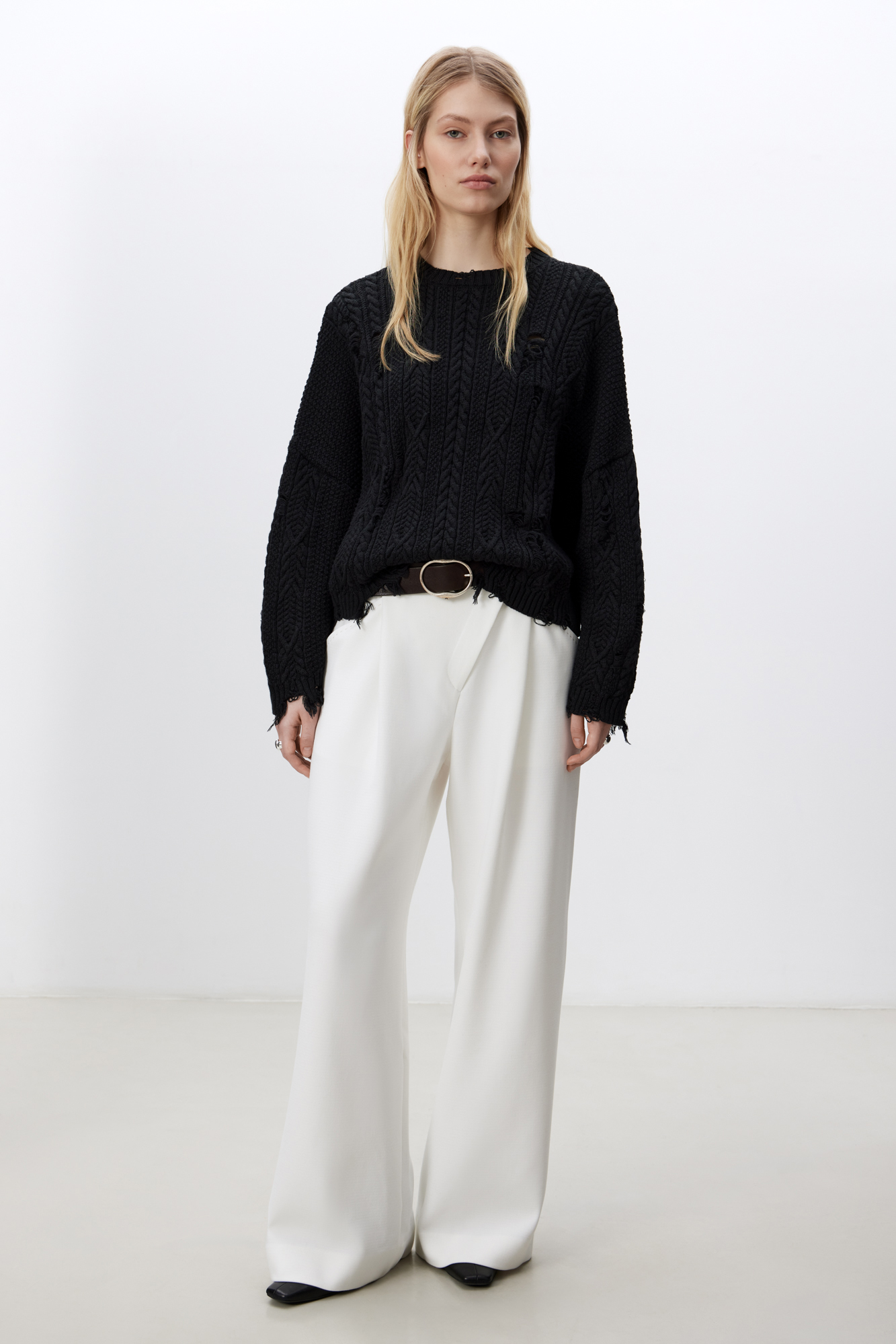 Трикотажный джемпер из вискозы с добавлением хлопка. Длинные рукава, круглый вырез, разрезы по всему изделию в стиле гранж.