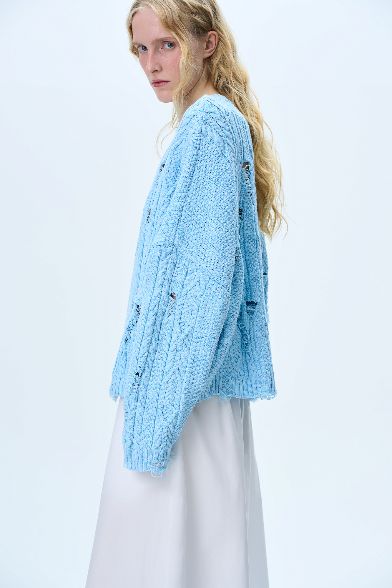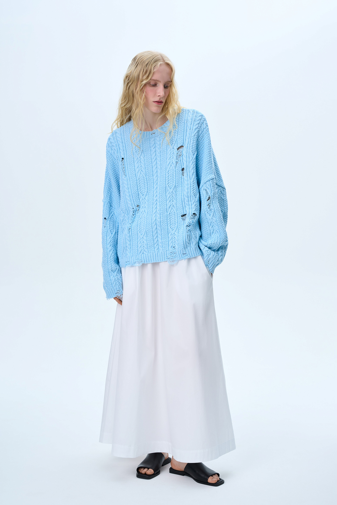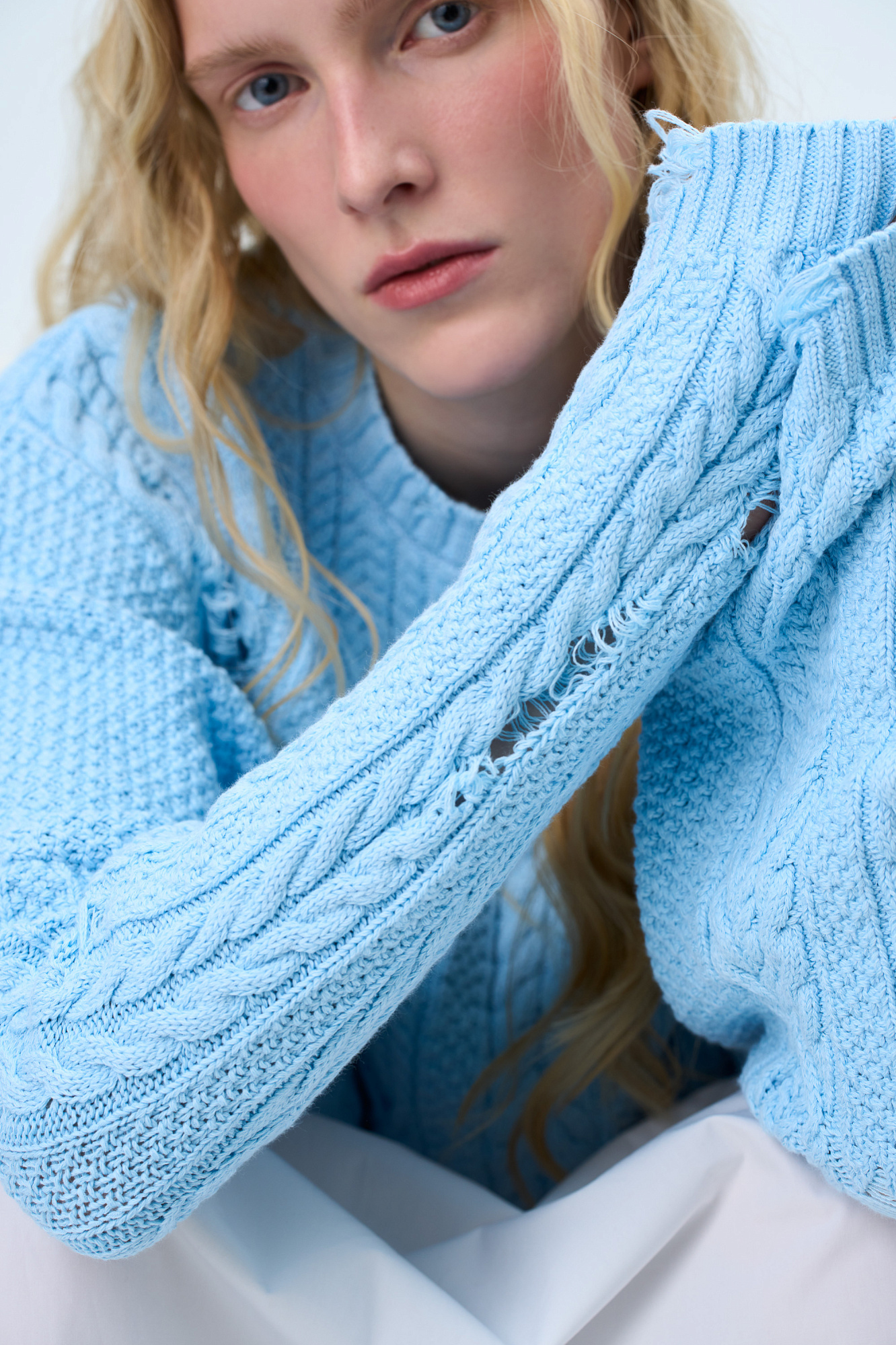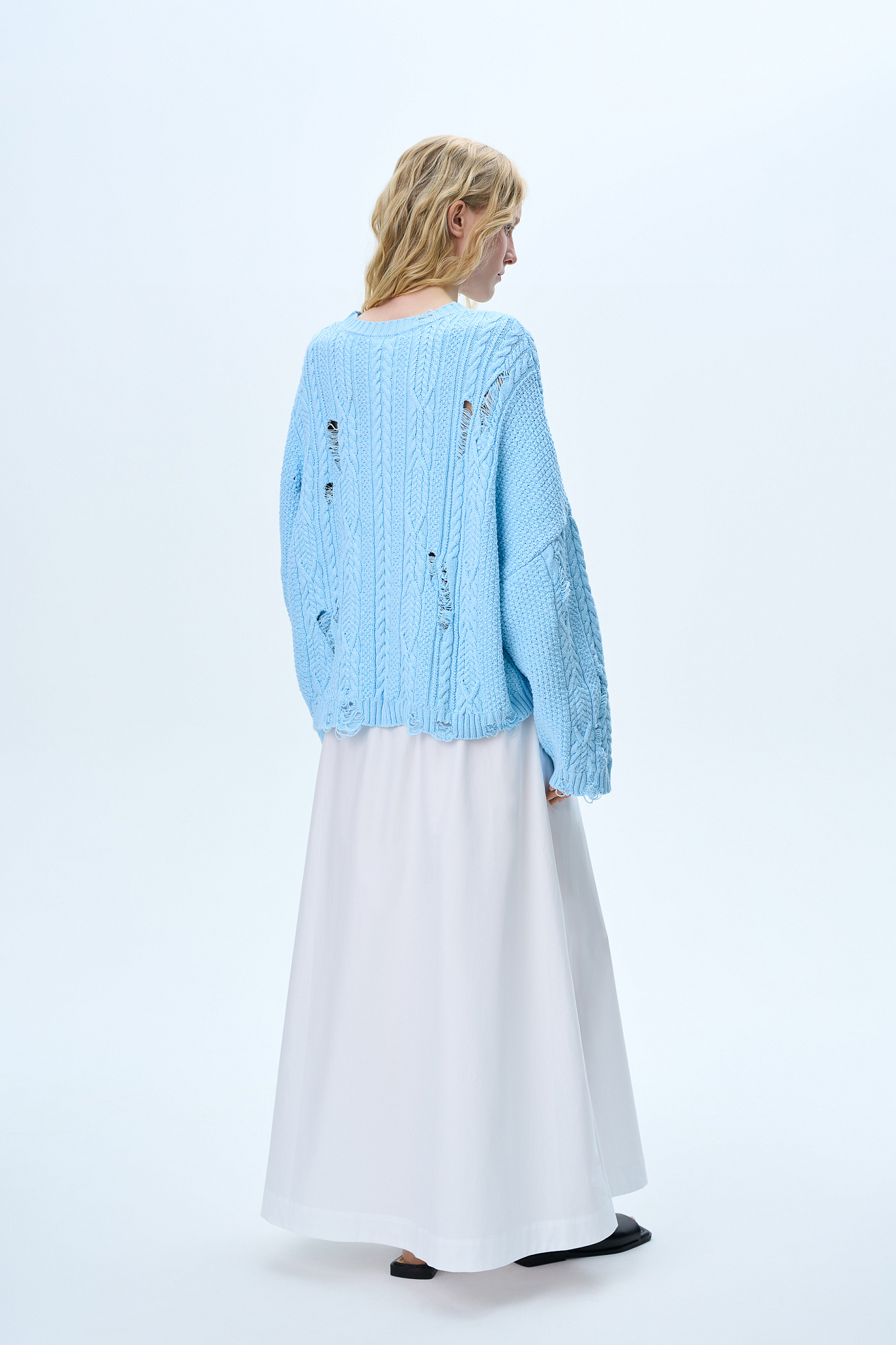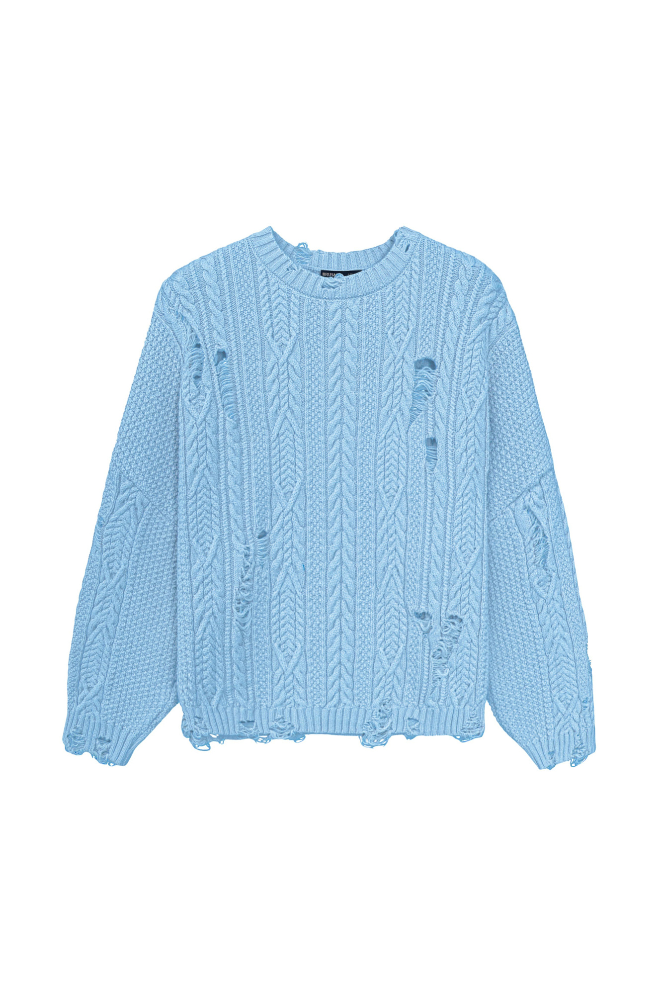 Трикотажный джемпер из вискозы с добавлением хлопка. Длинные рукава, круглый вырез, разрезы по всему изделию в стиле гранж.
