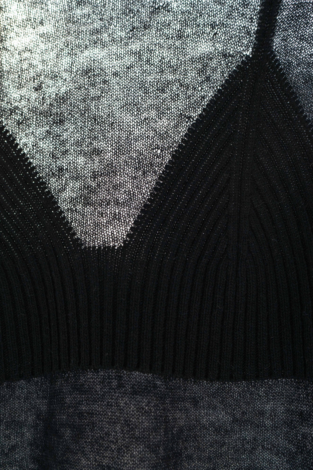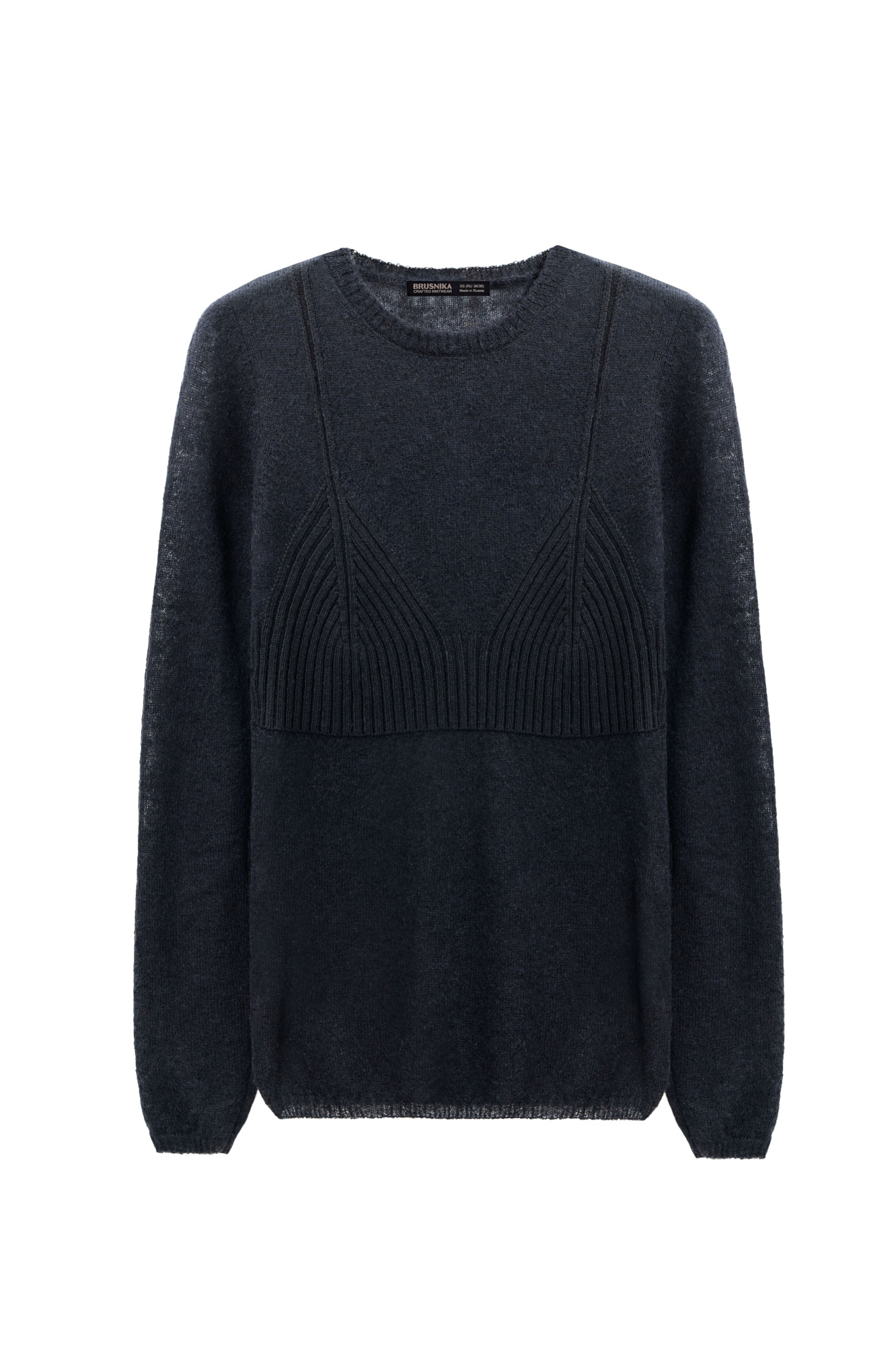 Тонкий трикотажный джемпер из шерсти мериноса экстрафайн и альпака суперфайн. Модель по фигуре с круглым вырезом горловины и длинными рукавами. Изделие декорировано акцентной деталью в рубчик, имитирующей форму бюстье на тонких бретельках.