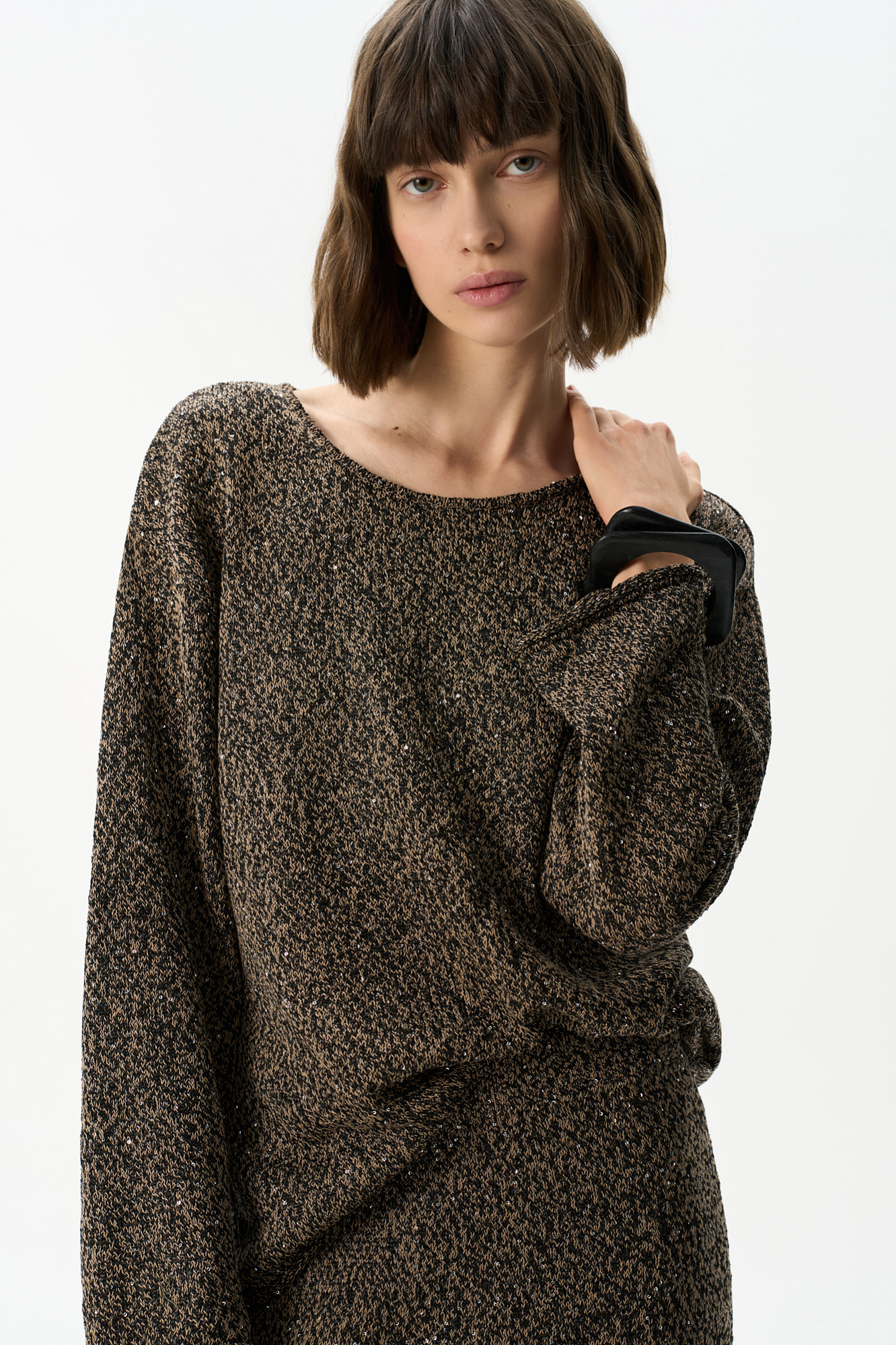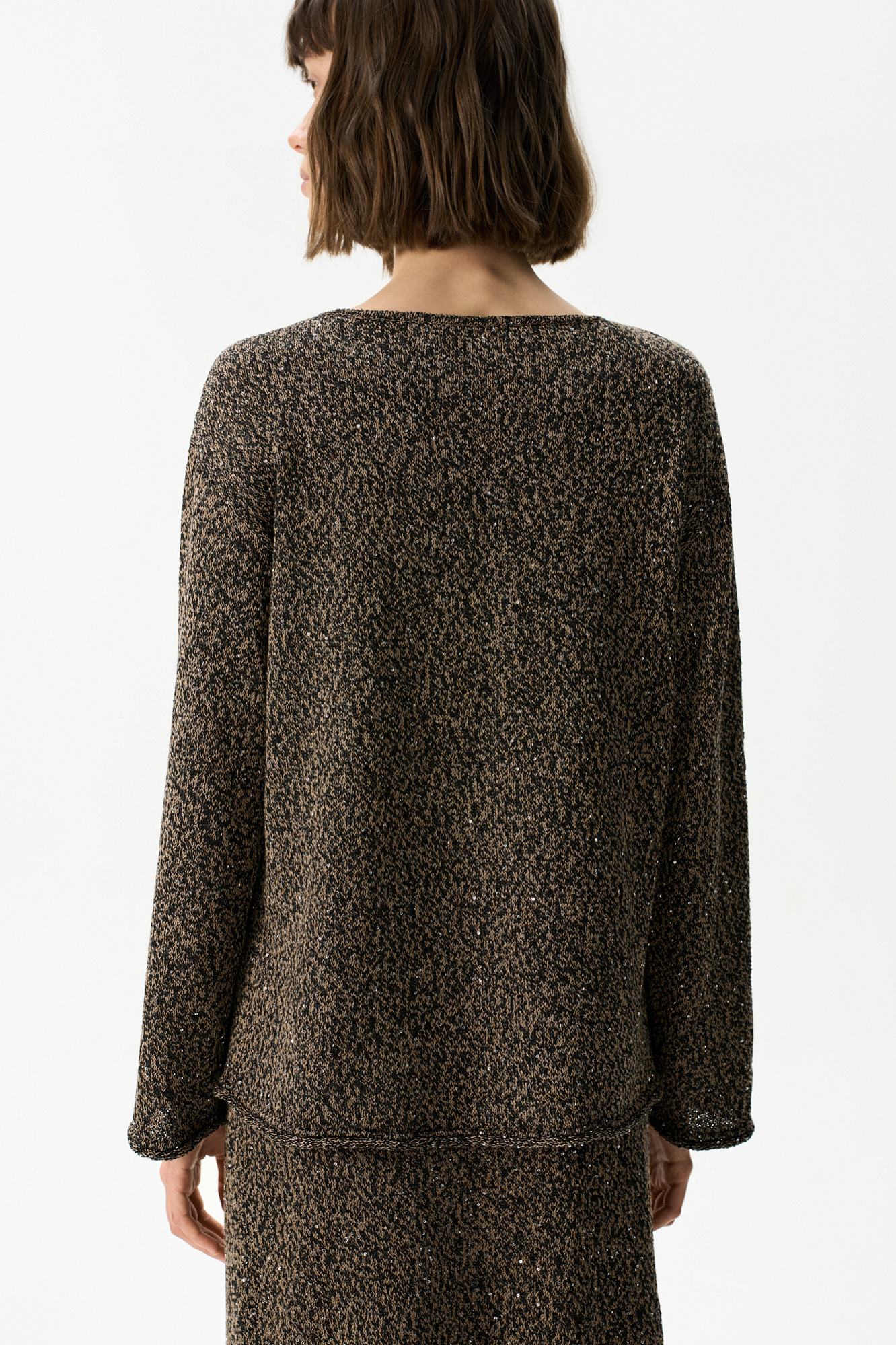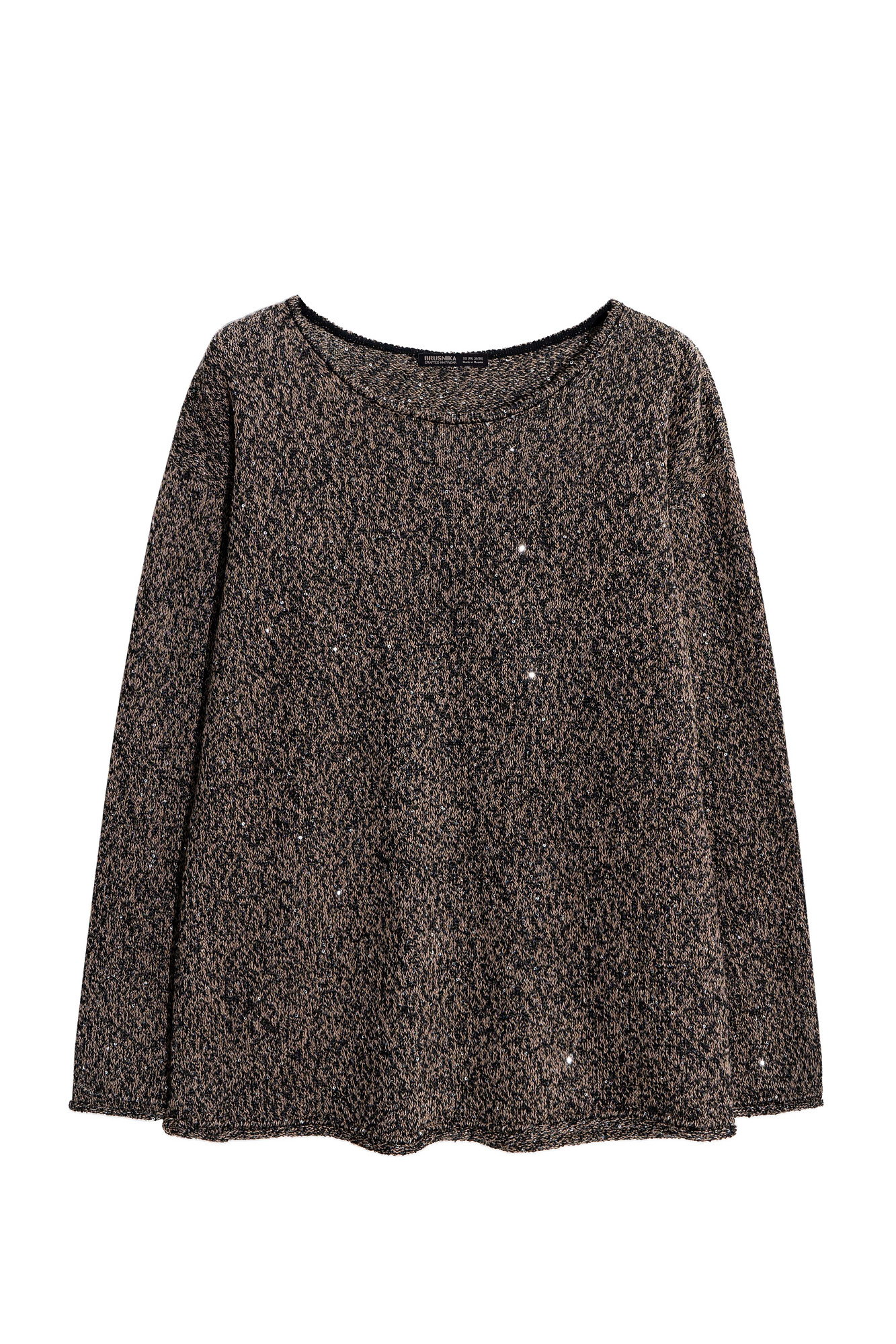 Трикотажный джемпер из хлопка с пайетками и люрексом. Модель свободного силуэта с длинными рукавами и круглым вырезом горловины.