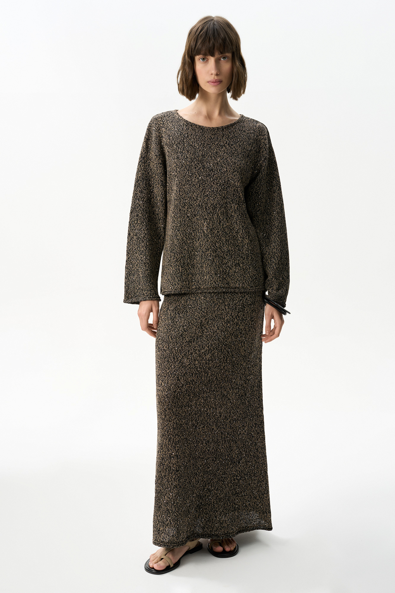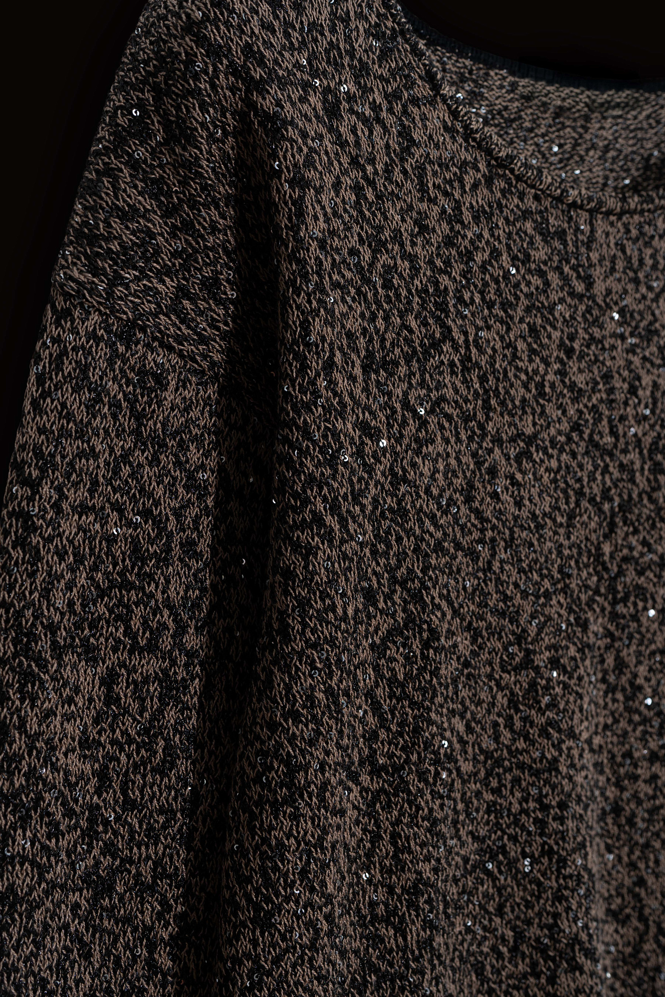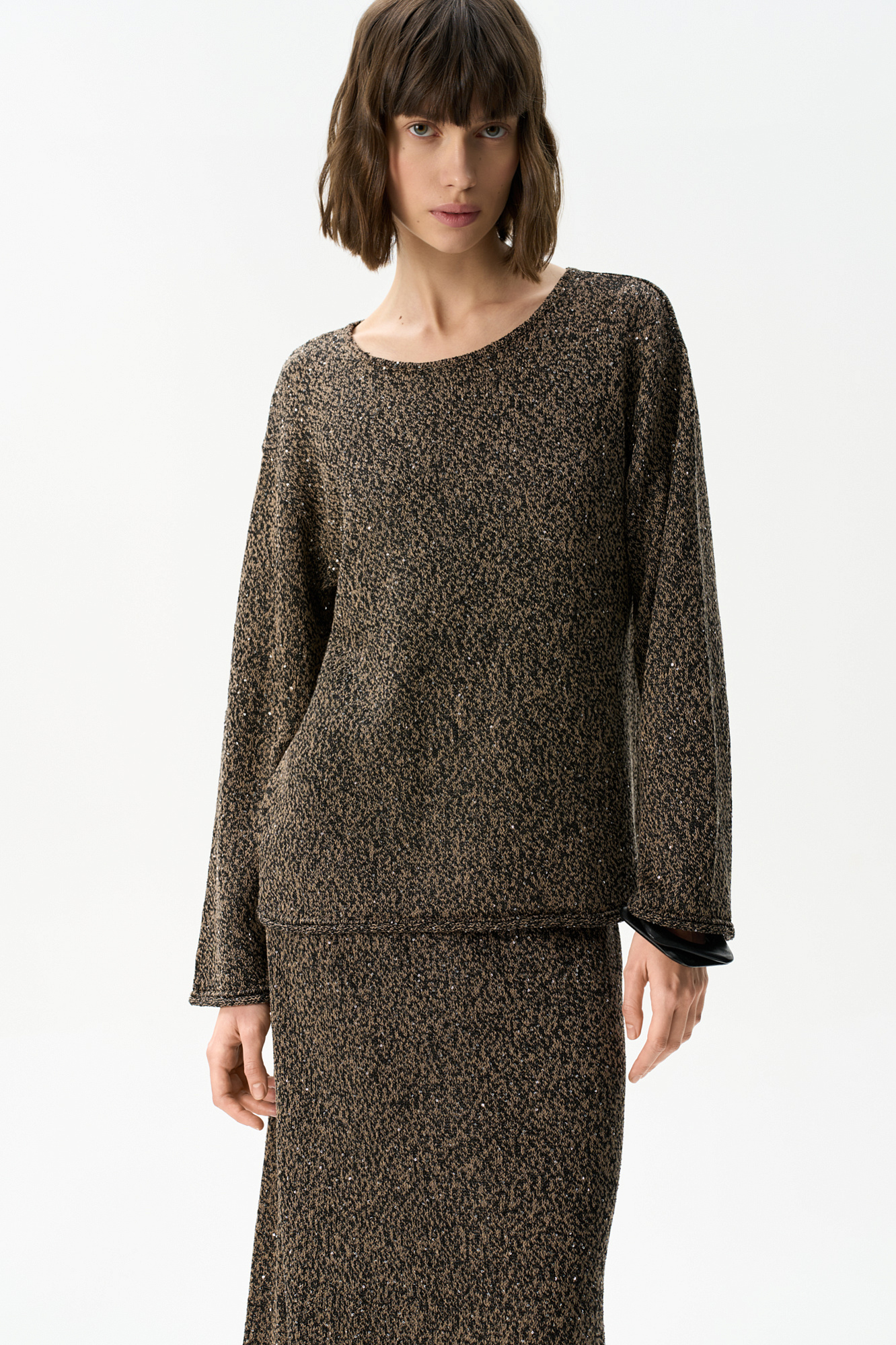Трикотажный джемпер из хлопка с пайетками и люрексом. Модель свободного силуэта с длинными рукавами и круглым вырезом горловины.